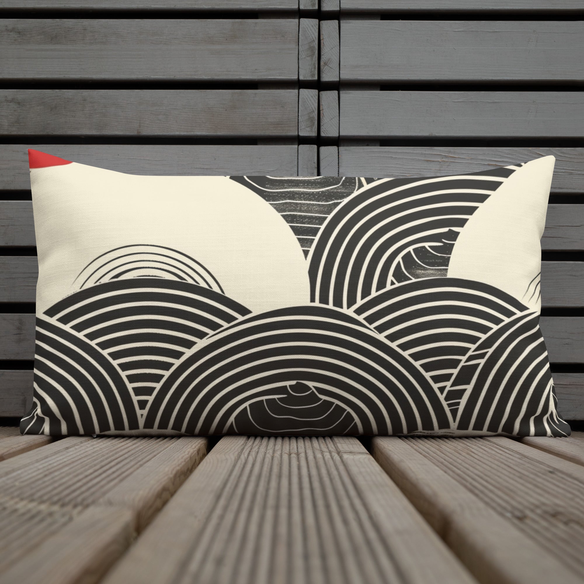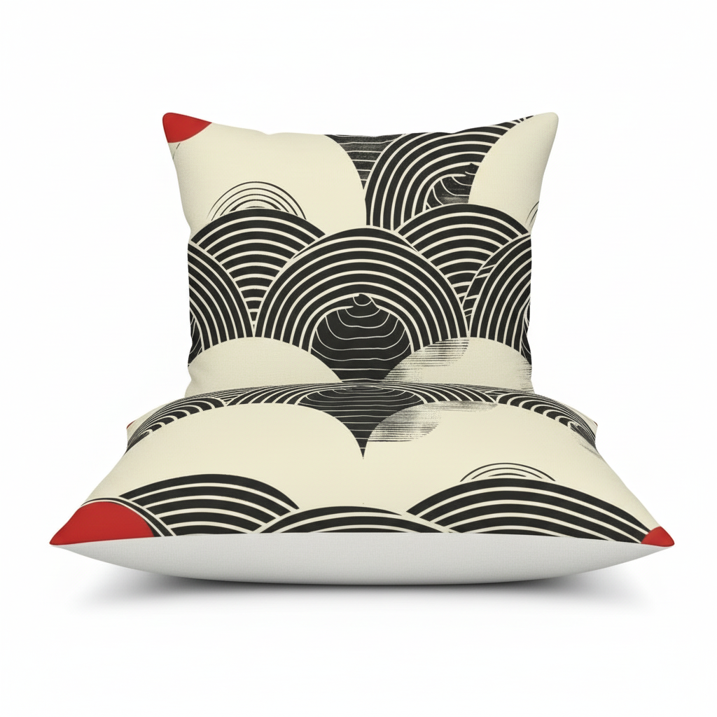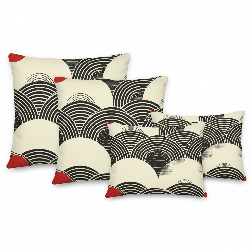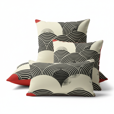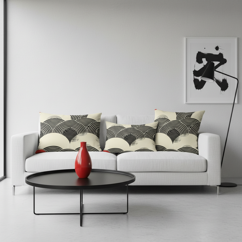Embrace the timeless elegance of Japanese artistry with our Wave Pattern Accent Pillow. This sophisticated design features traditional seigaiha (ocean wave) motifs in bold black and cream with striking red corner accents, creating a statement piece that honors Eastern aesthetics while fitting seamlessly into modern interiors.