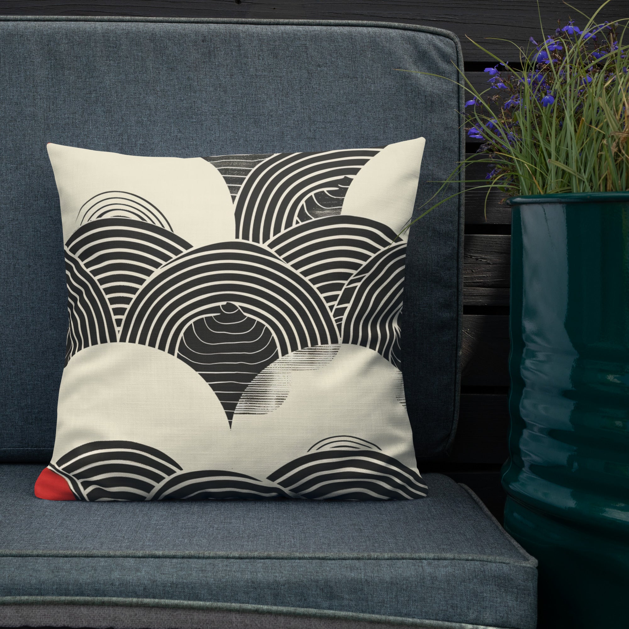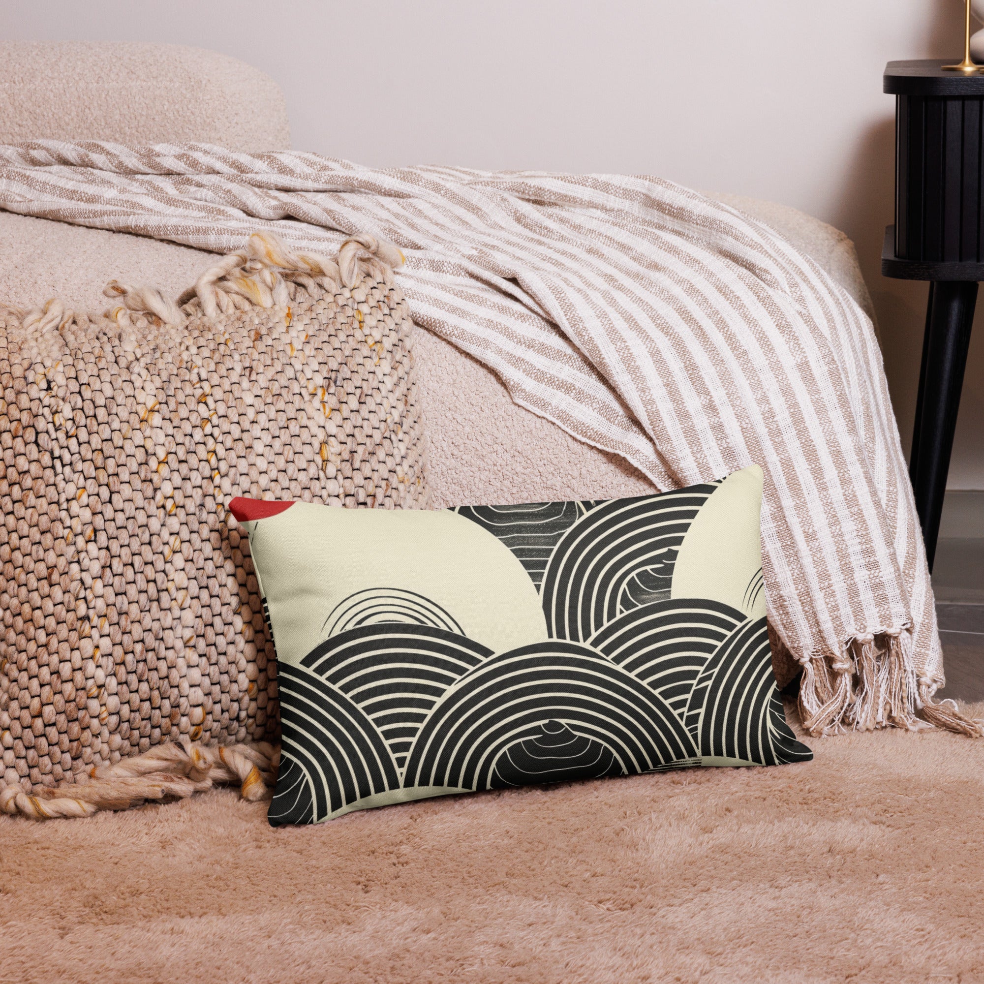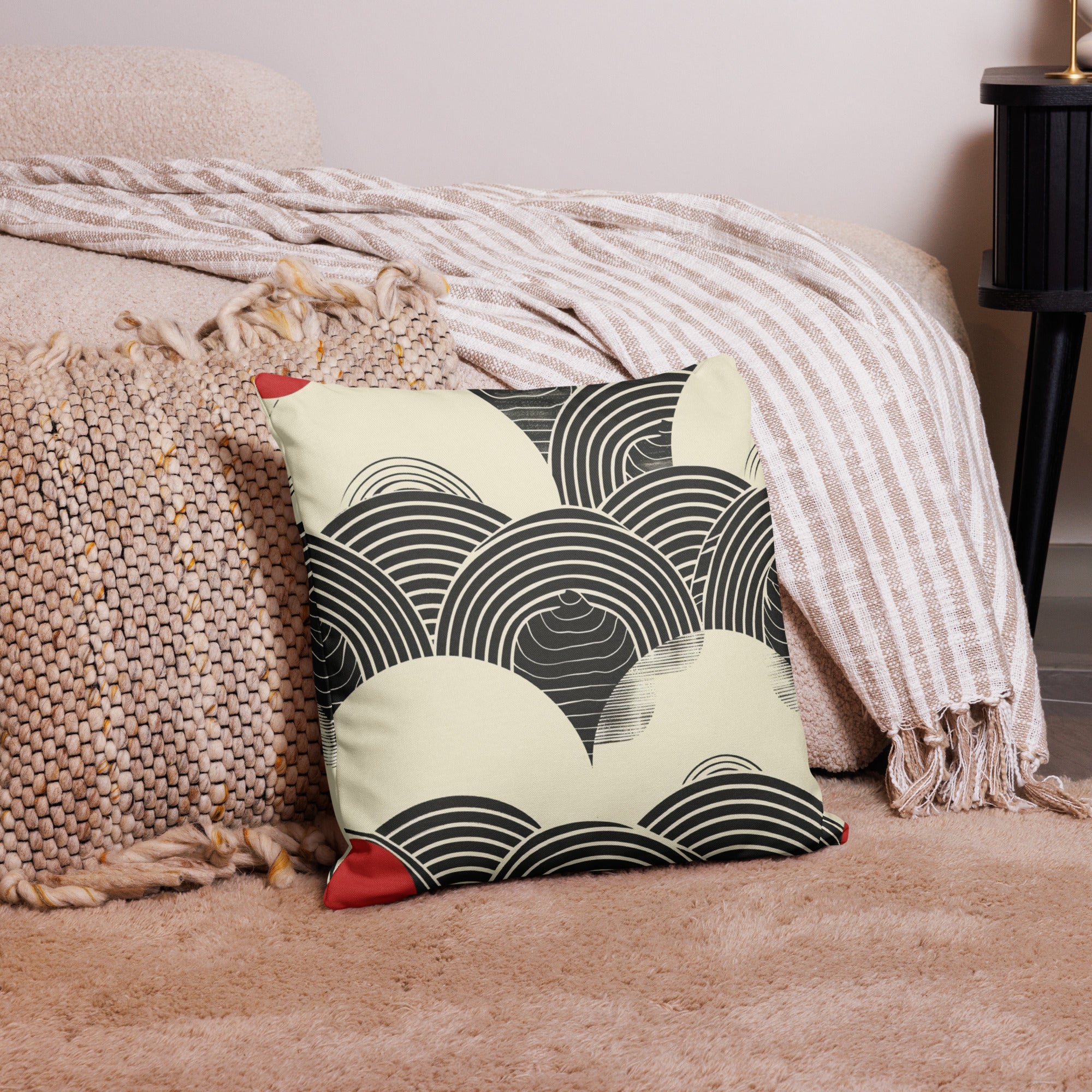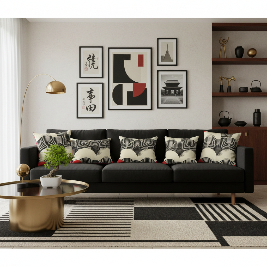 Embrace the timeless elegance of Japanese artistry with our Wave Pattern Accent Pillow. This sophisticated design features traditional seigaiha (ocean wave) motifs in bold black and cream with striking red corner accents, creating a statement piece that honors Eastern aesthetics while fitting seamlessly into modern interiors.