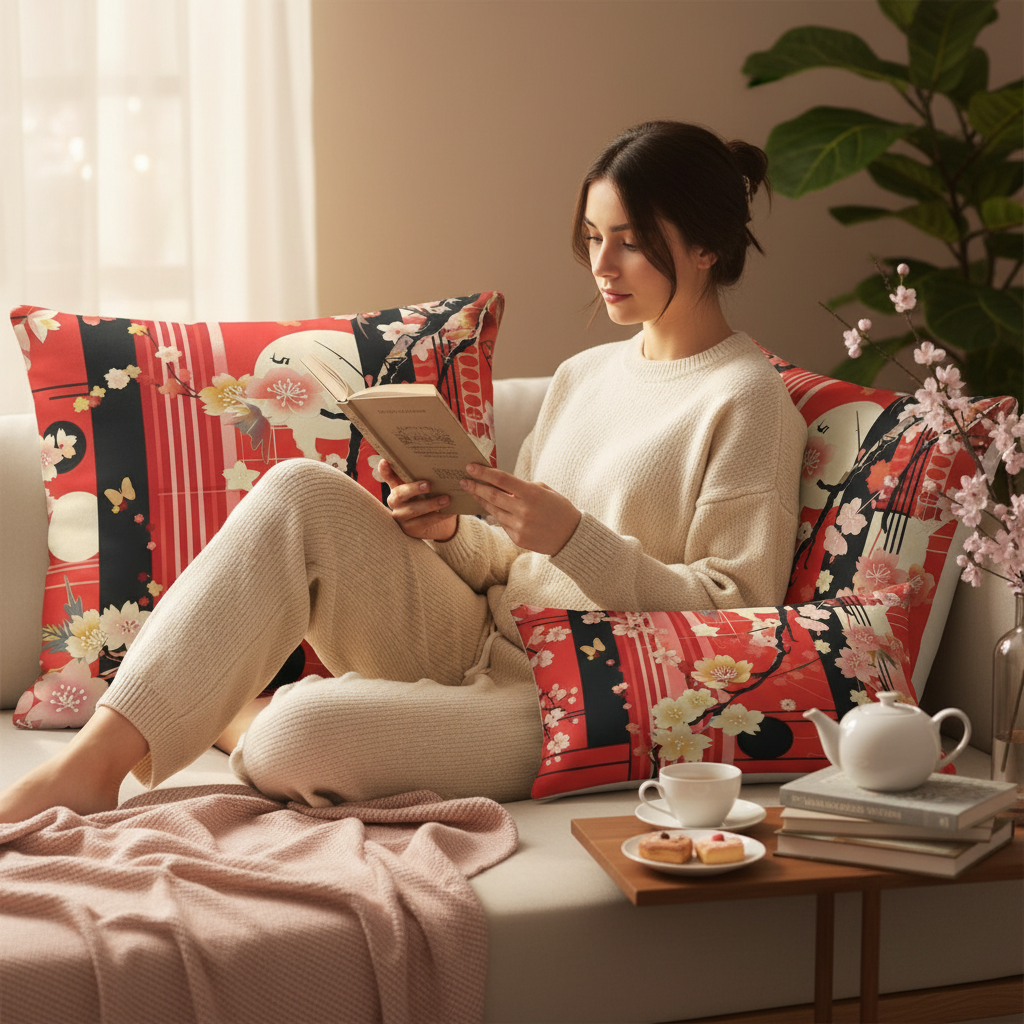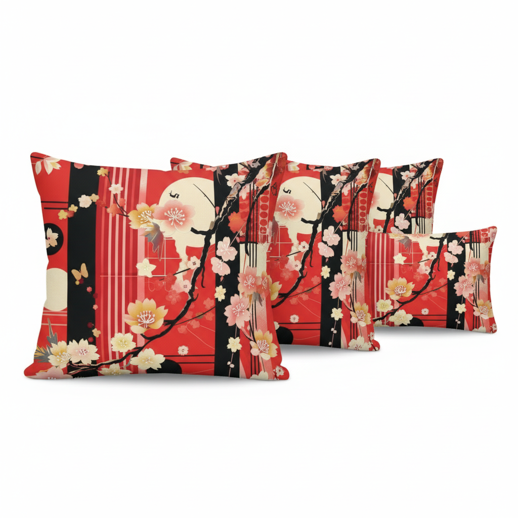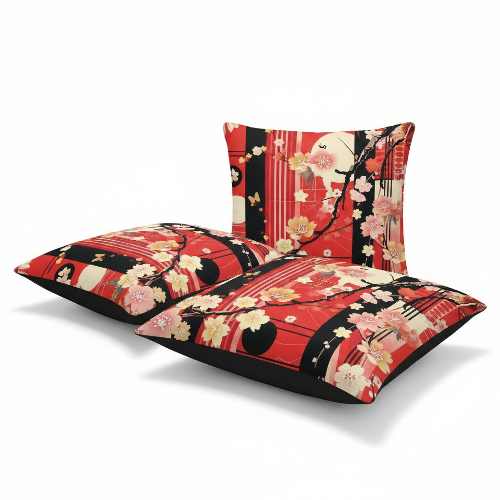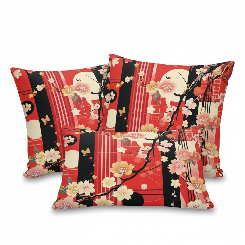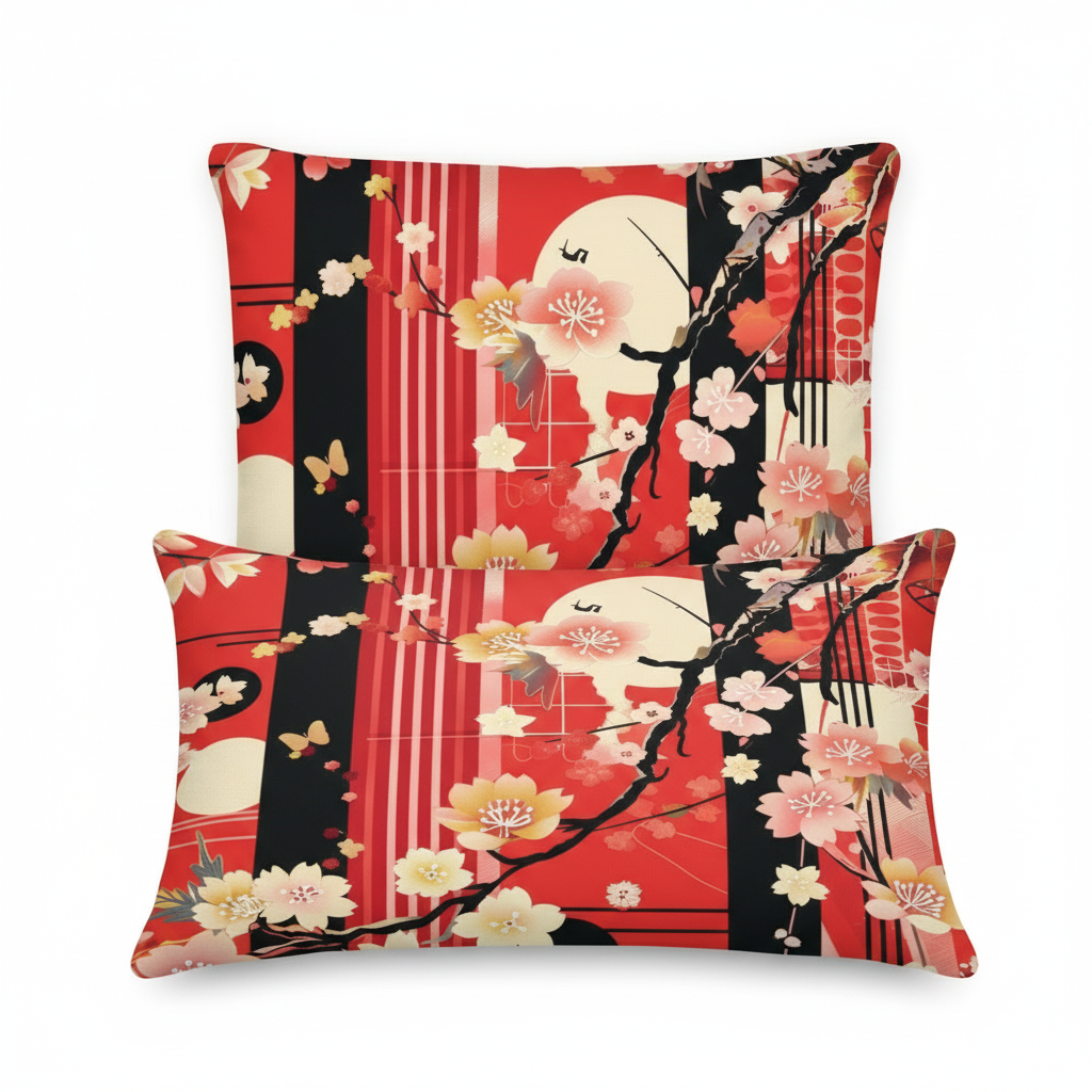 Embrace the timeless beauty of Japanese artistry with our Cherry Blossom Accent Pillow. This stunning design features delicate cherry blossoms, graceful branches, and geometric elements in vibrant red, black, pink, and cream, creating a bold statement piece that honors traditional Eastern aesthetics while fitting seamlessly into modern interiors.