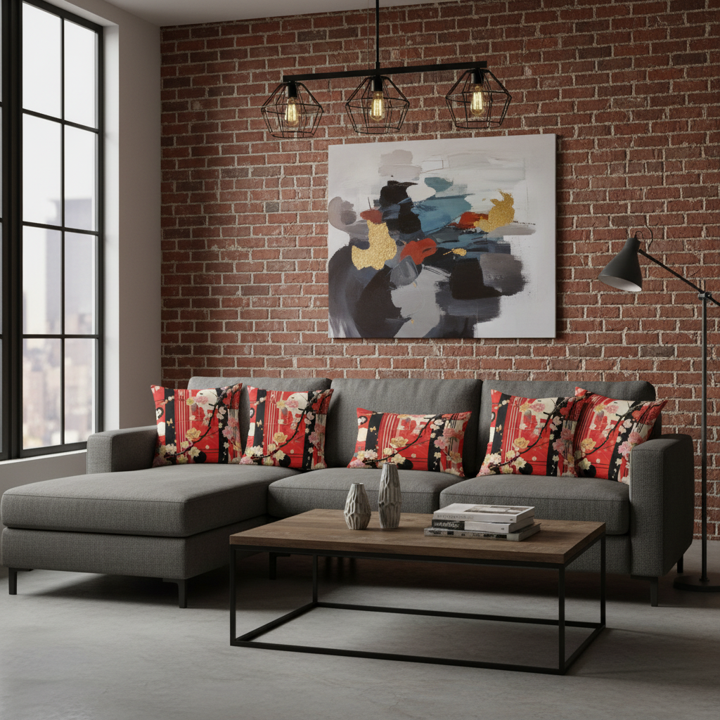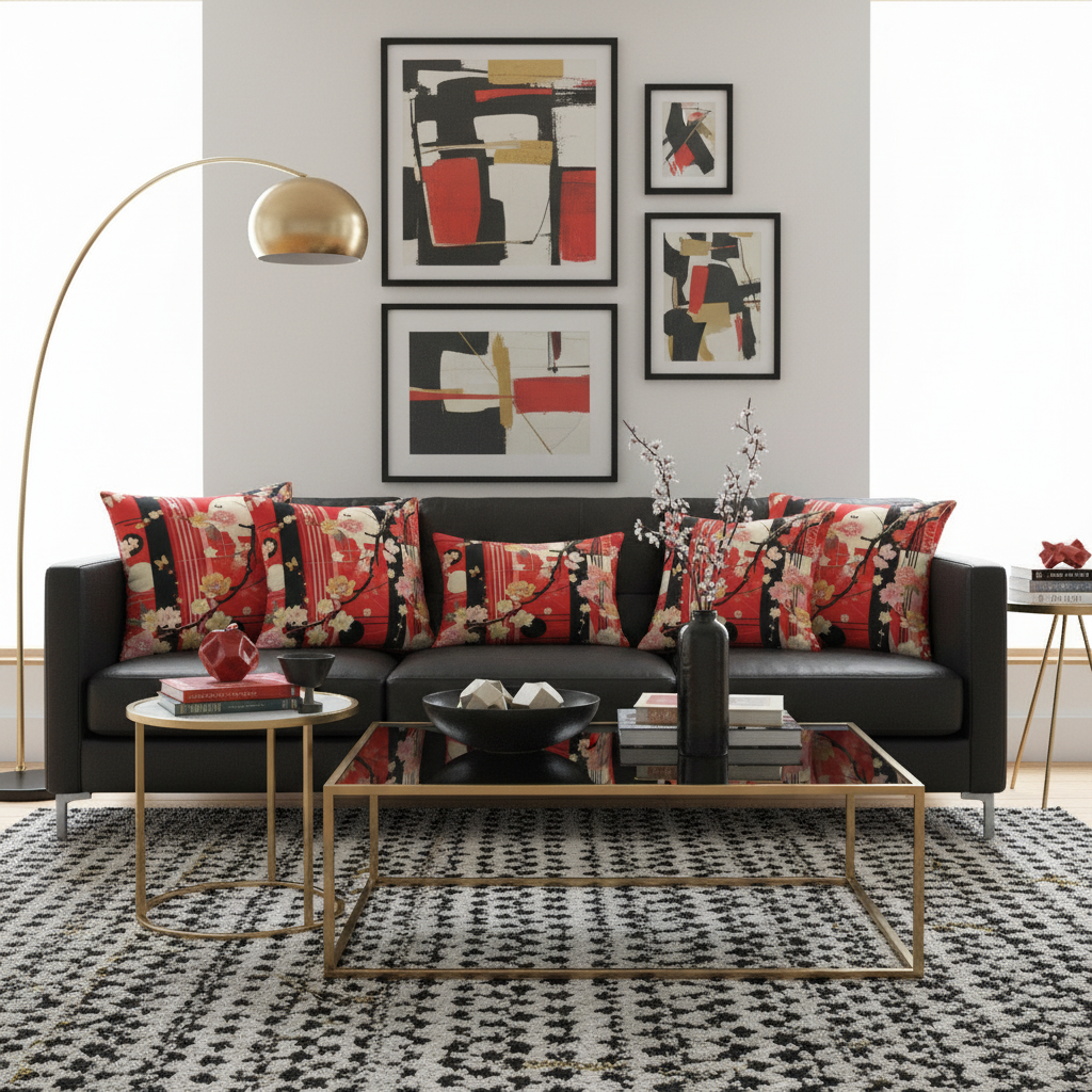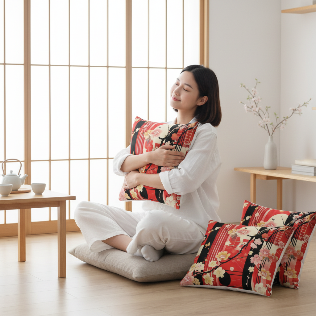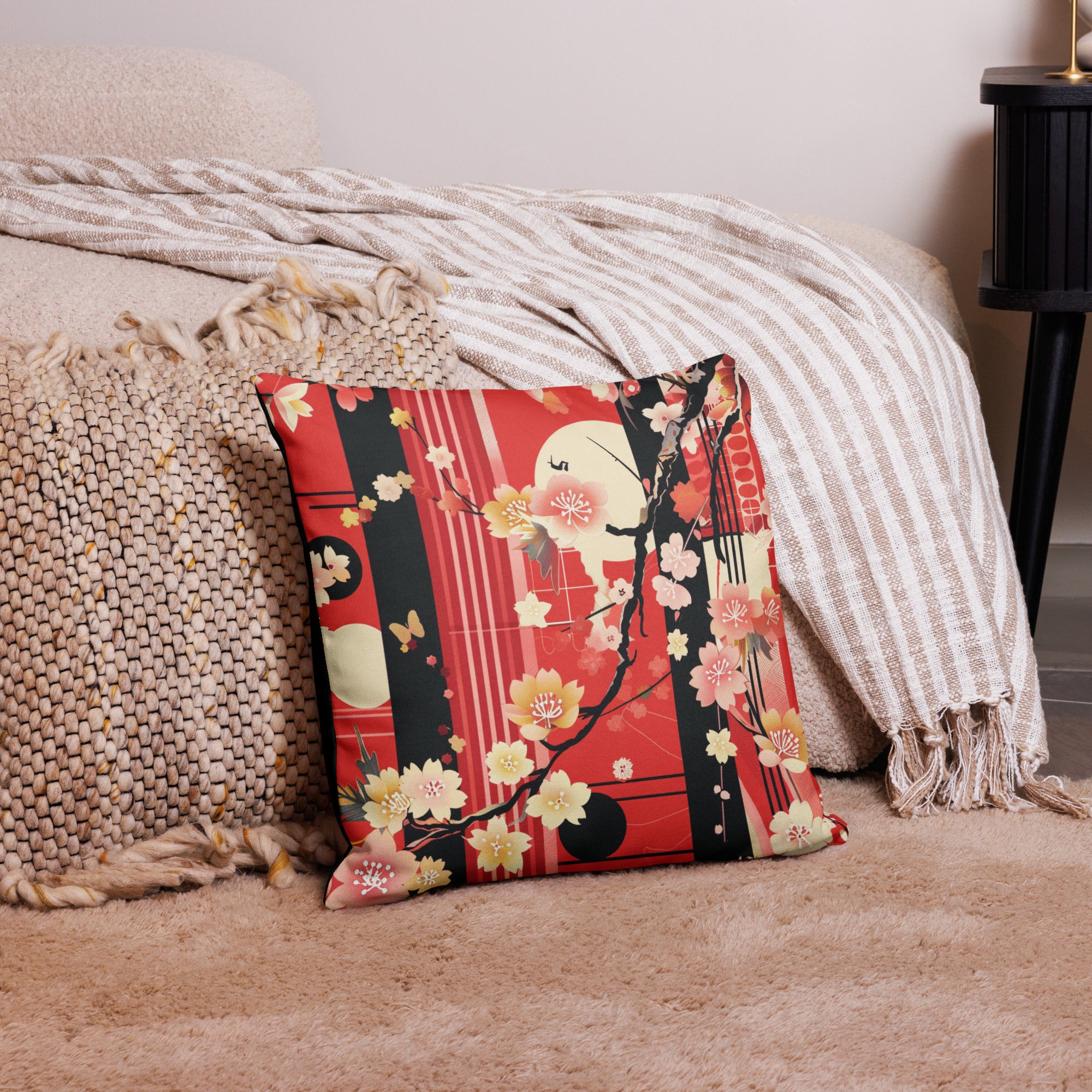 Embrace the timeless beauty of Japanese artistry with our Cherry Blossom Accent Pillow. This stunning design features delicate cherry blossoms, graceful branches, and geometric elements in vibrant red, black, pink, and cream, creating a bold statement piece that honors traditional Eastern aesthetics while fitting seamlessly into modern interiors.