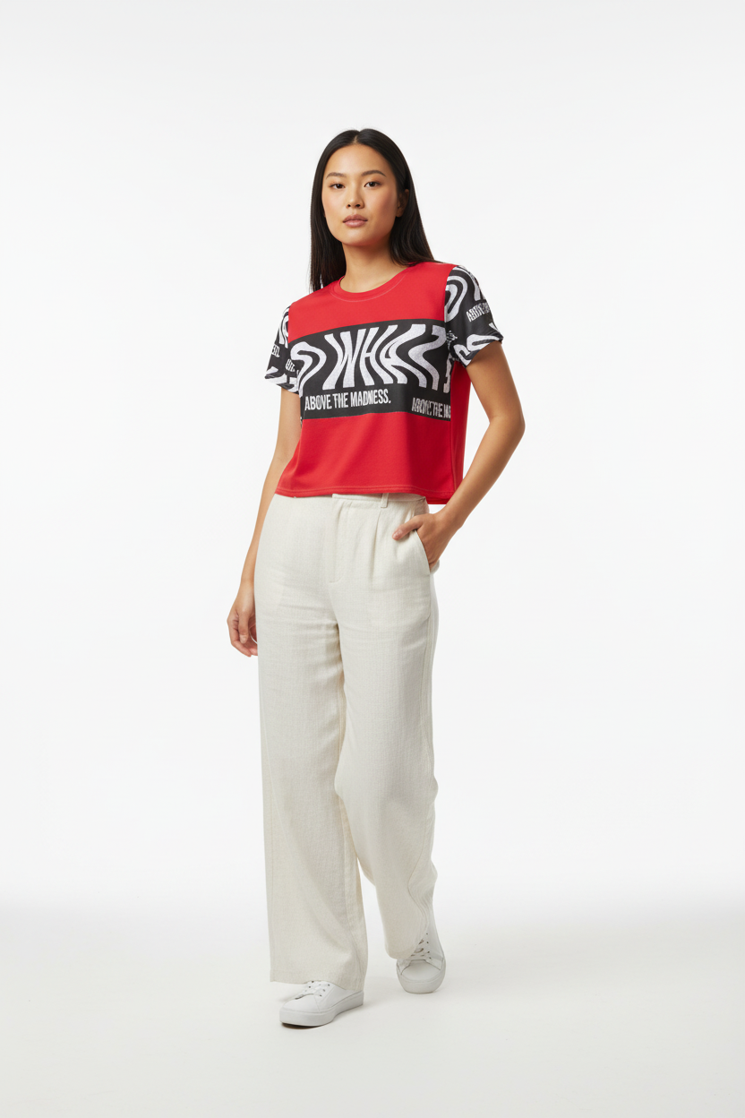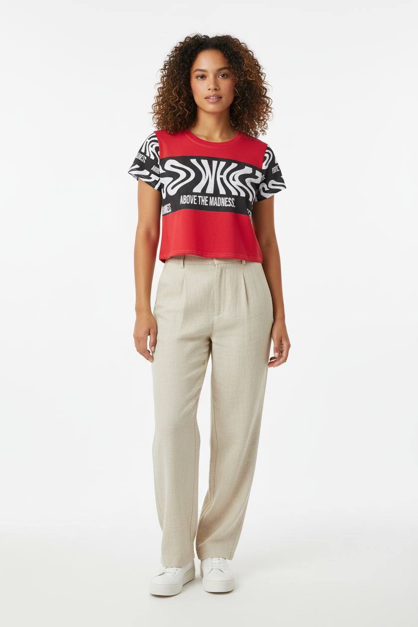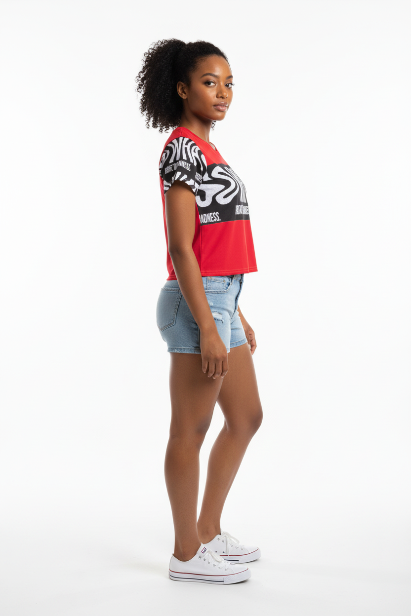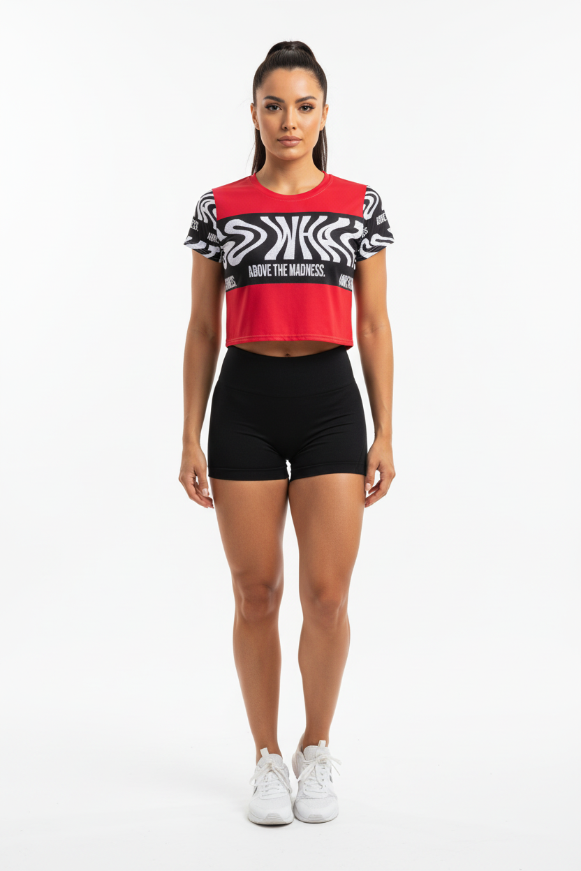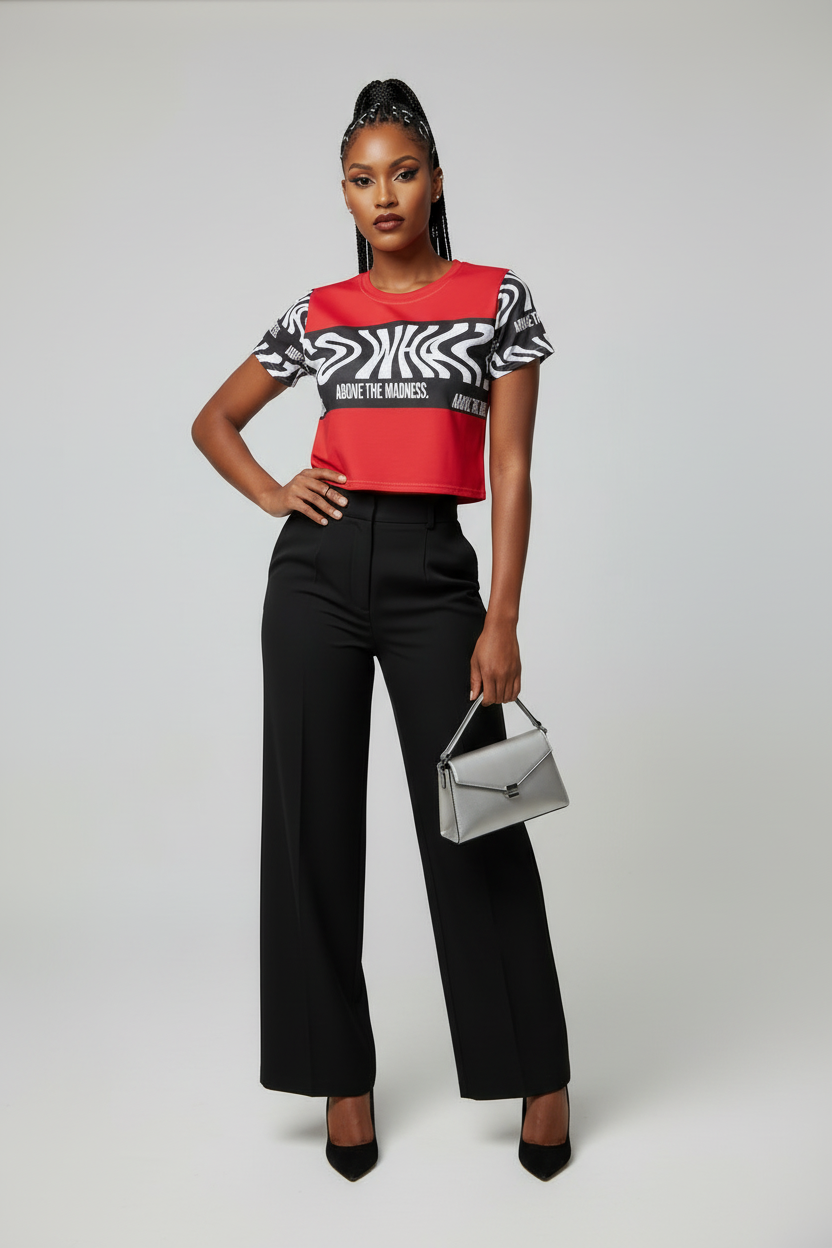 Make a bold statement with the Above the Madness Crop Tee. Featuring a striking red and black zebra print design with eye-catching graphics, this crop tee is perfect for those who dare to stand out and express their unique style.