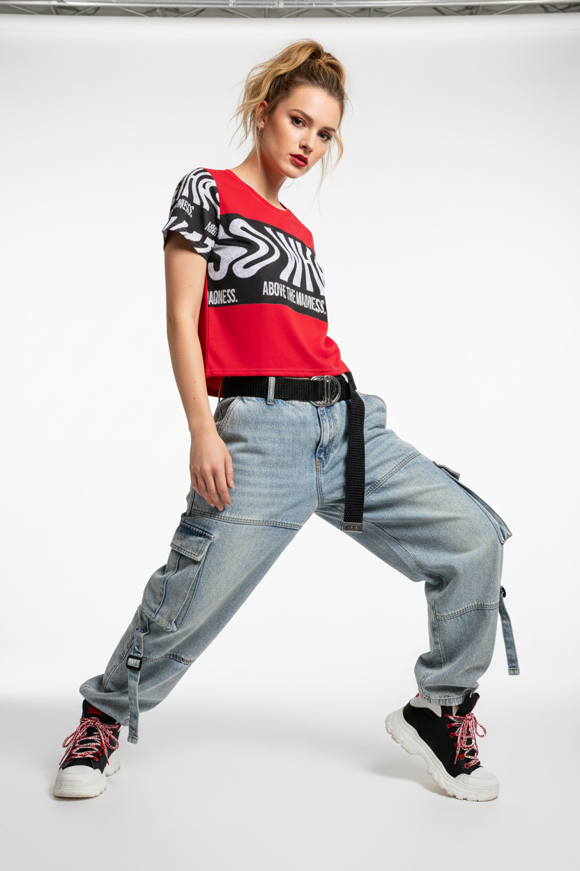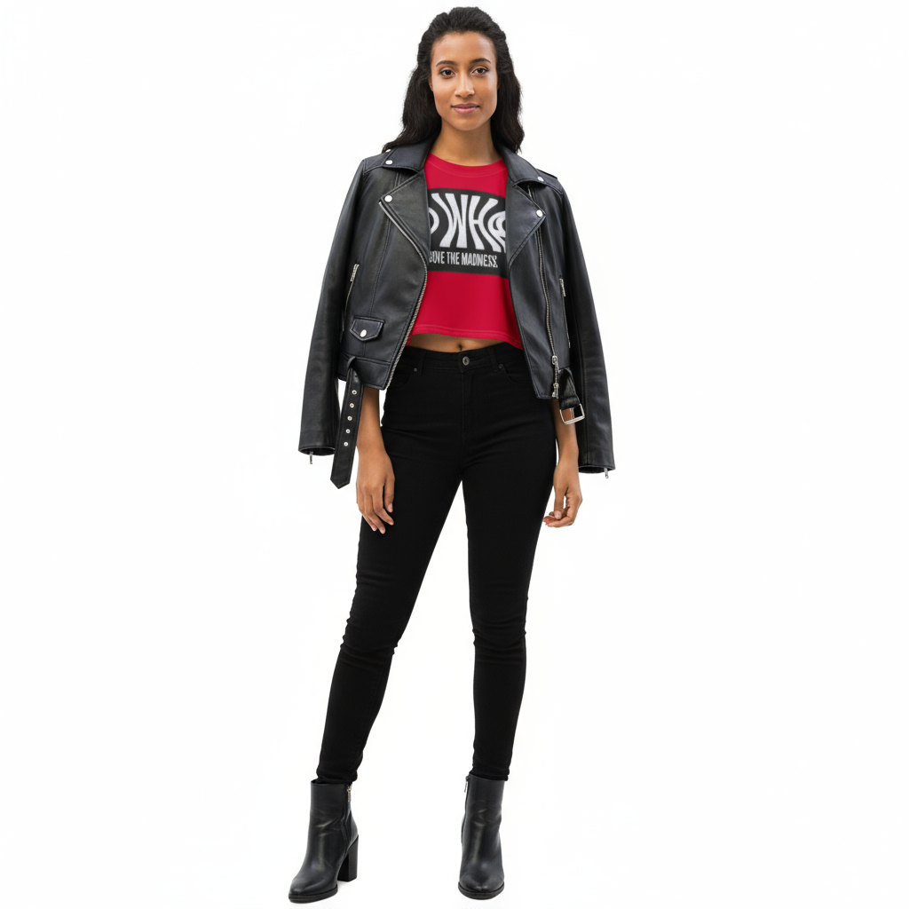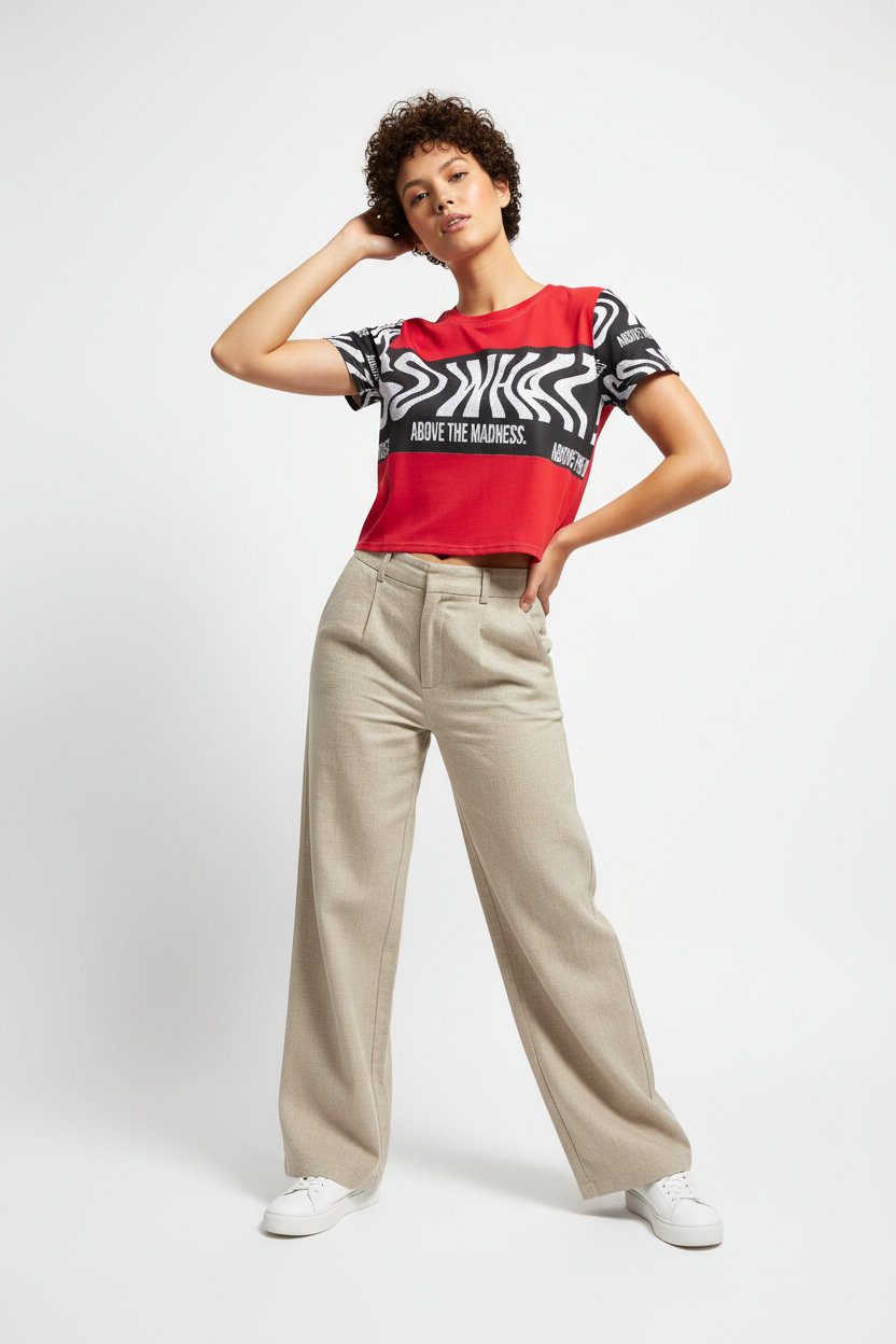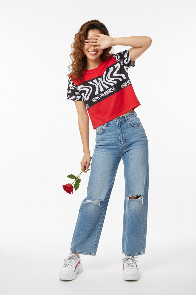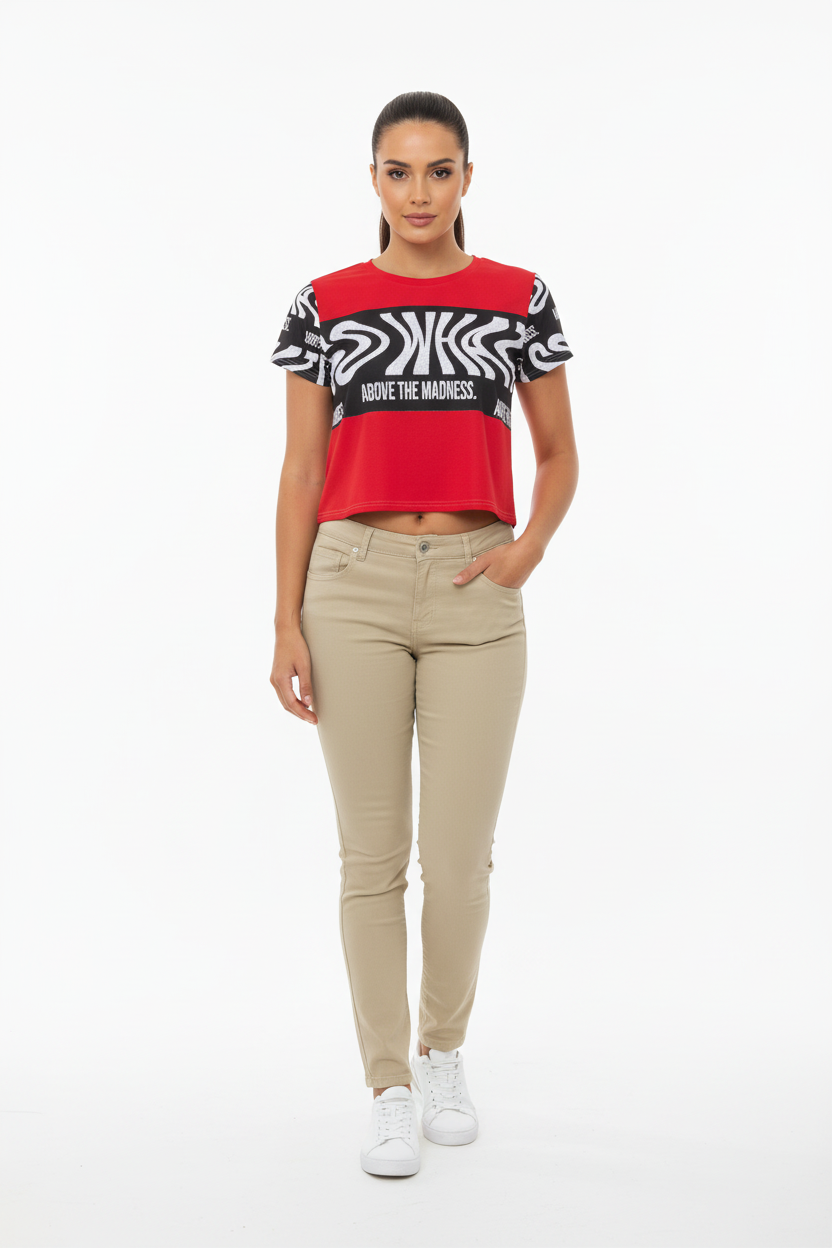 Make a bold statement with the Above the Madness Crop Tee. Featuring a striking red and black zebra print design with eye-catching graphics, this crop tee is perfect for those who dare to stand out and express their unique style.