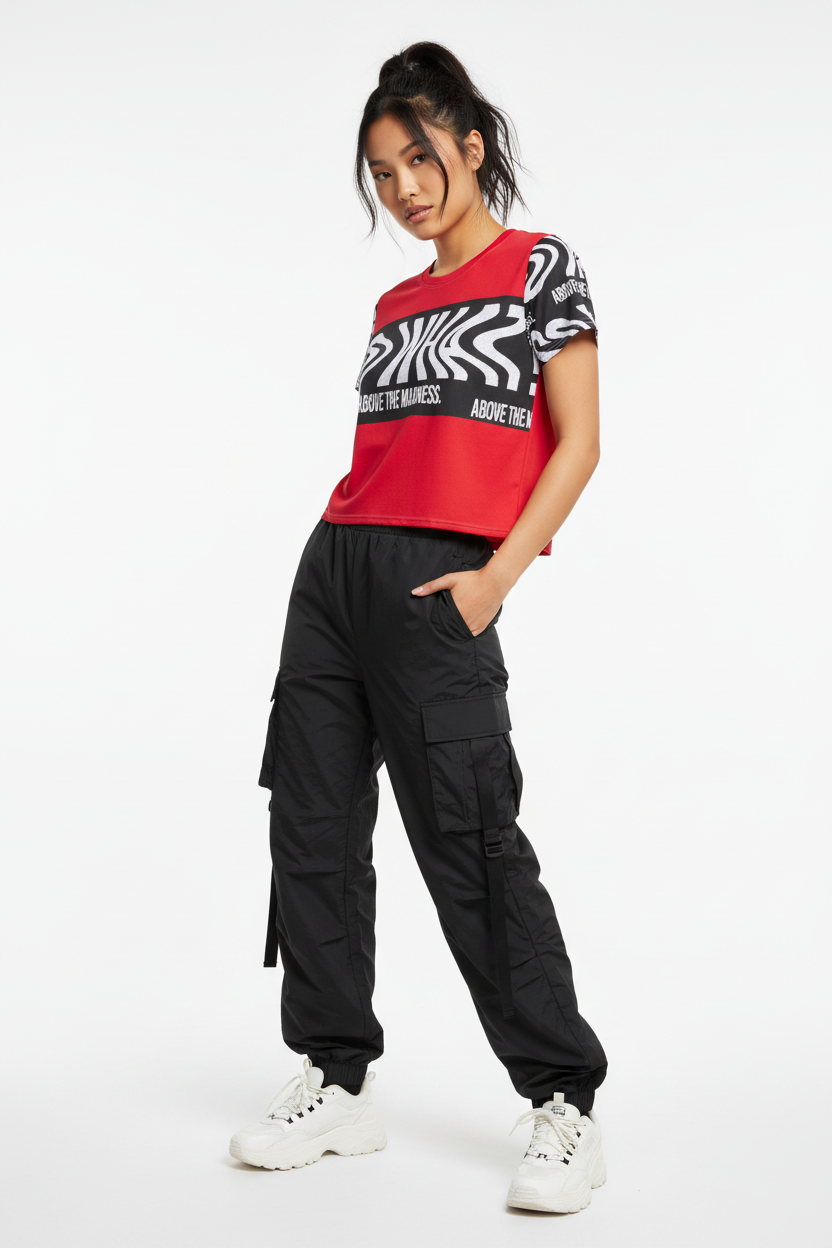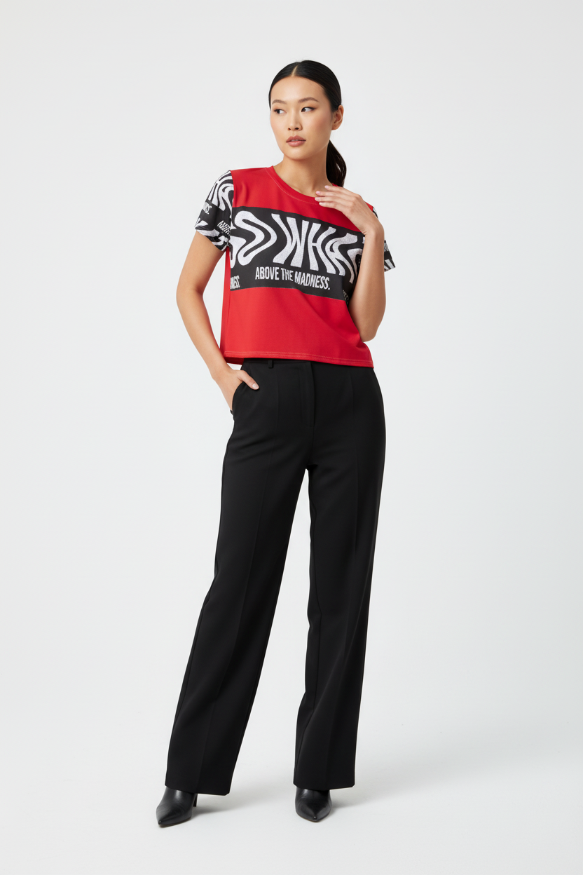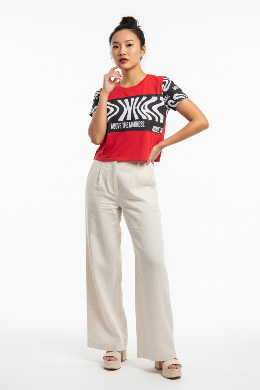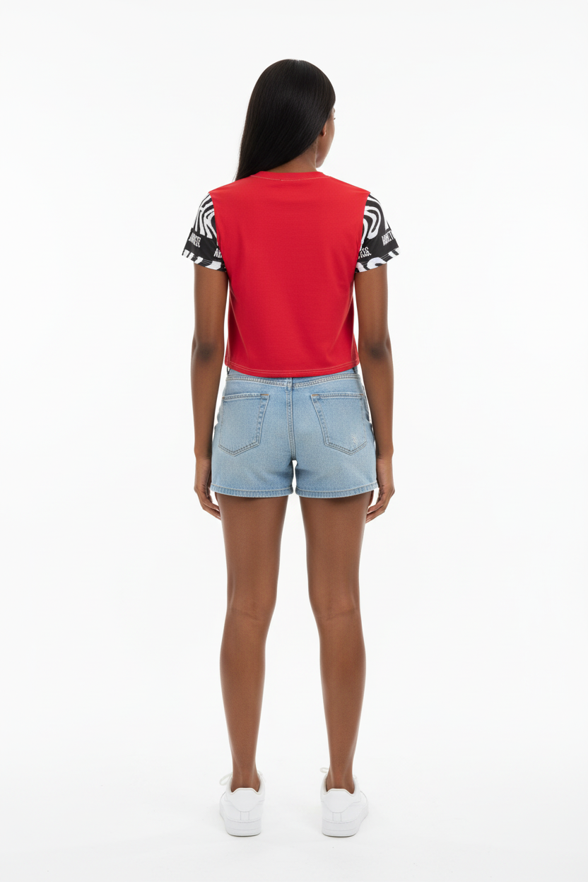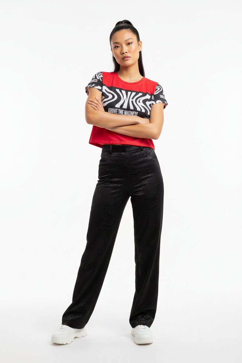 Make a bold statement with the Above the Madness Crop Tee. Featuring a striking red and black zebra print design with eye-catching graphics, this crop tee is perfect for those who dare to stand out and express their unique style.