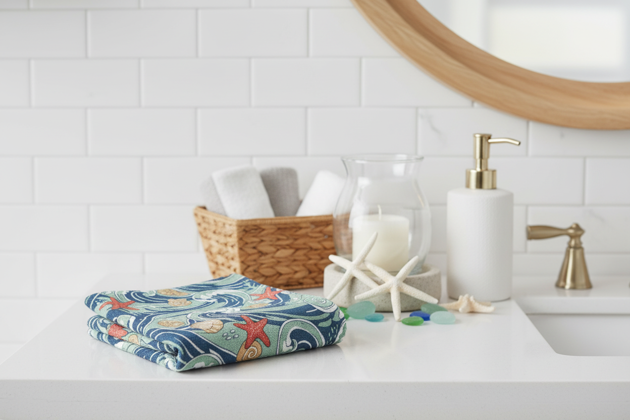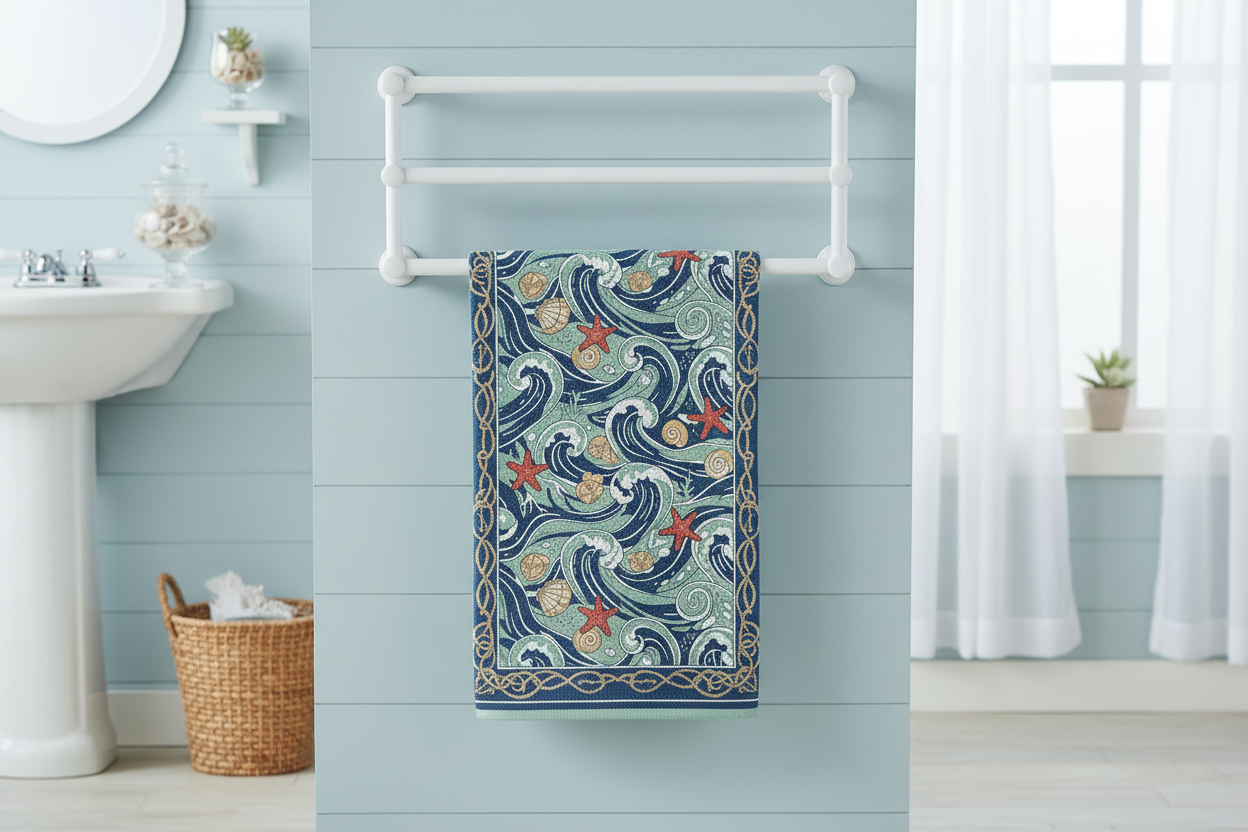 Whether you're elevating your guest bathroom, adding a coastal accent to your kitchen, or creating a spa-like atmosphere, this hand towel delivers both beauty and performance. The artistic ocean wave design transforms a practical essential into a statement piece that celebrates your love for the sea.