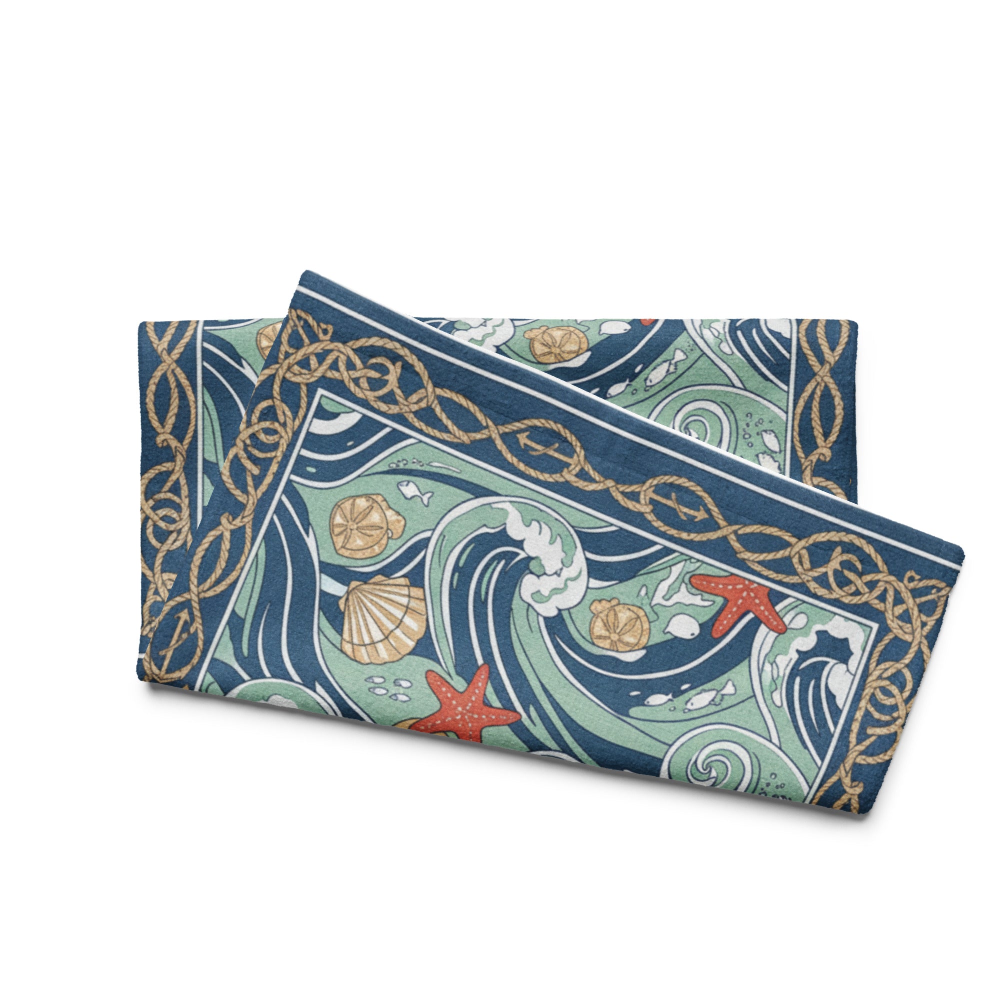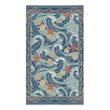 The Alppeer Ocean Waves Hand Towel brings the beauty of the sea to your daily routine. Featuring an intricate ocean wave pattern with swirling navy and seafoam green waters, coral starfish, golden seashells, and delicate marine details framed by a nautical rope border, this hand towel is a stunning blend of art and function.