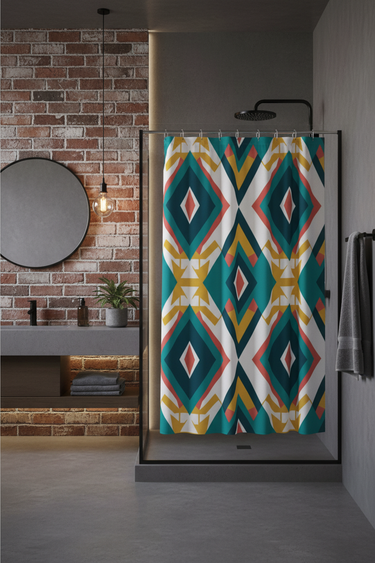 Elevate your bathroom into a vibrant retreat with the Desert Diamond geometric shower curtain. Featuring a striking southwestern-inspired pattern of teal, coral, yellow, and navy in bold diamond and chevron motifs, this statement piece instantly adds personality and style to any bathroom.