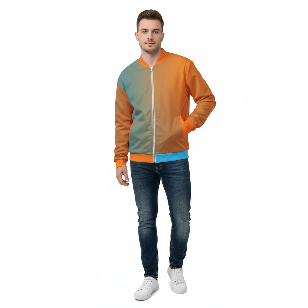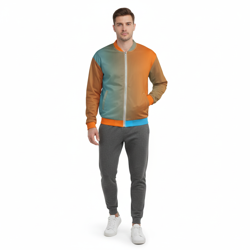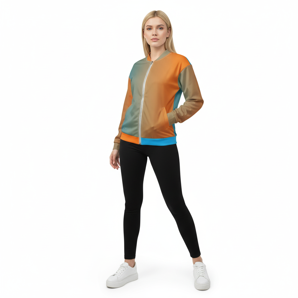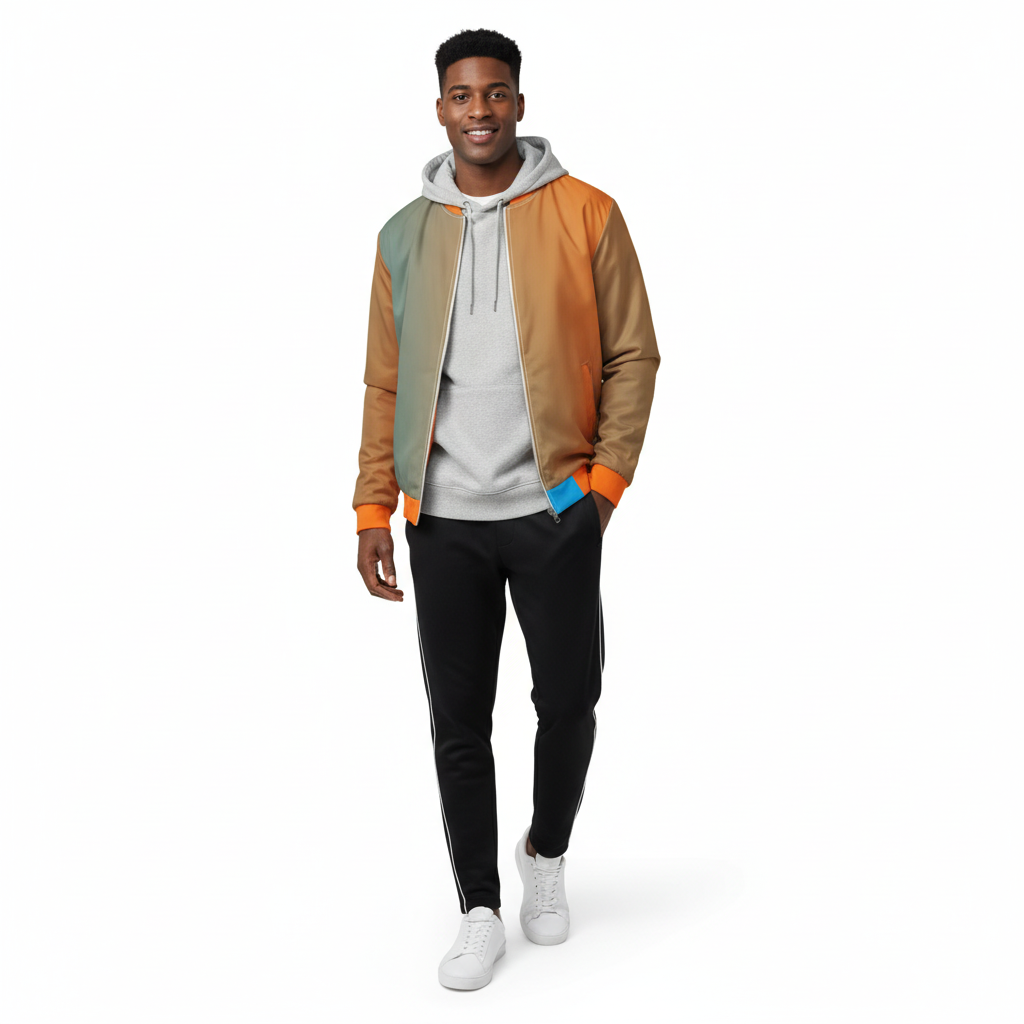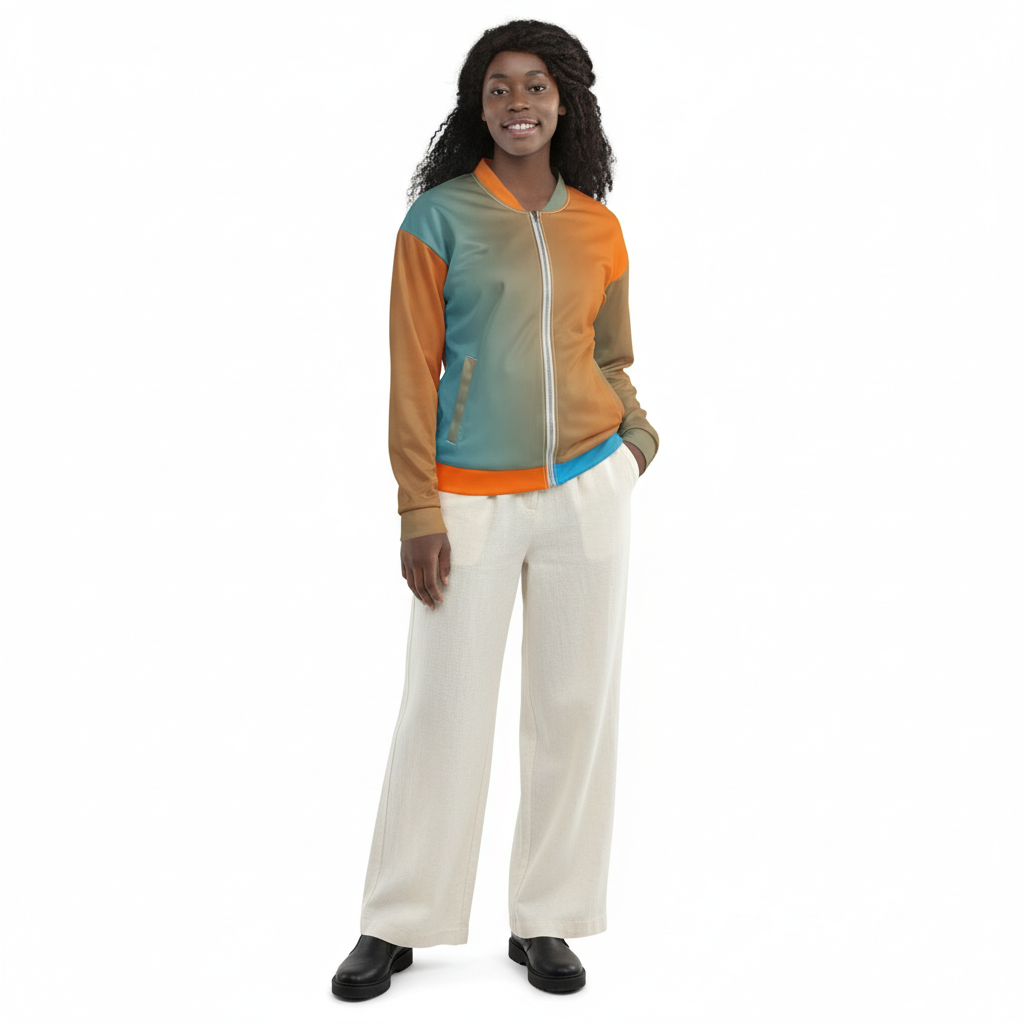 Bold colorblocking meets premium construction in the Terracotta Tri-Tone Bomber. Featuring vibrant orange, earthy tan, and turquoise panels, this statement piece delivers geometric impact with a luxe finish.