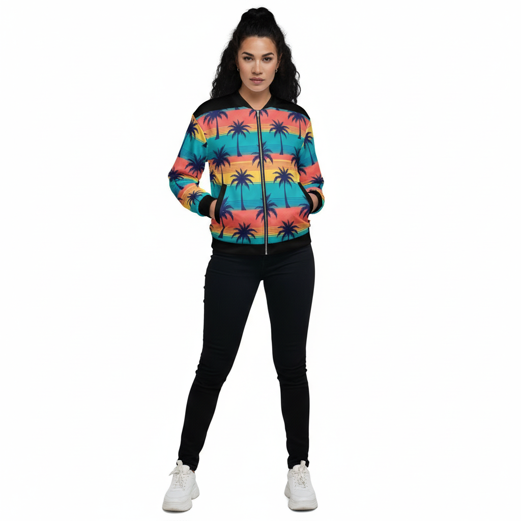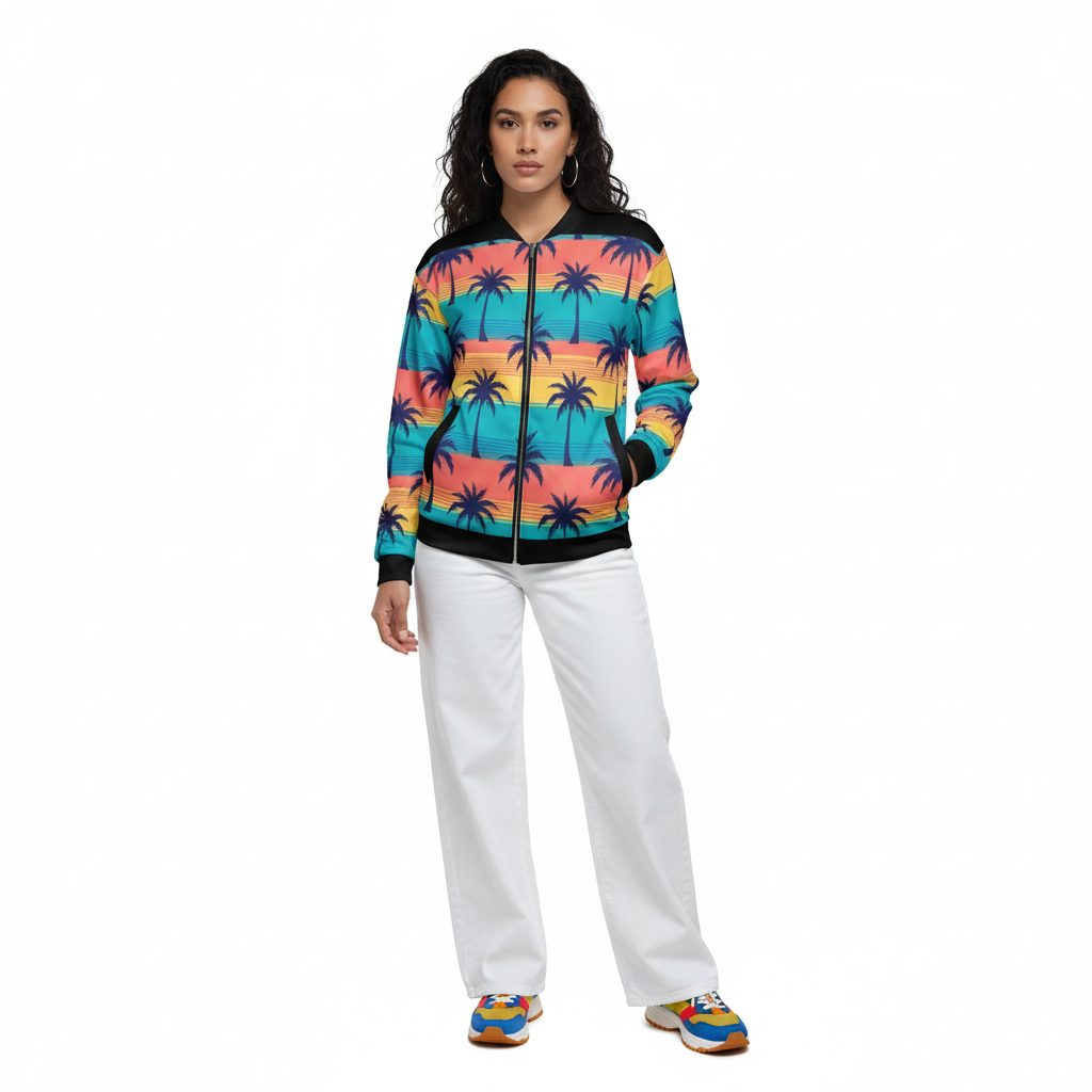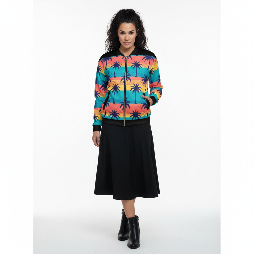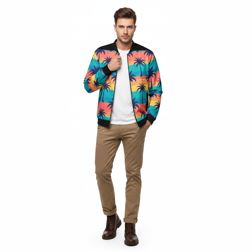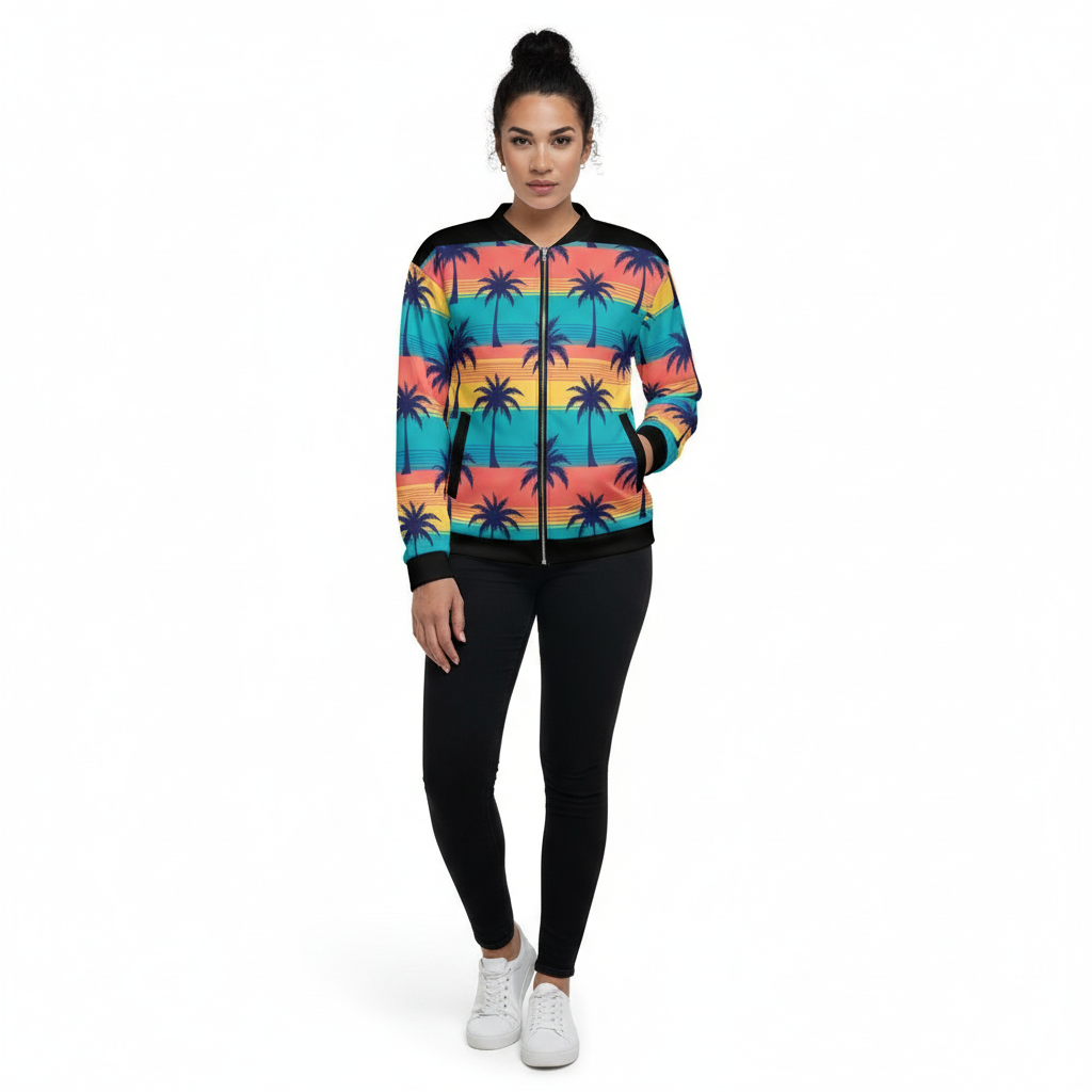 Transport yourself to endless summer with the Sunset Paradise Bomber Jacket. This vibrant unisex piece features a bold tropical print with palm tree silhouettes set against color-blocked sunset stripes in coral pink, turquoise, and golden yellow.