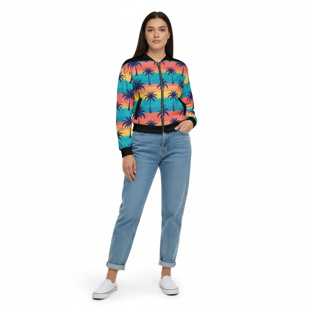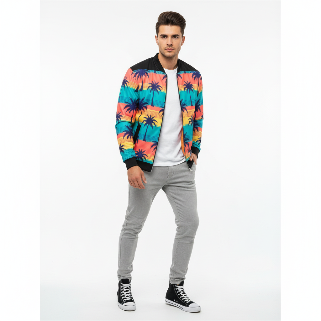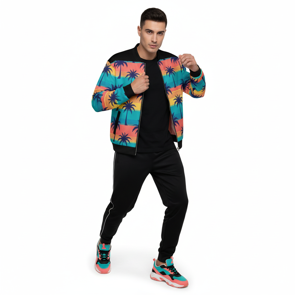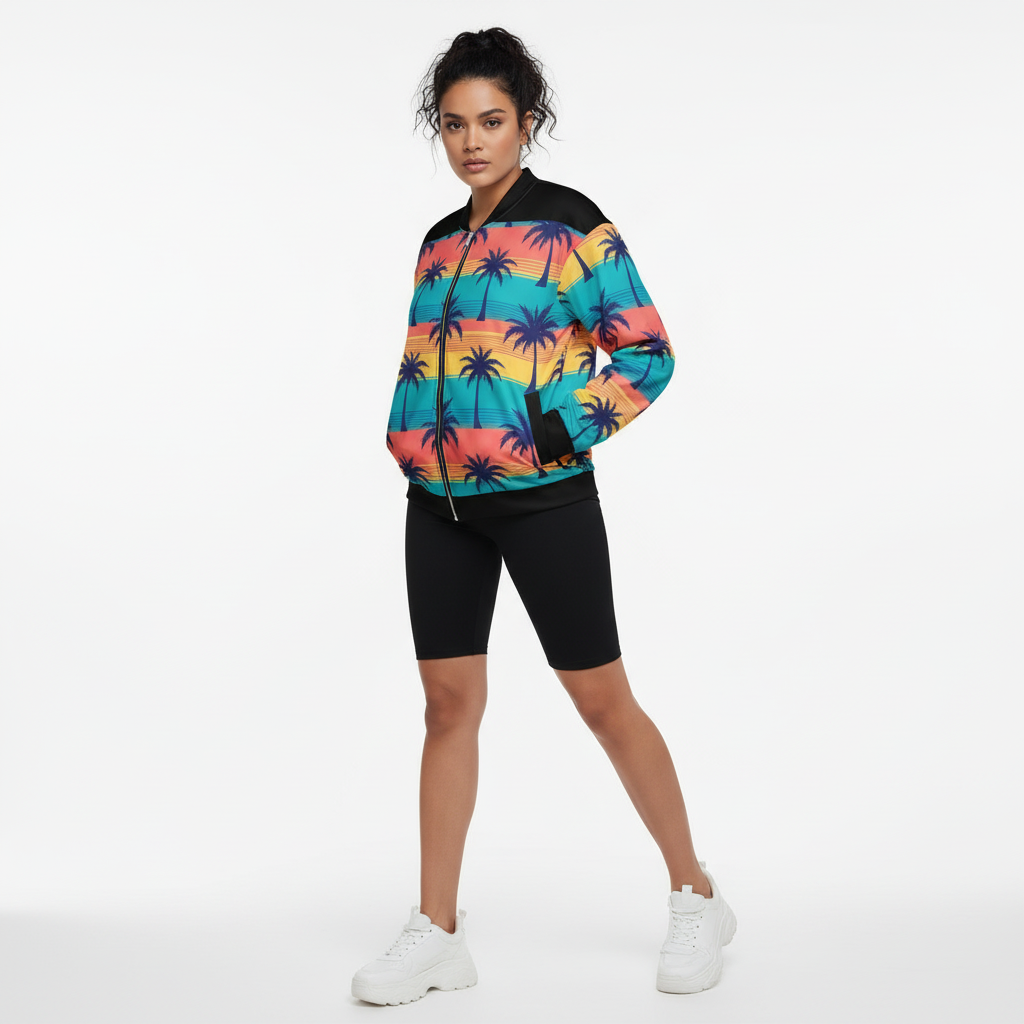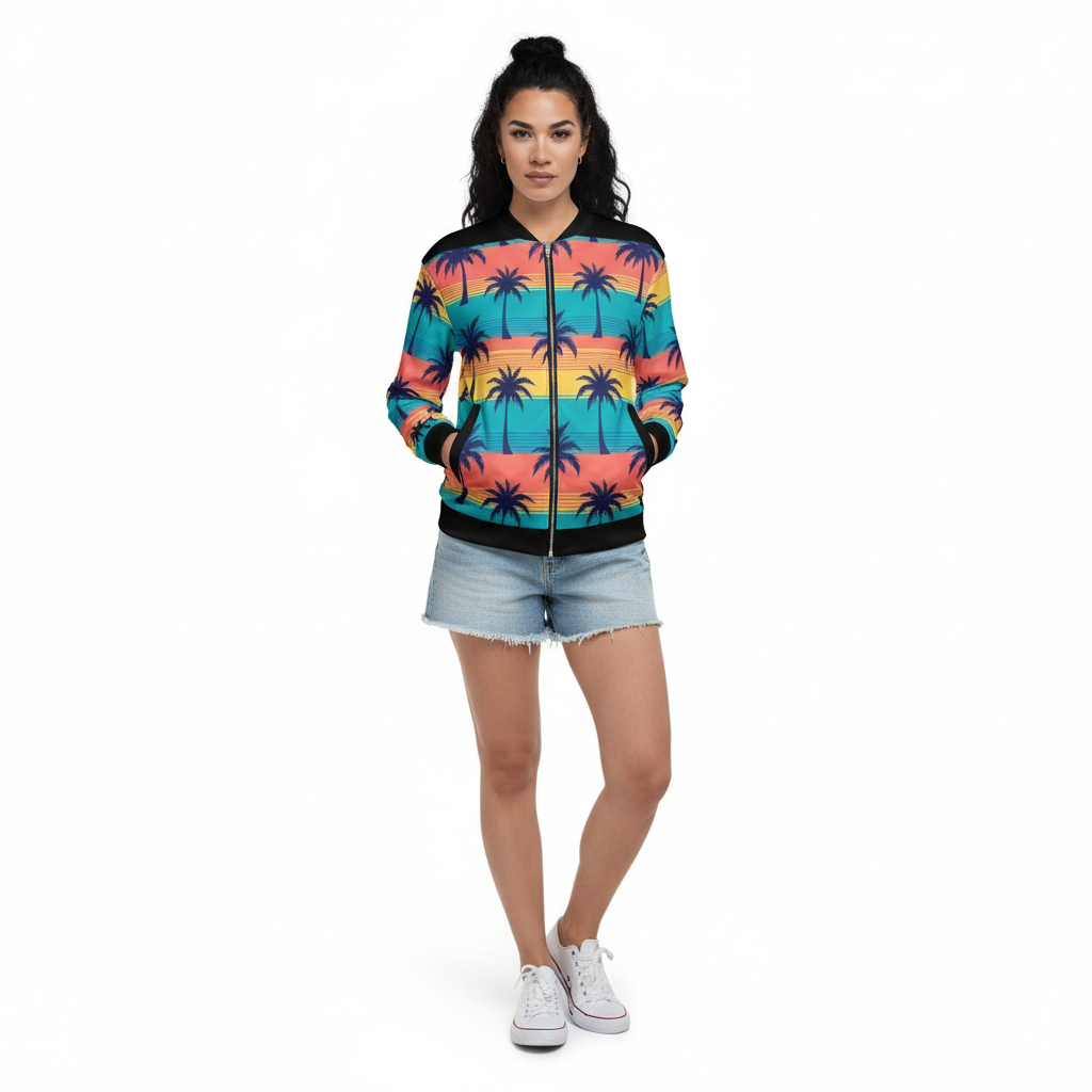 Transport yourself to endless summer with the Sunset Paradise Bomber Jacket. This vibrant unisex piece features a bold tropical print with palm tree silhouettes set against color-blocked sunset stripes in coral pink, turquoise, and golden yellow.