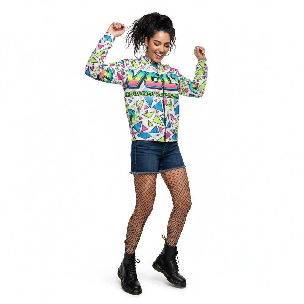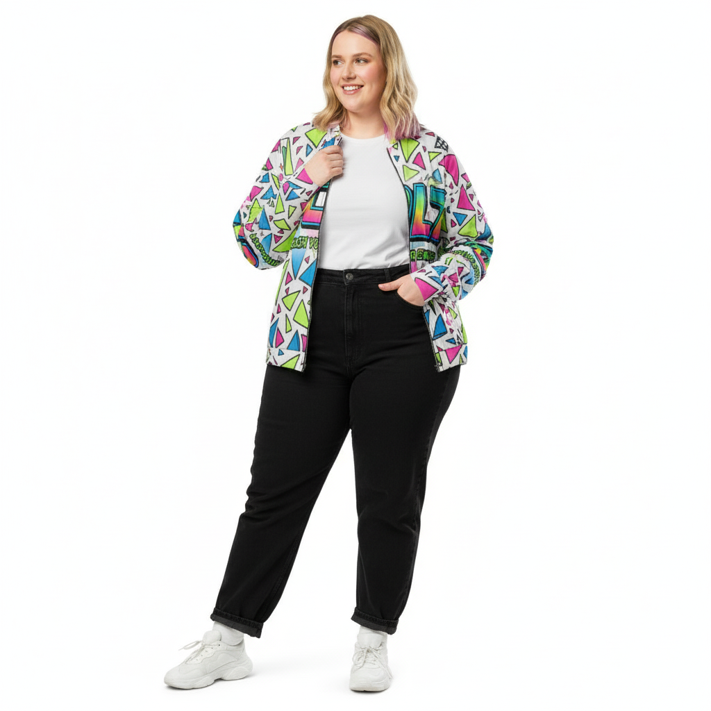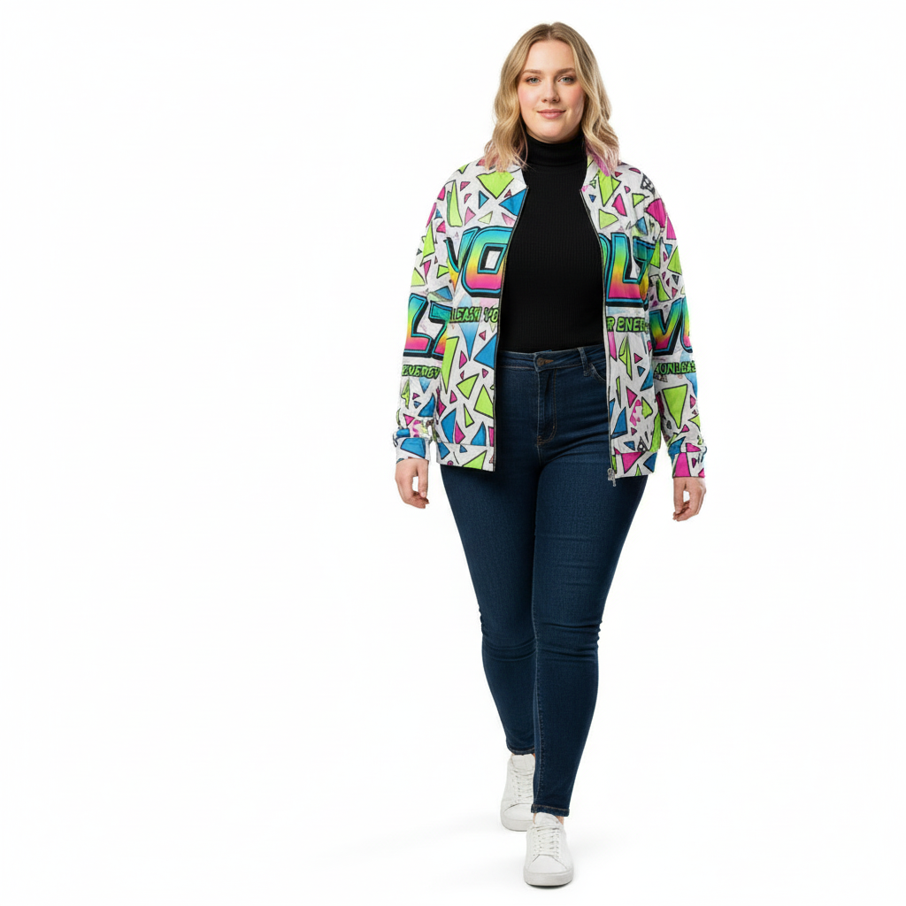 This versatile bomber transitions seamlessly from street to stage. Layer it over graphic tees for maximum impact, pair with monochrome basics to let the print shine, or go full maximalist with complementary bold pieces. The vibrant neon palette—electric pink, lime green, and cyan blue—ensures you'll never blend into the background.