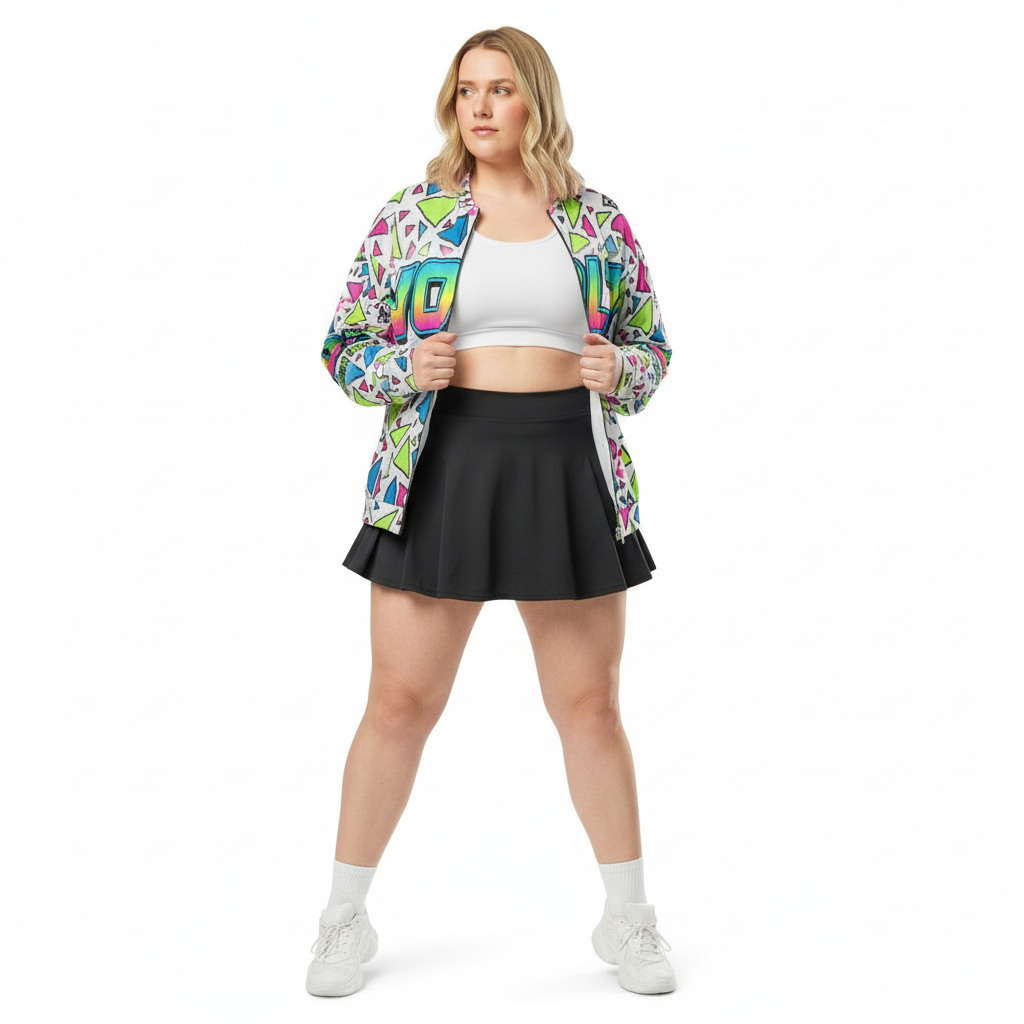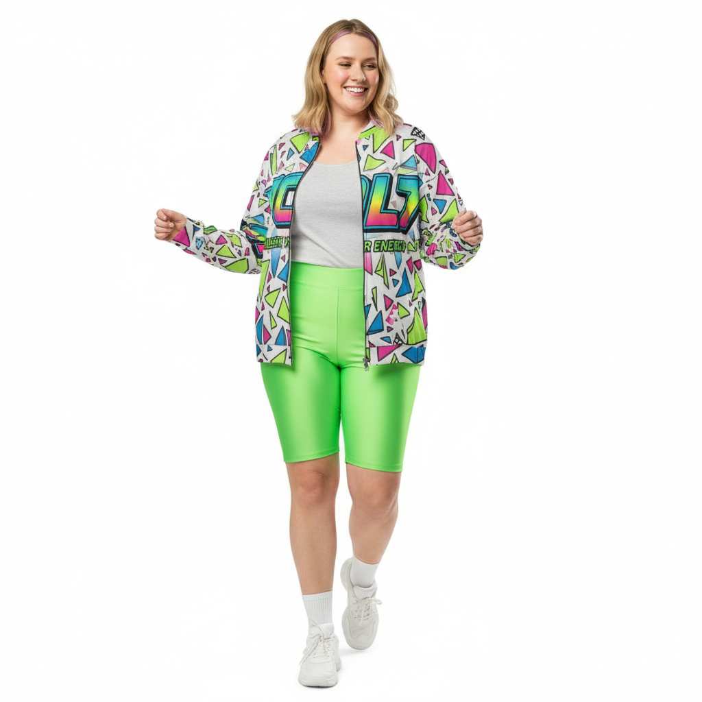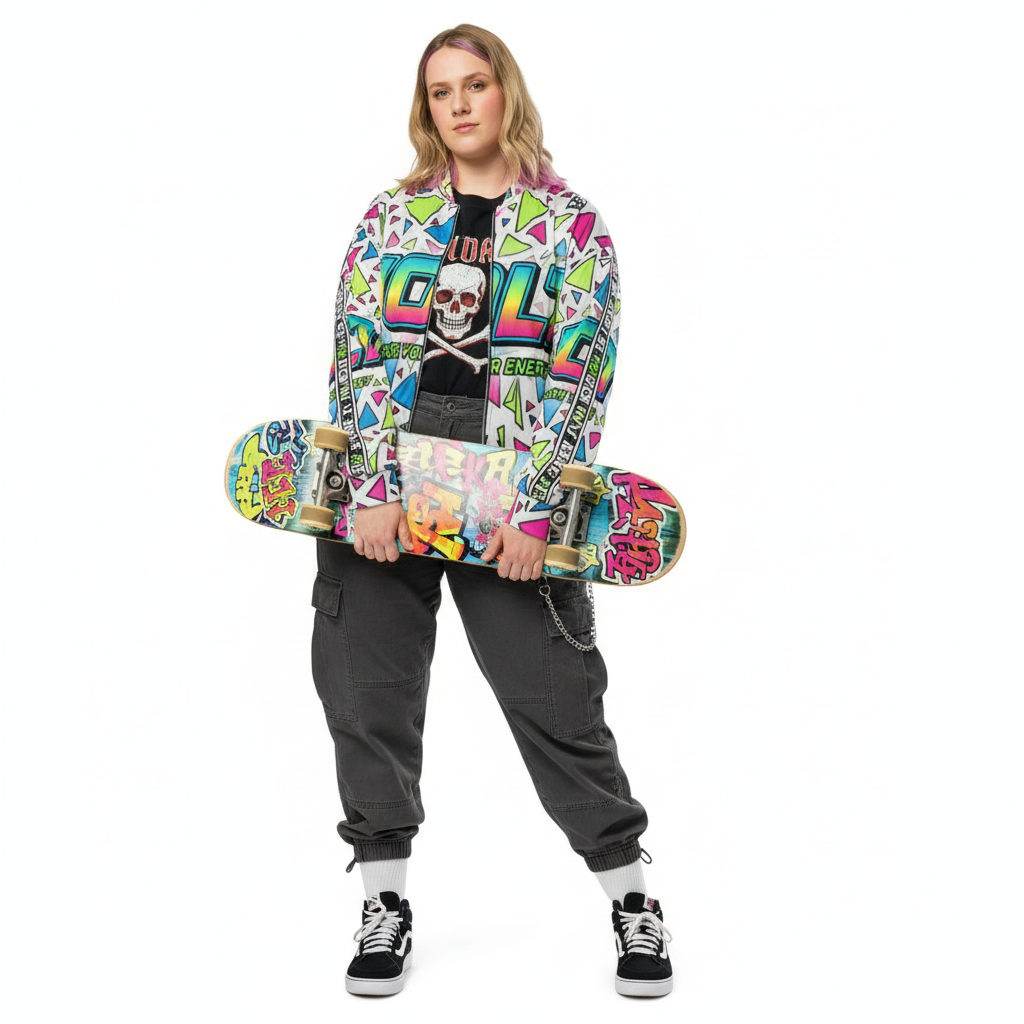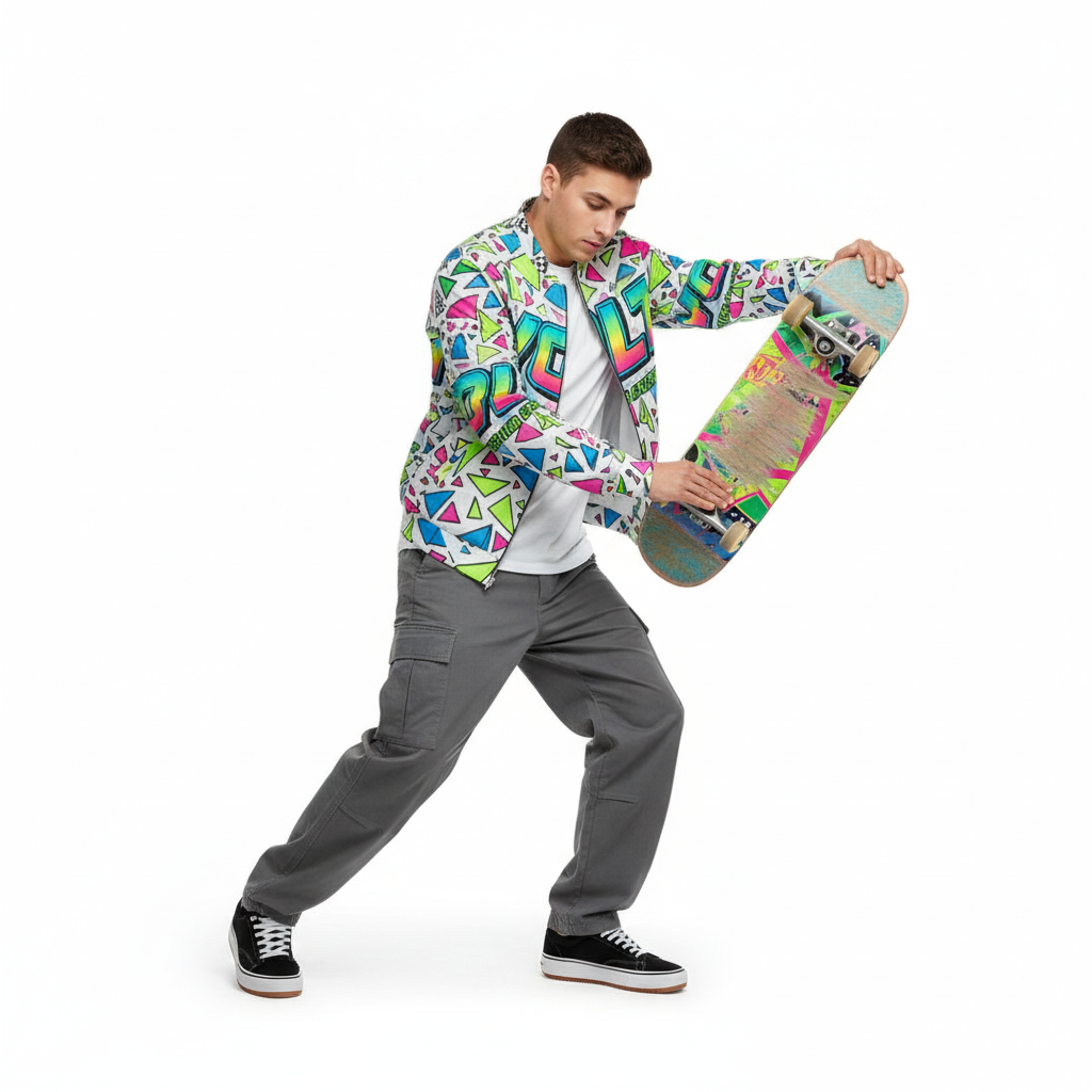 This versatile bomber transitions seamlessly from street to stage. Layer it over graphic tees for maximum impact, pair with monochrome basics to let the print shine, or go full maximalist with complementary bold pieces. The vibrant neon palette—electric pink, lime green, and cyan blue—ensures you'll never blend into the background.