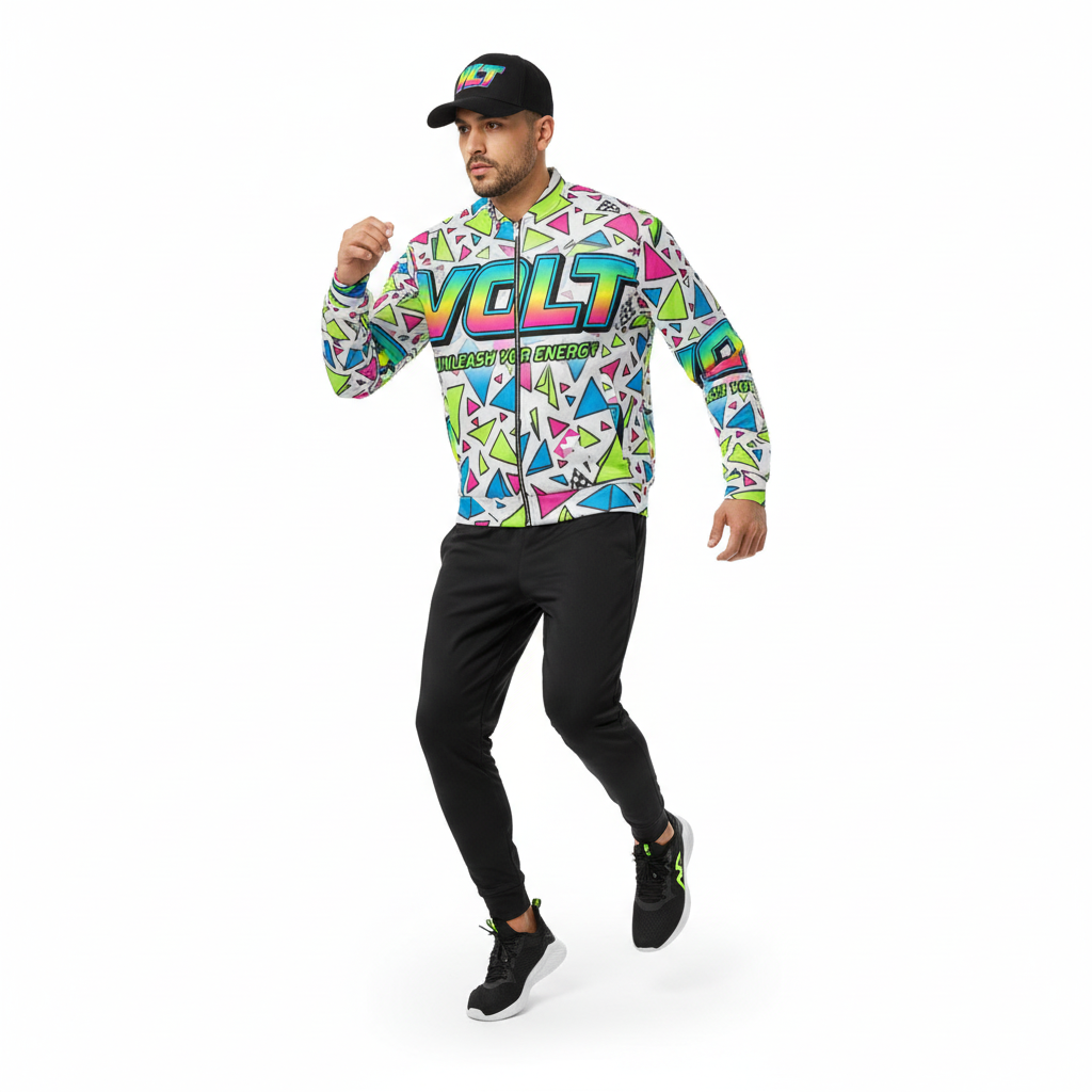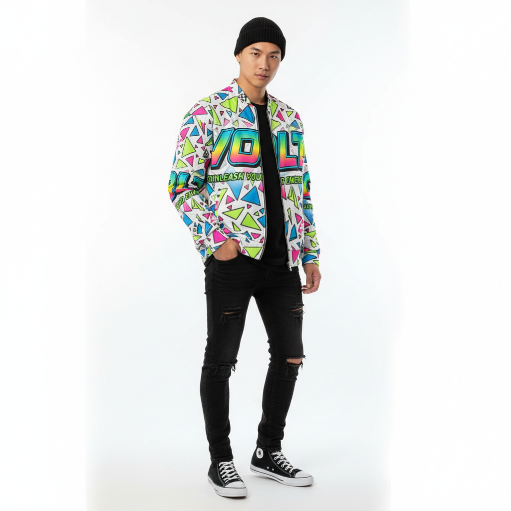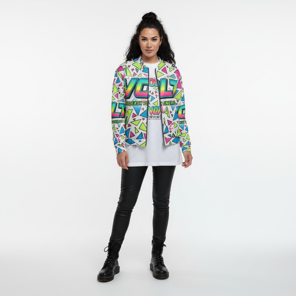 The VOLT Energy Bomber Jacket is a bold statement piece that electrifies any outfit. Featuring an explosive all-over print of neon geometric triangles and gradient VOLT branding, this unisex bomber channels pure 90s energy drink aesthetics with a modern streetwear edge.