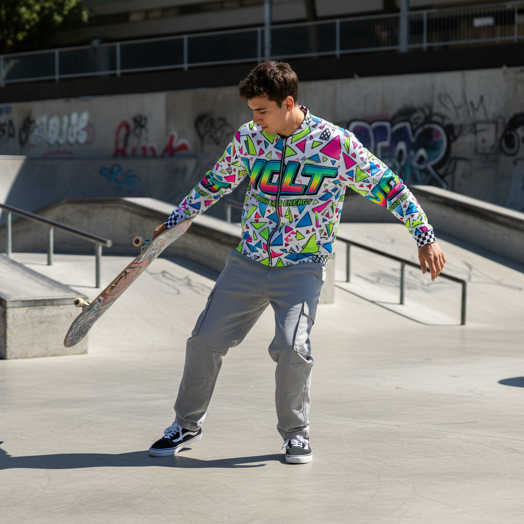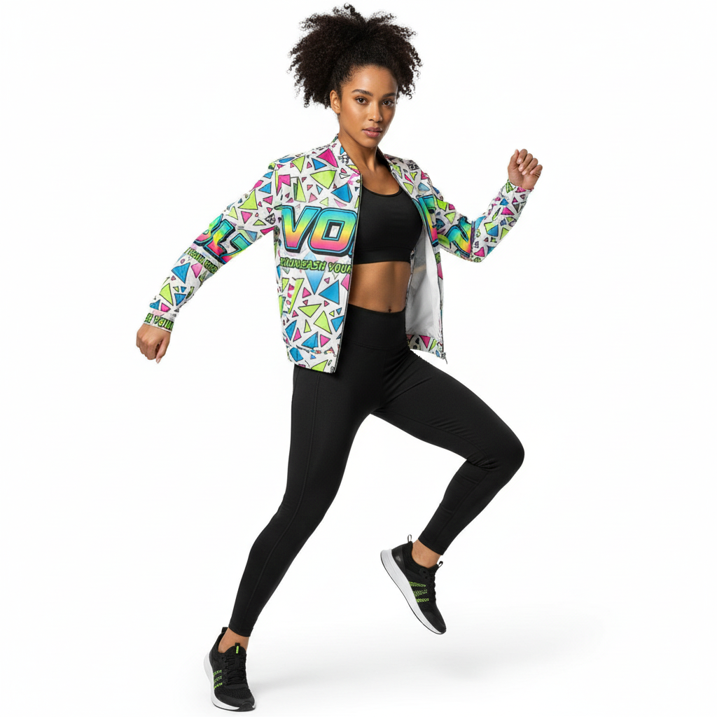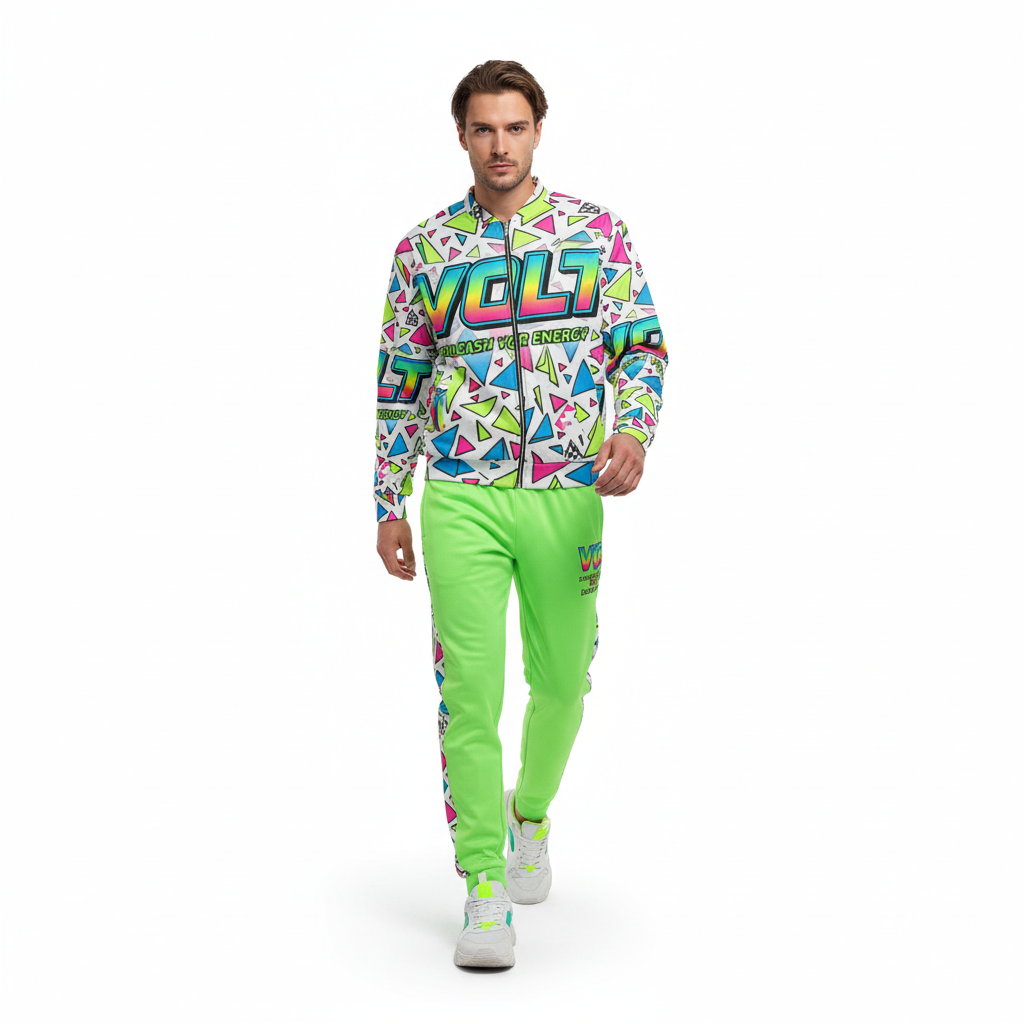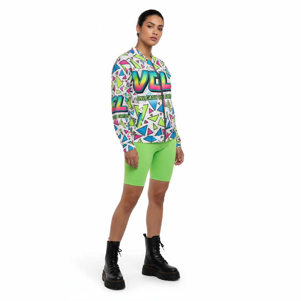 The VOLT Energy Bomber Jacket is a bold statement piece that electrifies any outfit. Featuring an explosive all-over print of neon geometric triangles and gradient VOLT branding, this unisex bomber channels pure 90s energy drink aesthetics with a modern streetwear edge.