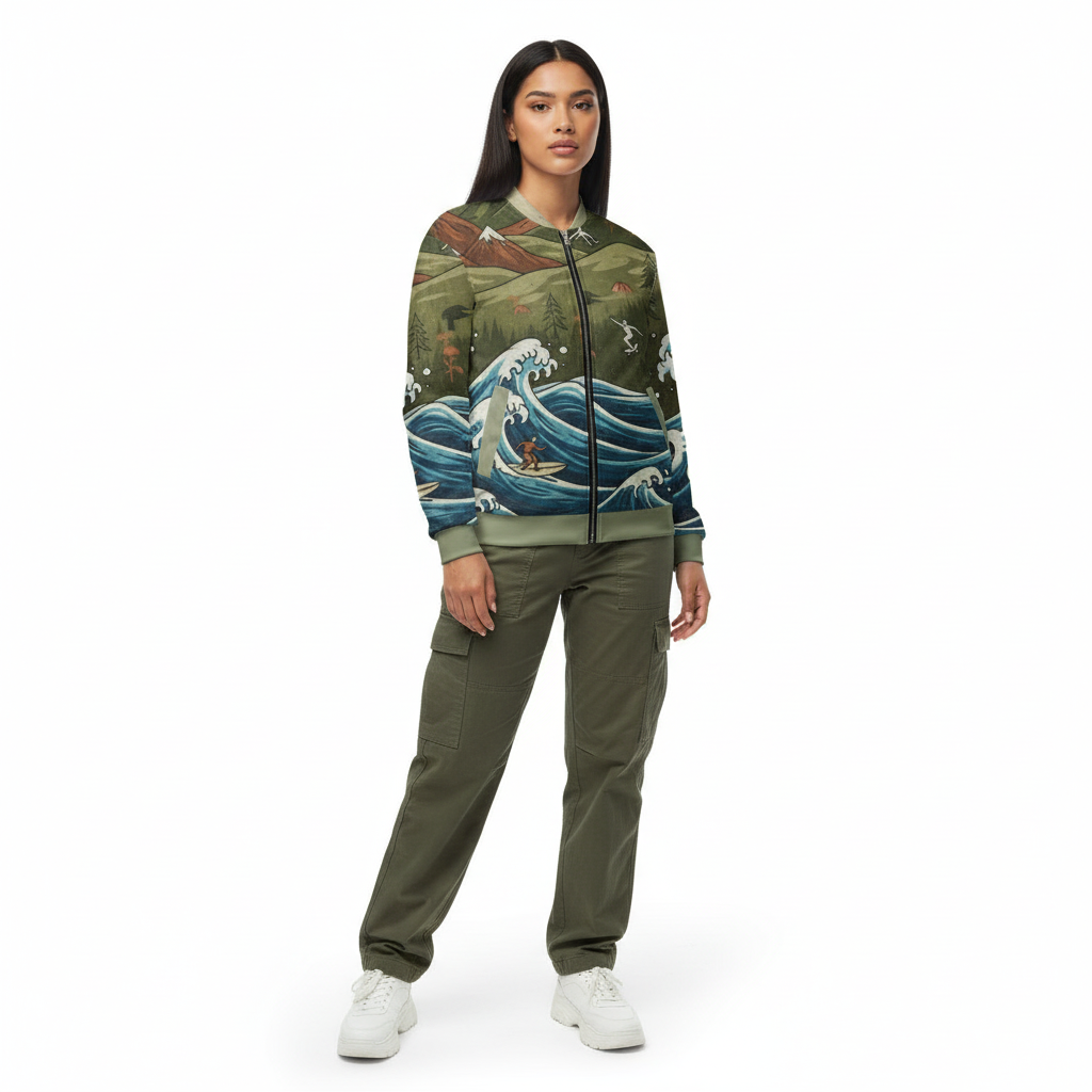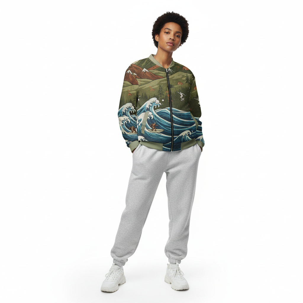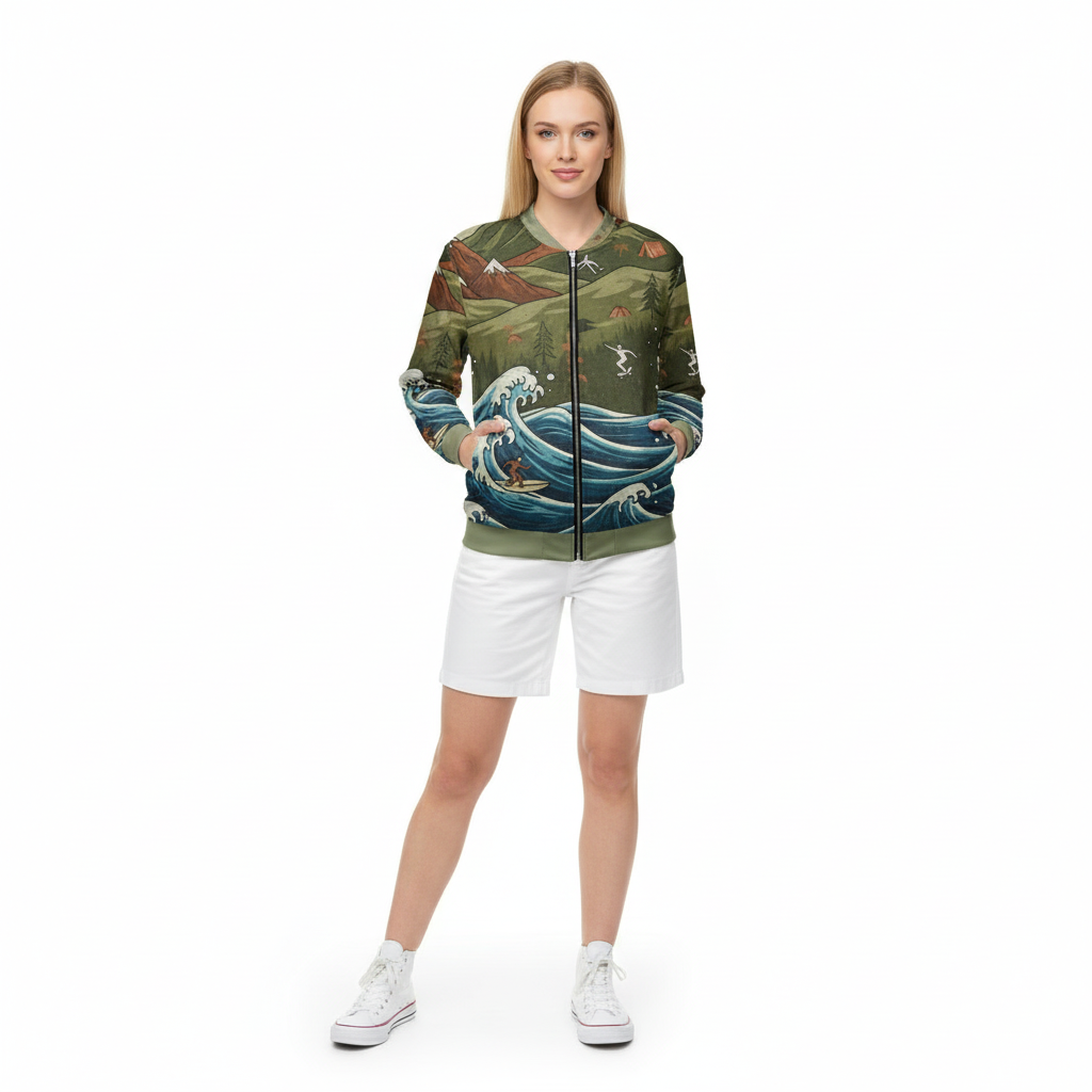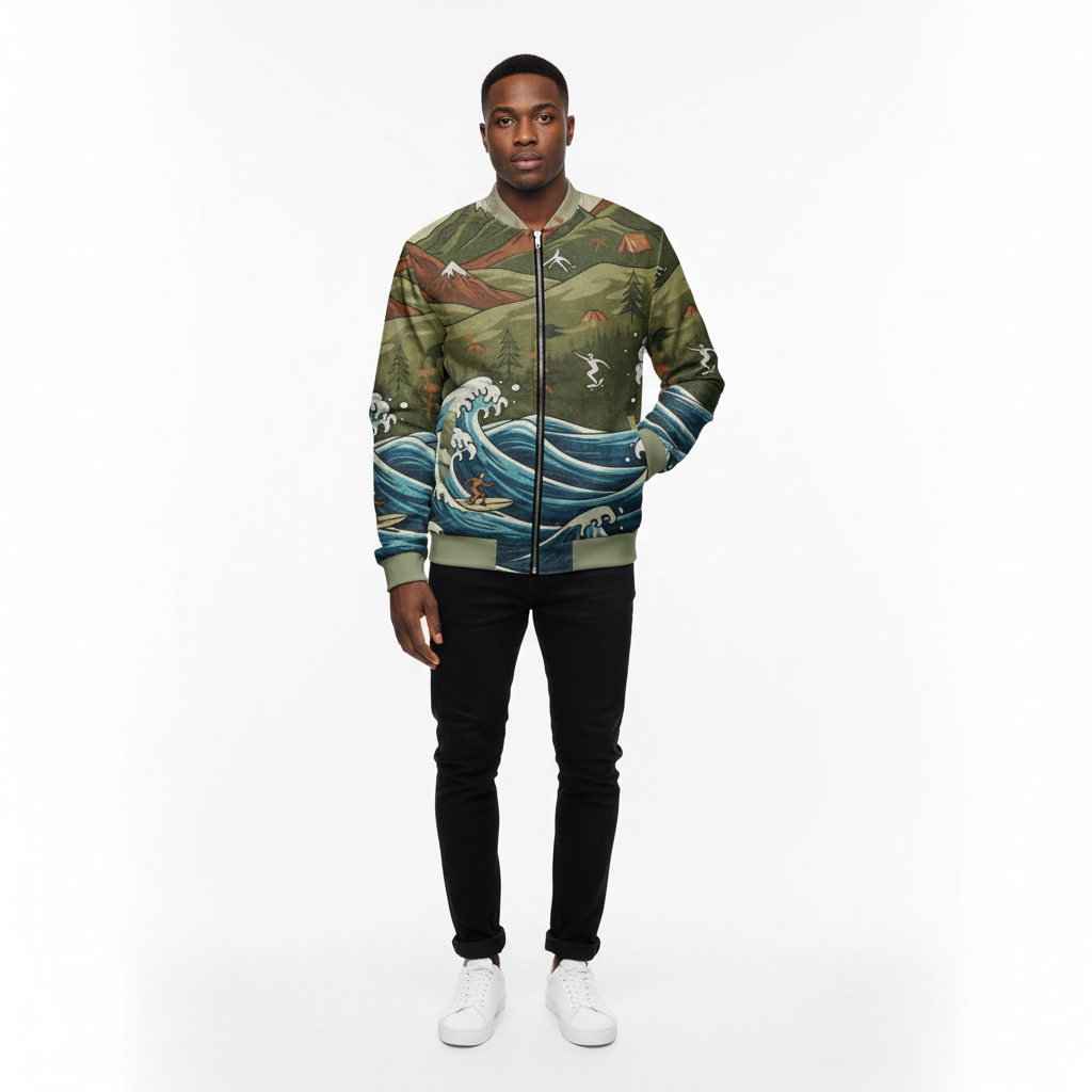 Experience the ultimate fusion of surf and mountain culture with this stunning all-over print bomber jacket. Featuring a unique artistic design where rolling ocean waves meet majestic mountain peaks, surfers ride the waves while skiers carve the slopes above—all in one cohesive vintage-inspired landscape.