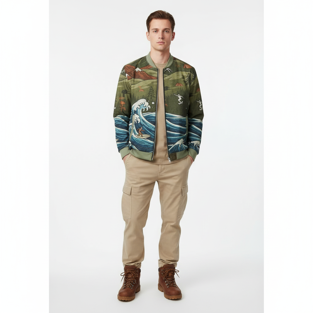 This unique bomber celebrates the adventurer's lifestyle—perfect for those who love both surf sessions and mountain escapes. Layer it over a simple tee and jeans for everyday style, pair it with joggers for outdoor adventures, or dress it up with chinos for a retro-inspired look. The artistic vintage print makes it ideal for festivals, travel, casual outings, or anyone who embraces the outdoor lifestyle.