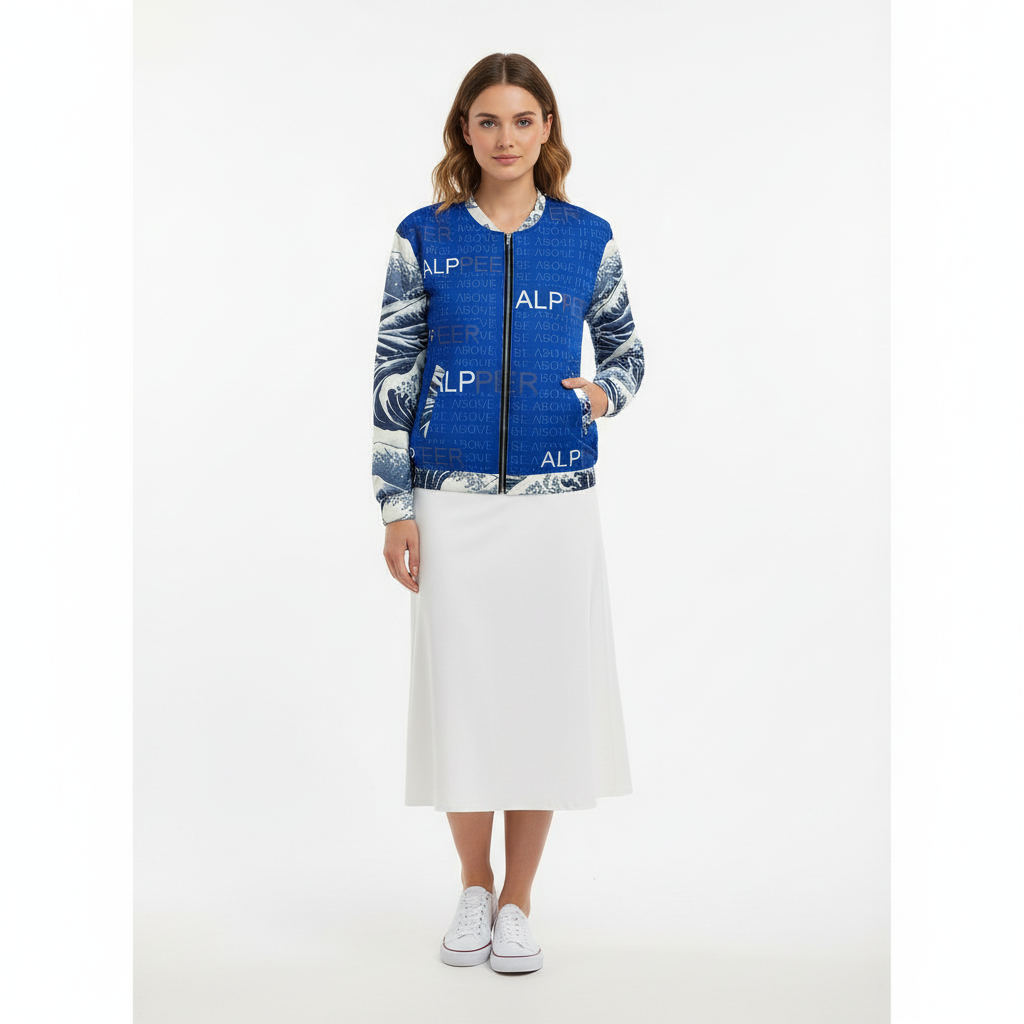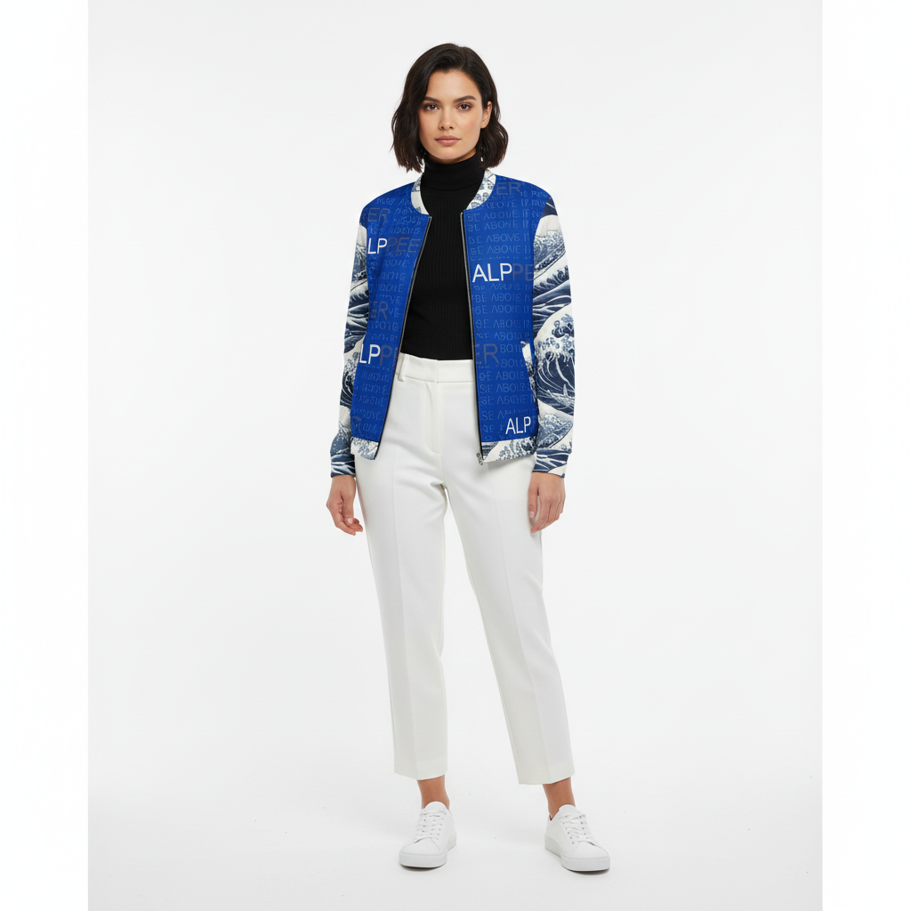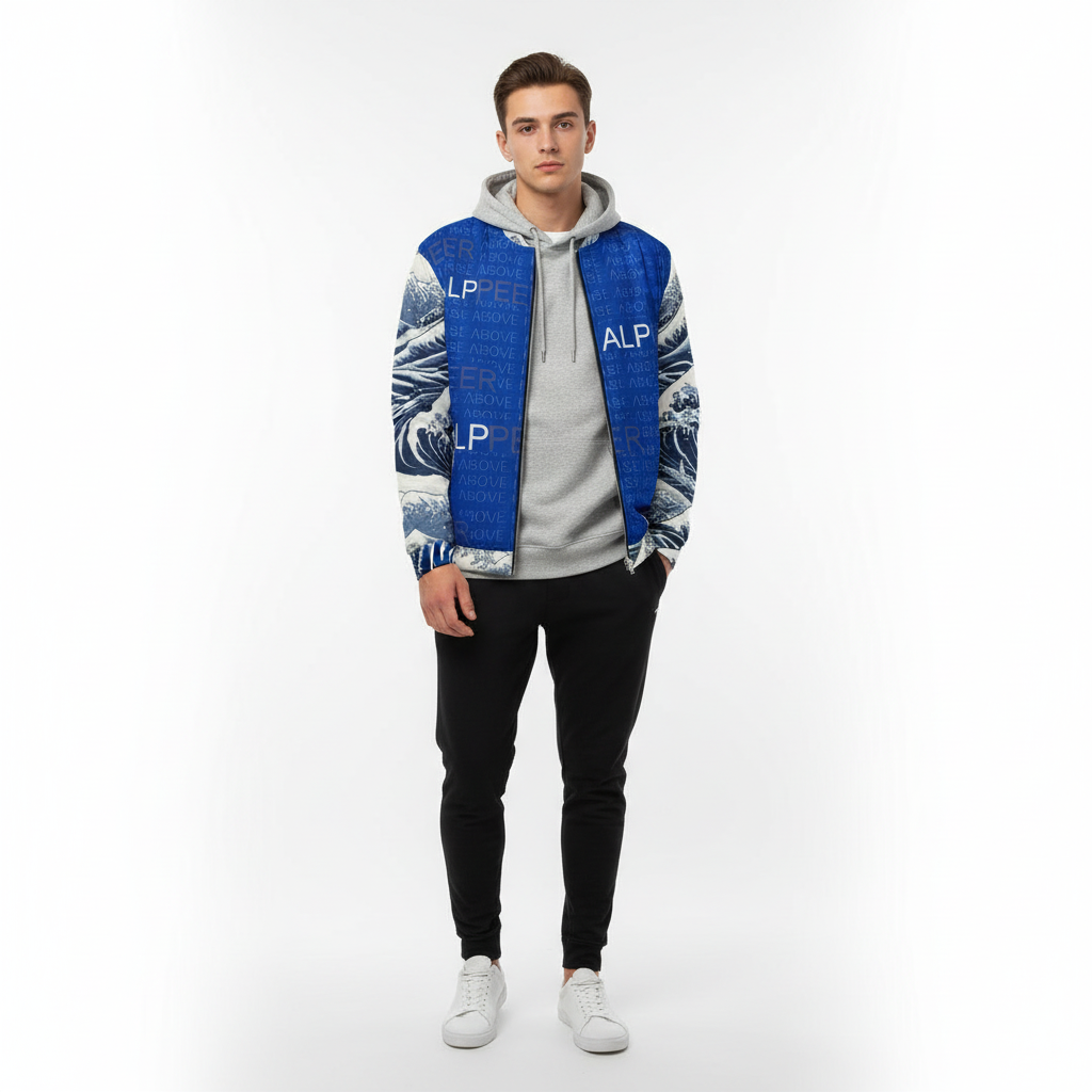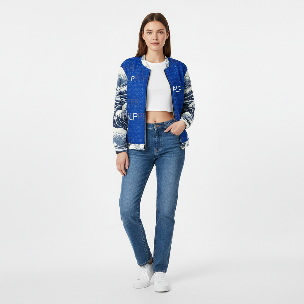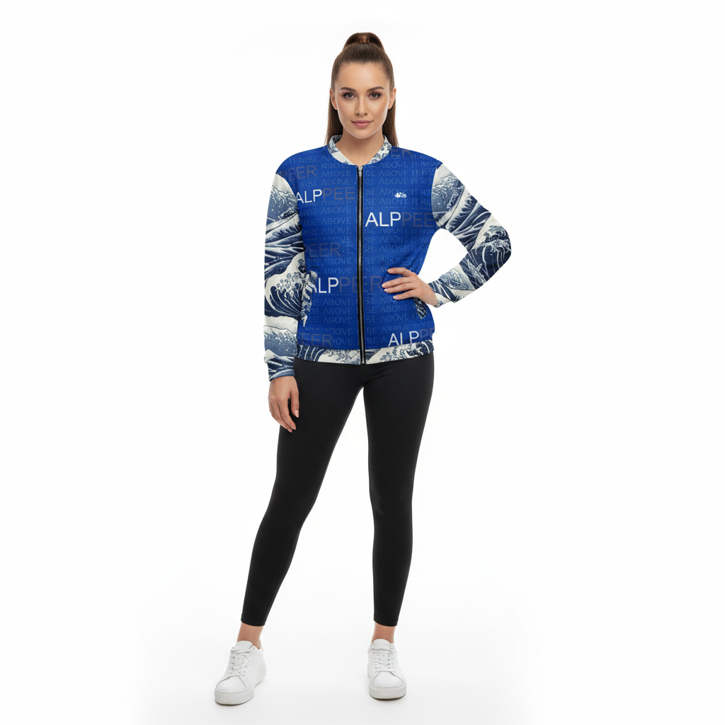 Rise above with this striking Japanese wave bomber jacket featuring iconic ocean wave patterns inspired by traditional ukiyo-e art. The bold blue and white design combines classic Japanese aesthetics with contemporary ALPPEER branding and the motivational phrase "RISE ABOVE IT" woven throughout.