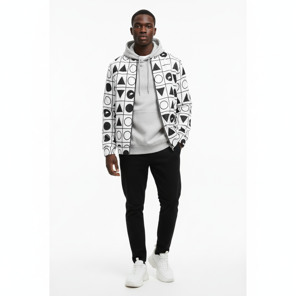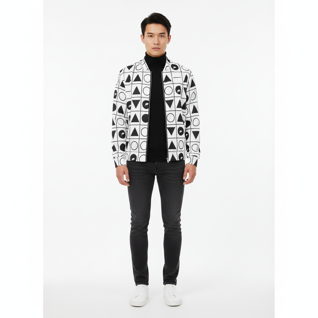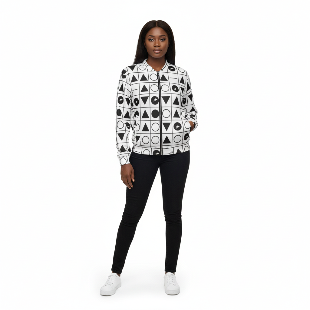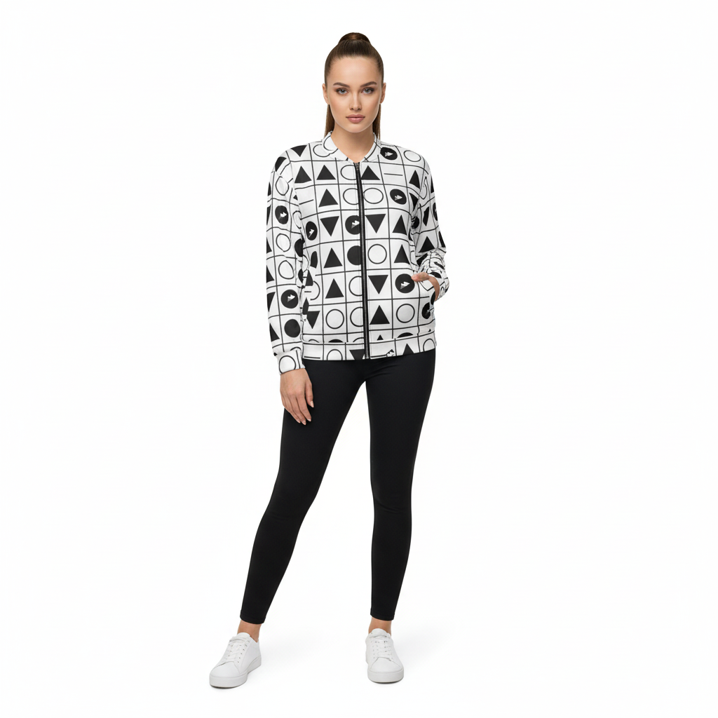 Make a statement with this bold geometric grid bomber jacket featuring an all-over pattern of triangles, circles, and arrows arranged in a striking black and white grid. This modern design blends minimalist aesthetics with graphic impact, creating a piece that's both sophisticated and eye-catching.