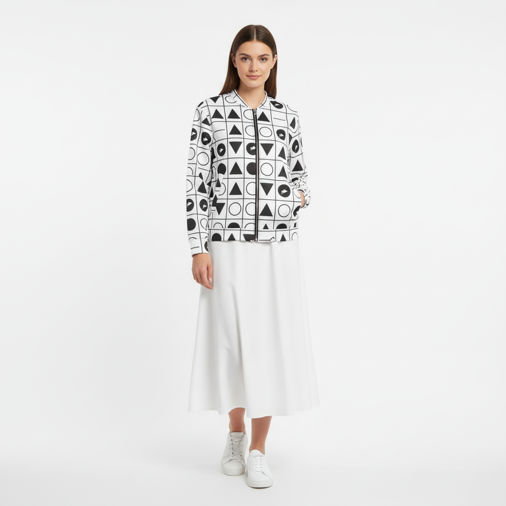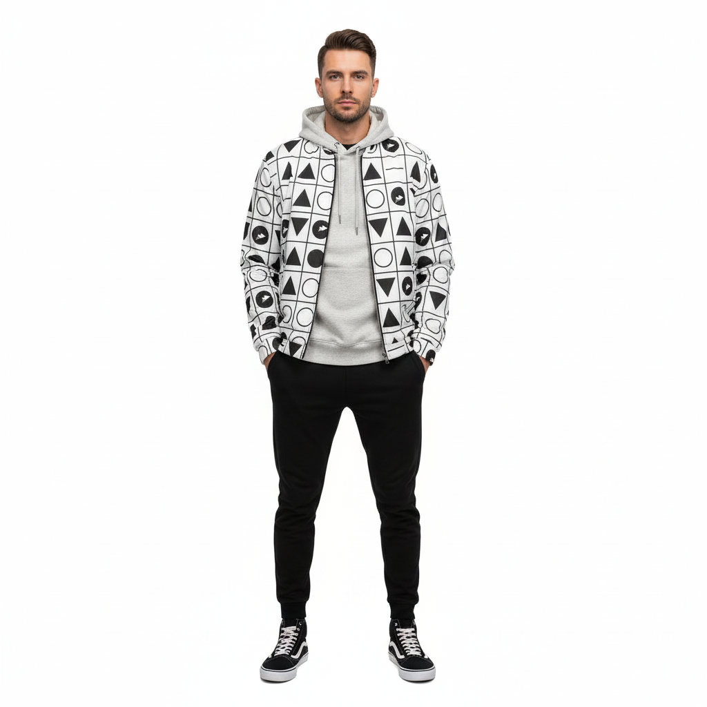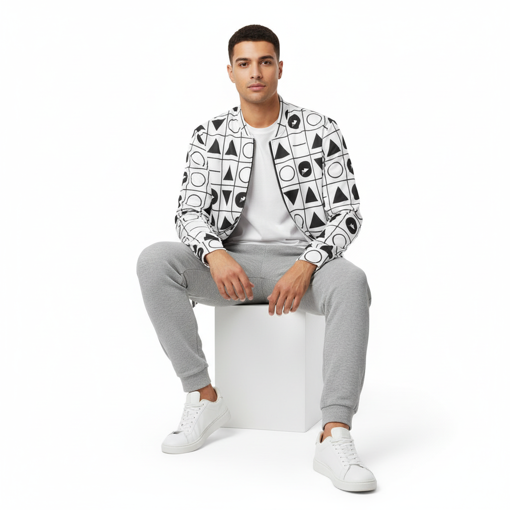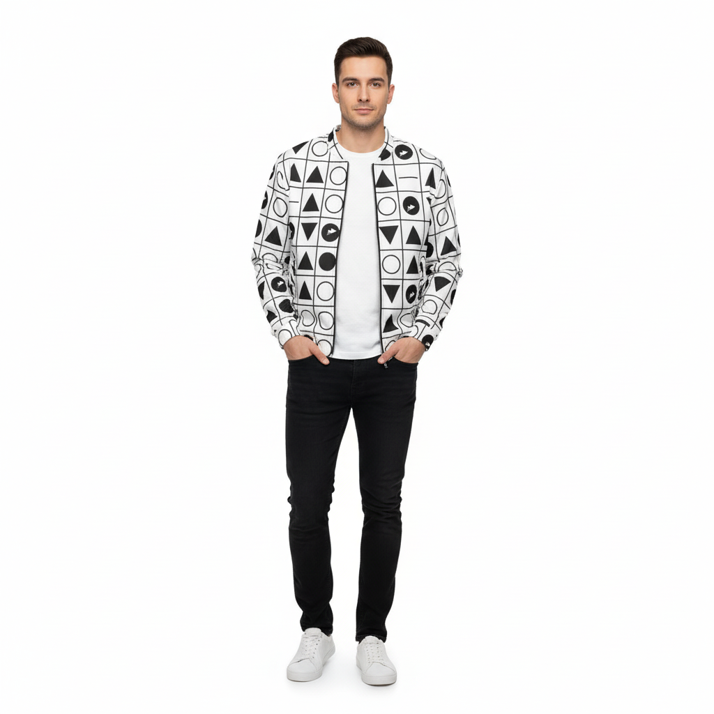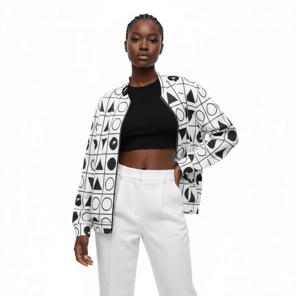 Make a statement with this bold geometric grid bomber jacket featuring an all-over pattern of triangles, circles, and arrows arranged in a striking black and white grid. This modern design blends minimalist aesthetics with graphic impact, creating a piece that's both sophisticated and eye-catching.