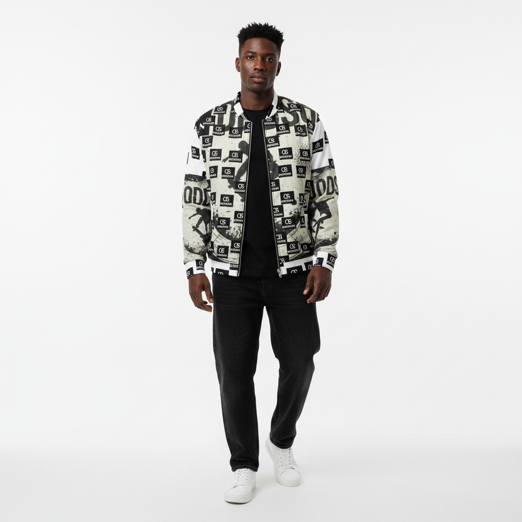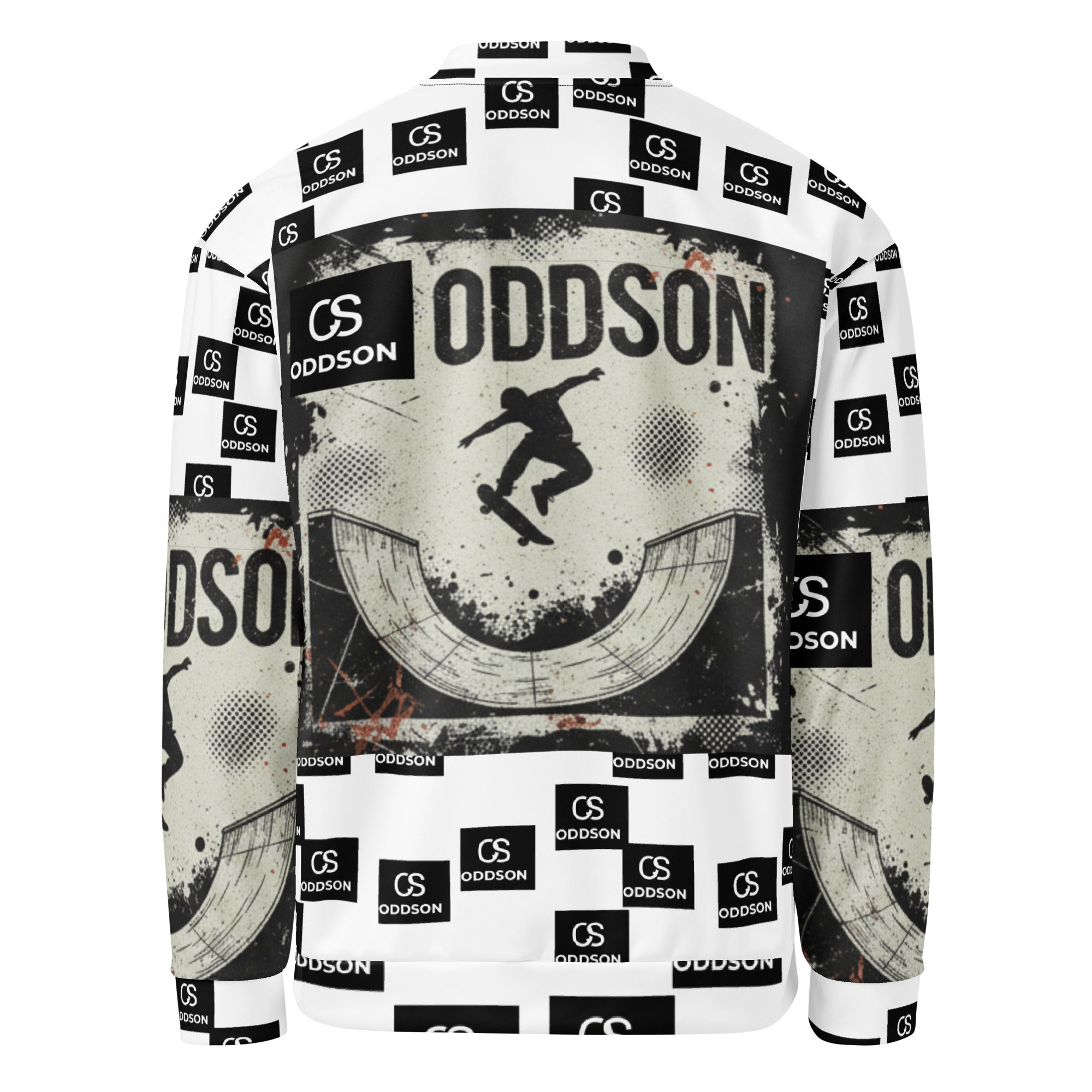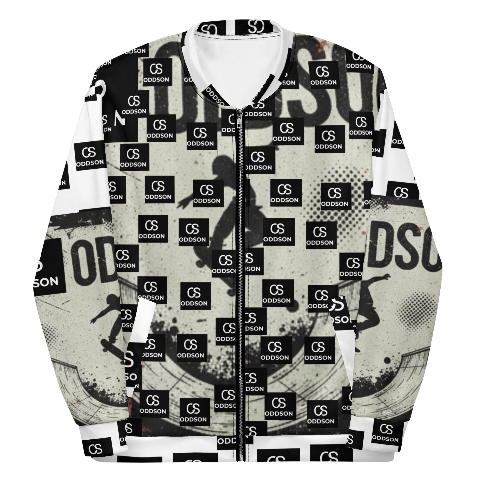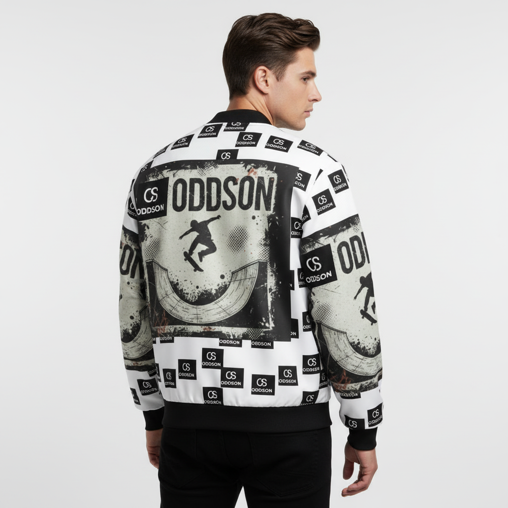 Make a bold statement with this monochrome all-over print bomber jacket that merges skate culture with high-contrast design. Featuring a striking checkerboard pattern of "ODDSON" branding and dynamic skate graphics, this premium bomber delivers street-ready style with a refined edge.