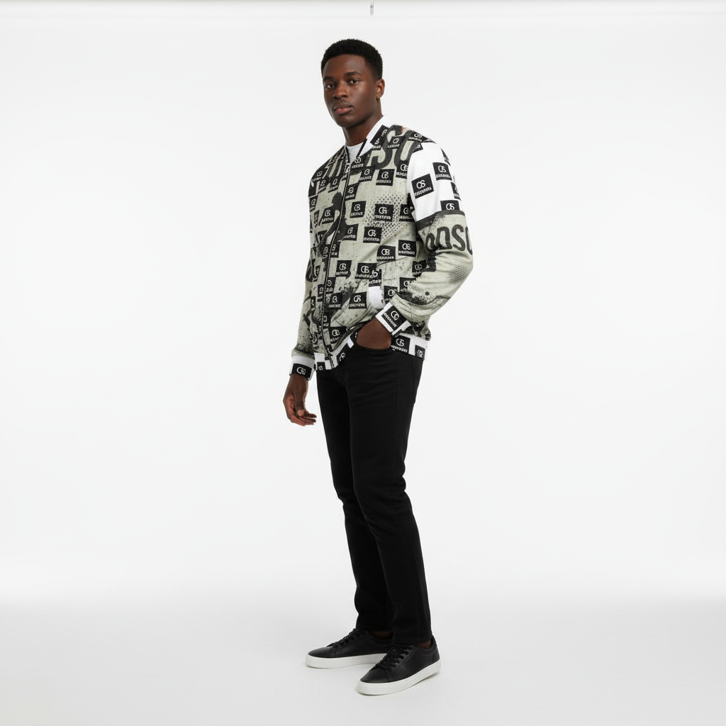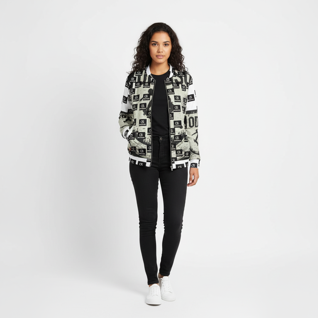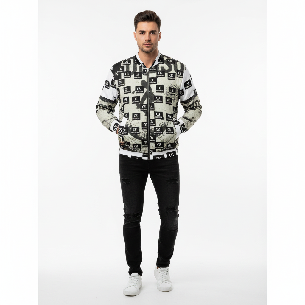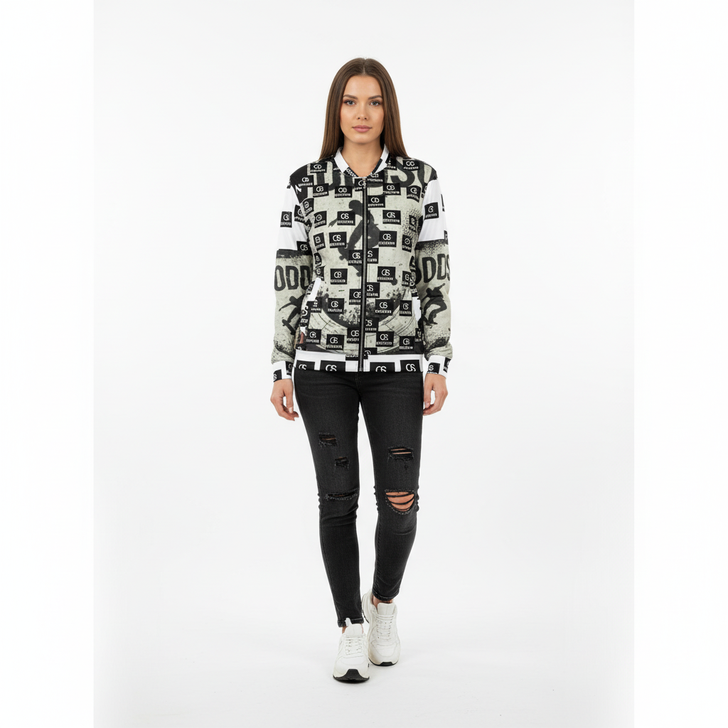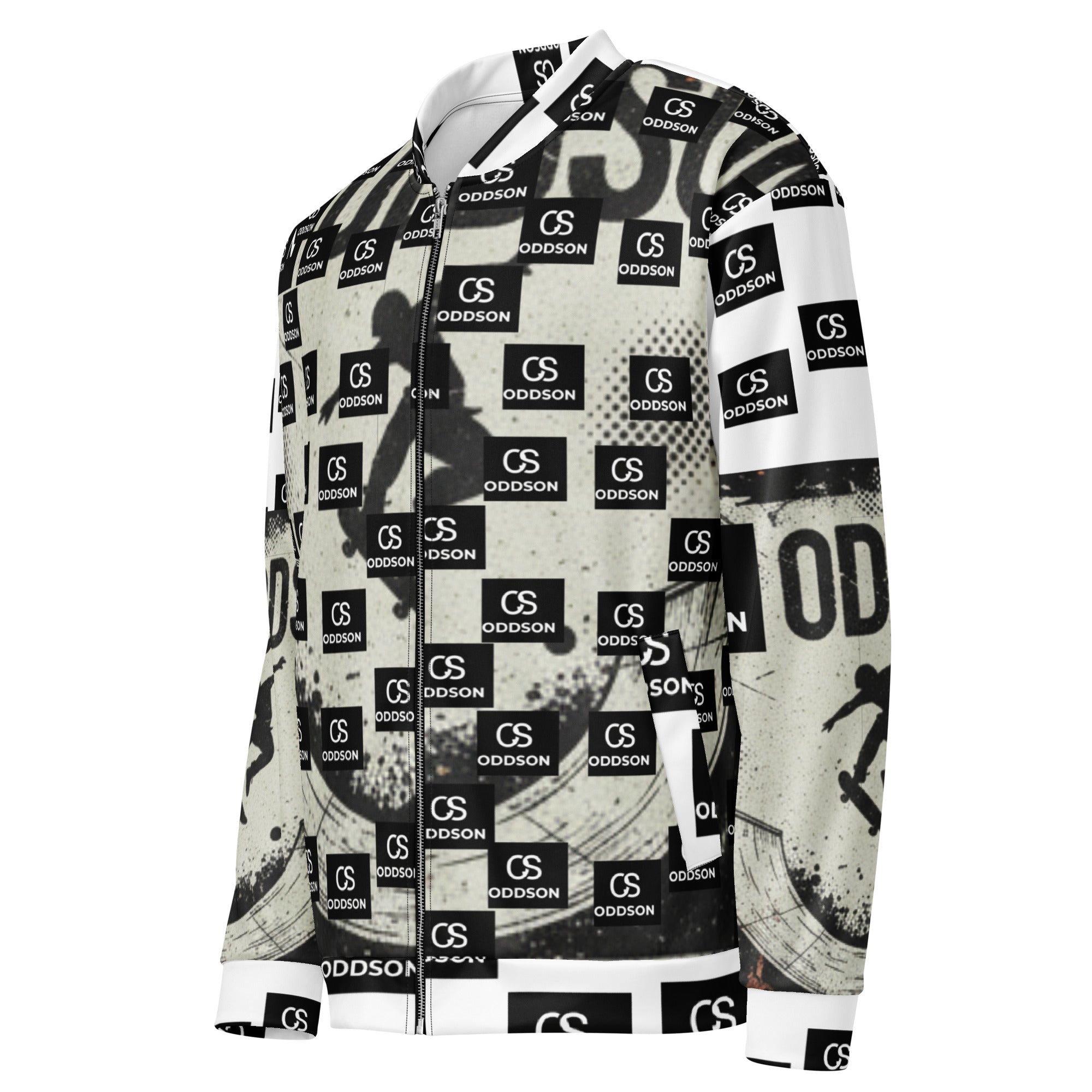 Make a bold statement with this monochrome all-over print bomber jacket that merges skate culture with high-contrast design. Featuring a striking checkerboard pattern of "ODDSON" branding and dynamic skate graphics, this premium bomber delivers street-ready style with a refined edge.