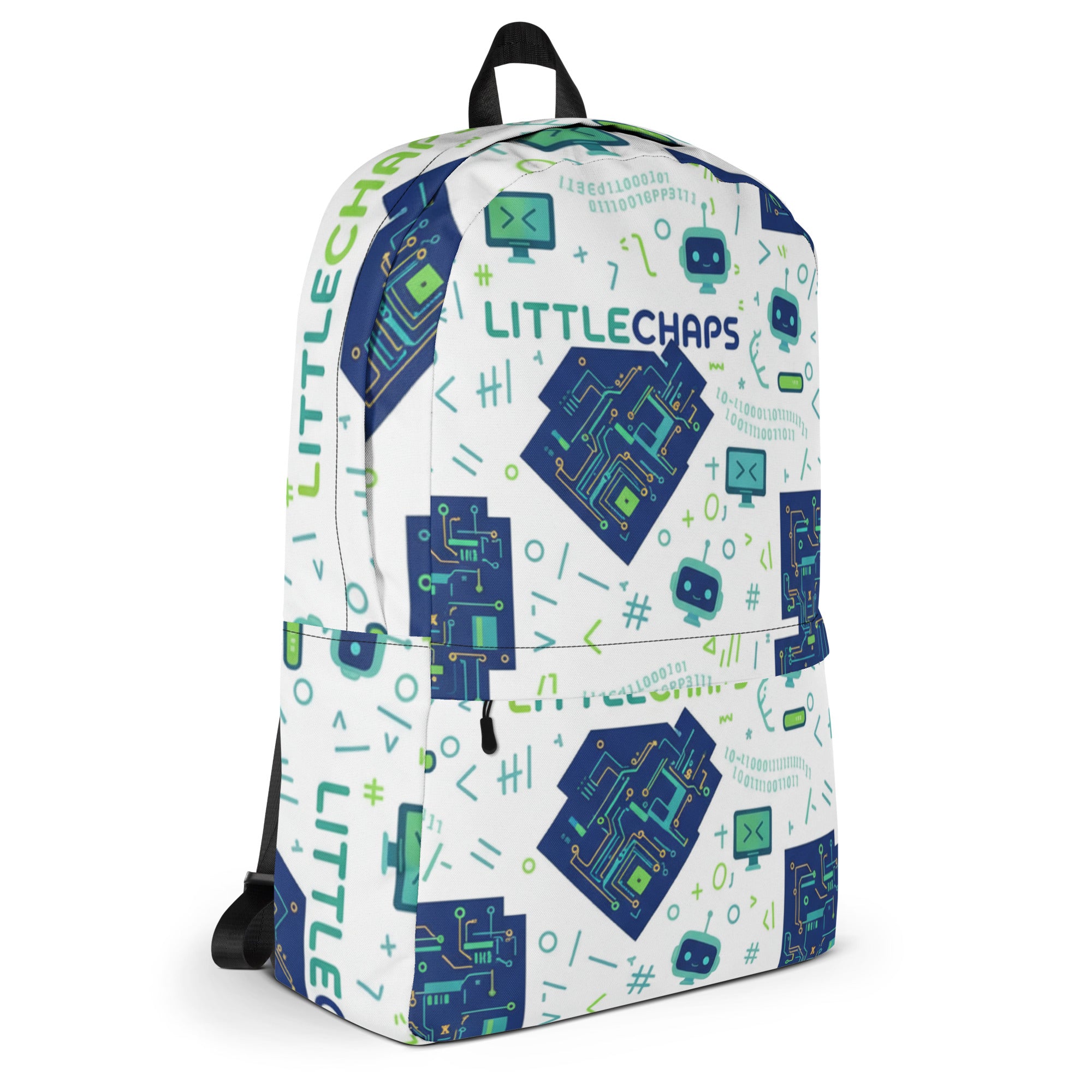 Power up with the LITTLEcHAPS Code Master Backpack! Featuring cool circuit boards, coding symbols, binary code, and friendly robots in vibrant blue and green on a crisp white background, this backpack is perfect for future programmers and tech enthusiasts.