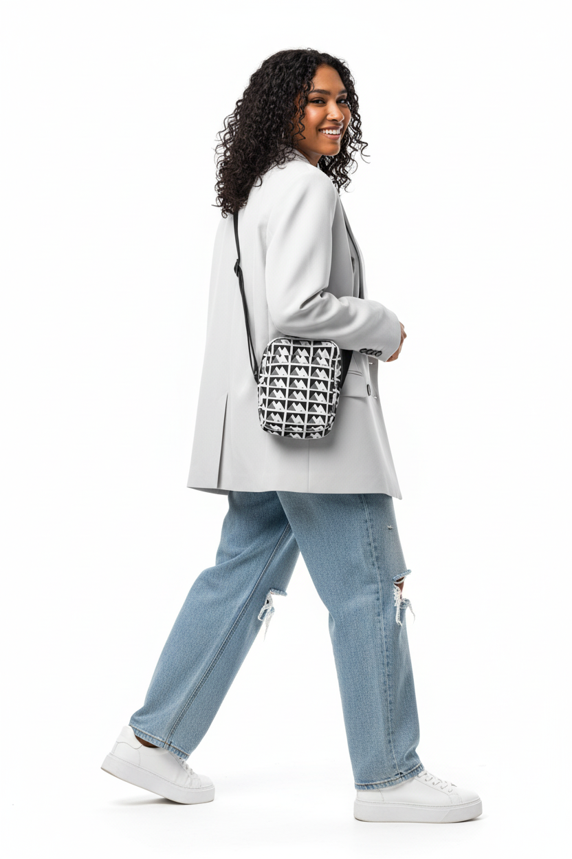Featuring a striking black and white geometric pattern, this crossbody bag combines eye-catching style with practical functionality. Whether you're exploring the city, heading to a festival, or running daily errands, this versatile bag adapts to your lifestyle with ease.
