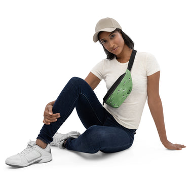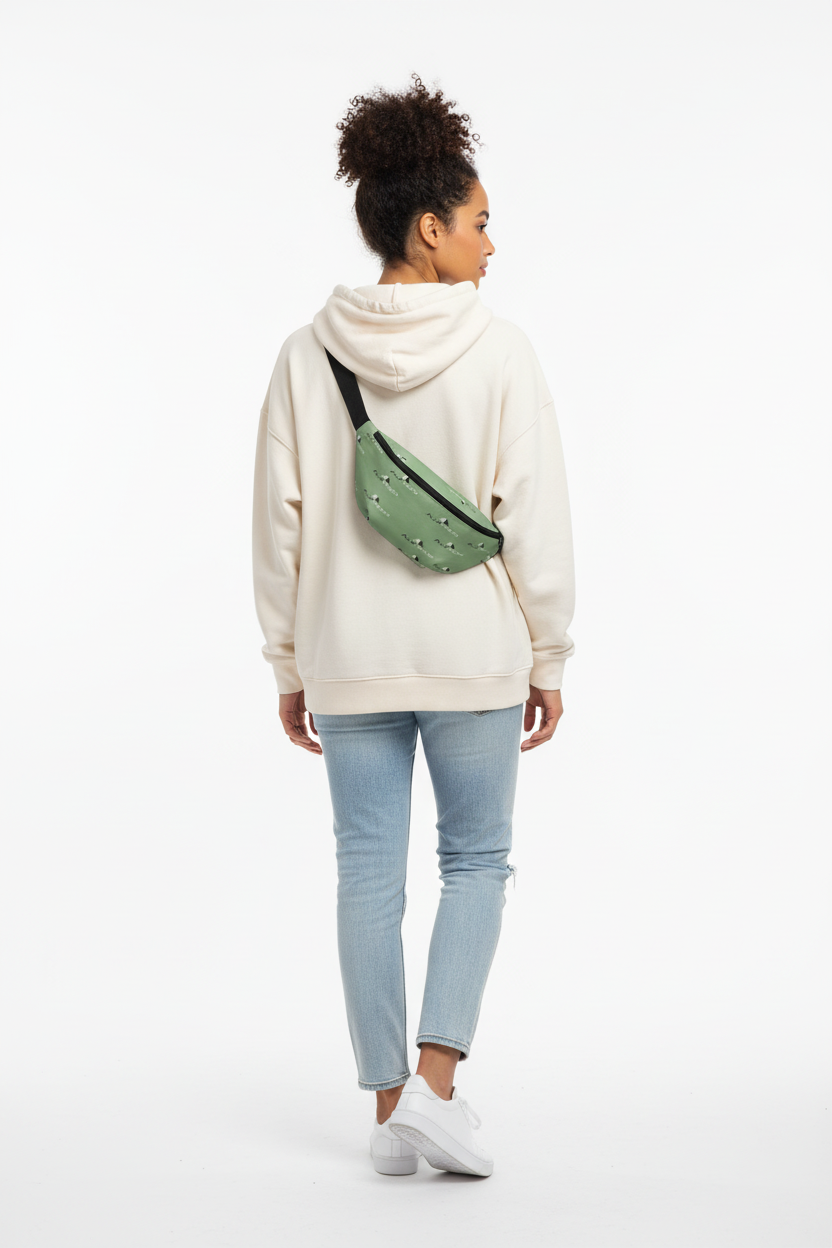 Carry your essentials with mountain-inspired style. The Alppeer Summit fanny pack features a serene sage green base with scattered mountain peak logos and Alppeer wordmarks, creating a clean outdoor aesthetic perfect for adventurers and urban explorers alike.