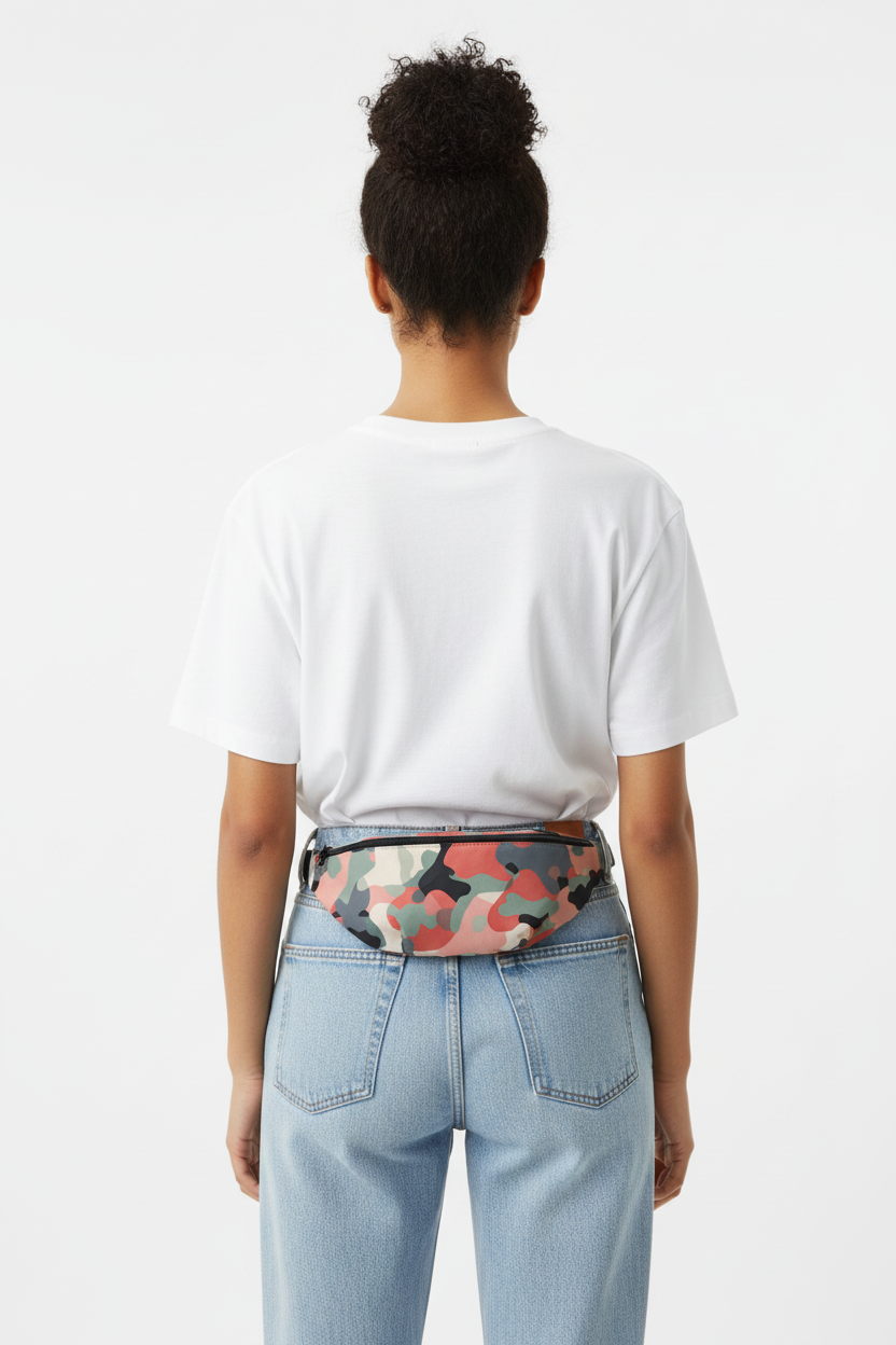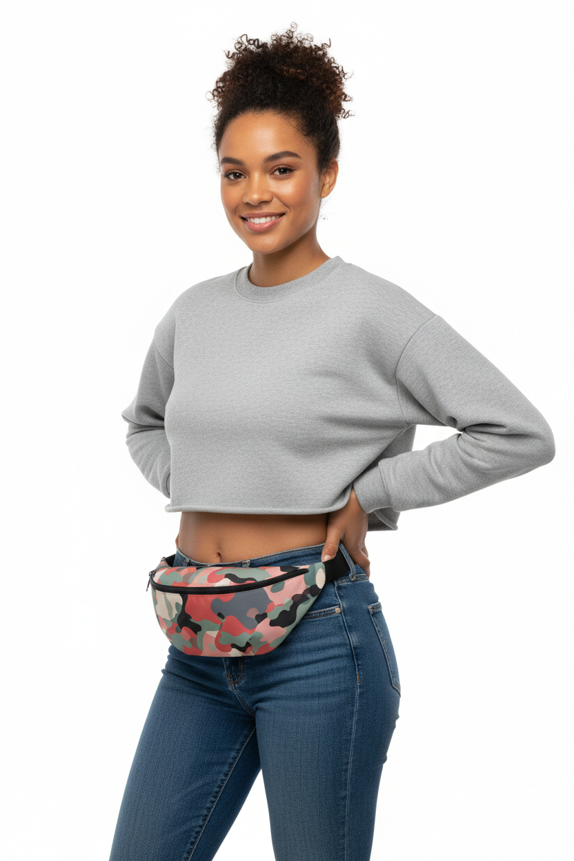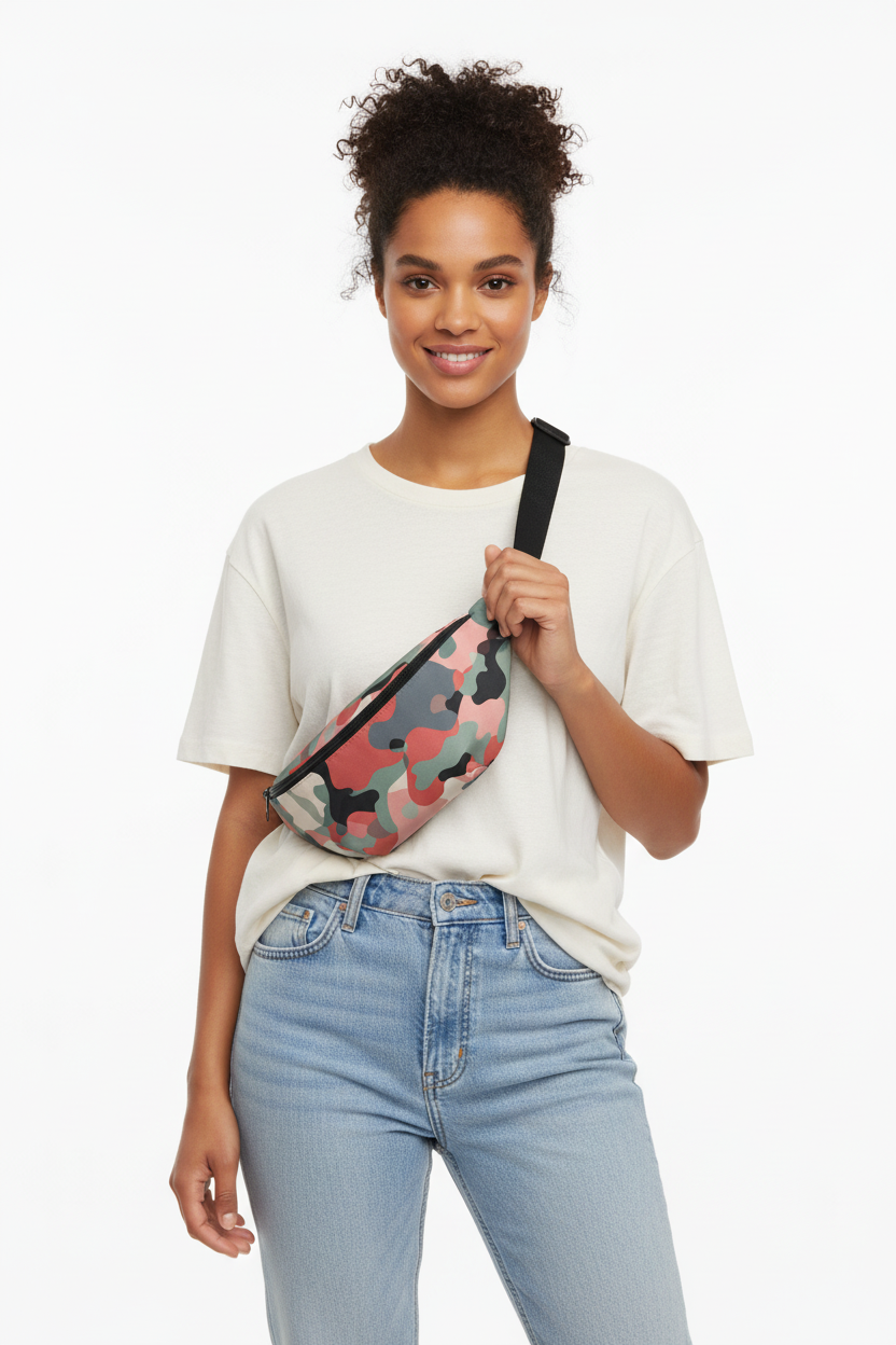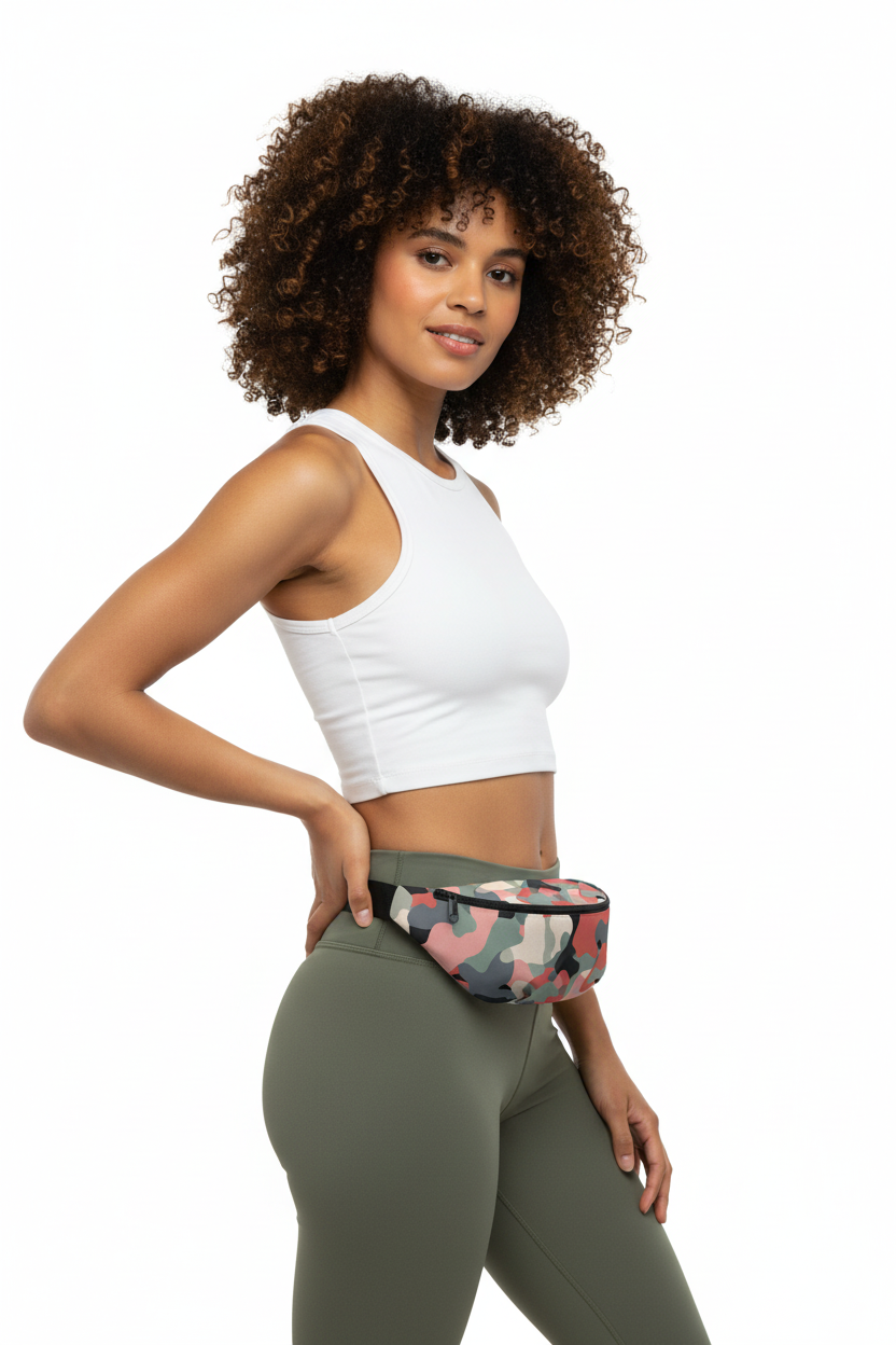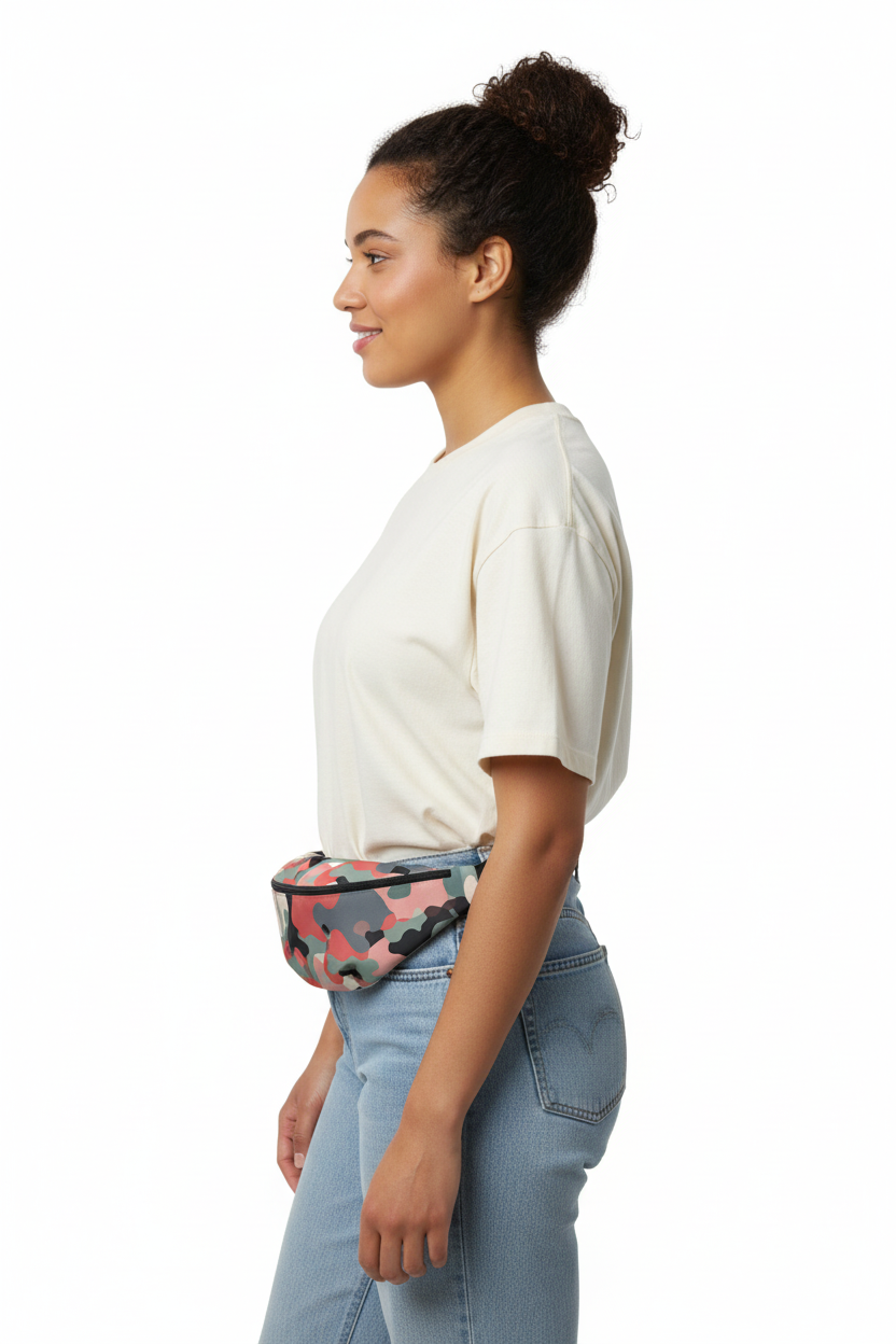 Stand out from the crowd with this modern camo twist. The Coral Camo fanny pack features a soft coral, sage, and charcoal camouflage pattern that reimagines tactical style with a feminine, contemporary edge.