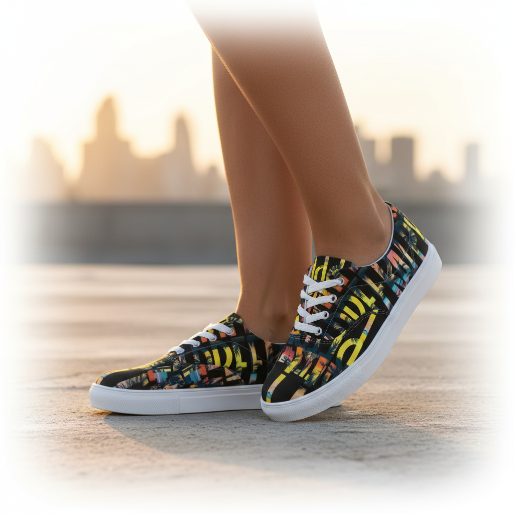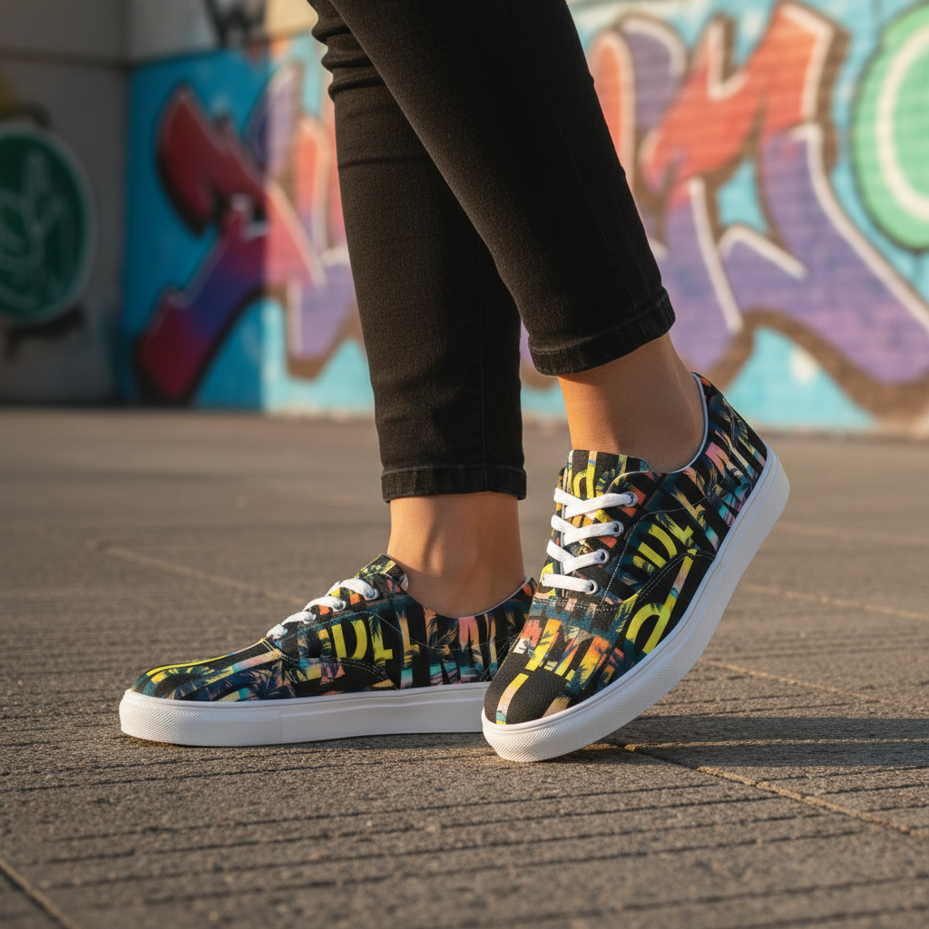 Transform your everyday style into a tropical getaway with our Dream in Paradise Women's Lace-Up Canvas Shoes. Featuring a vibrant palm print pattern in electric yellow, coral orange, ocean teal, and sunset pink against a bold black canvas, these shoes bring island energy to any outfit.