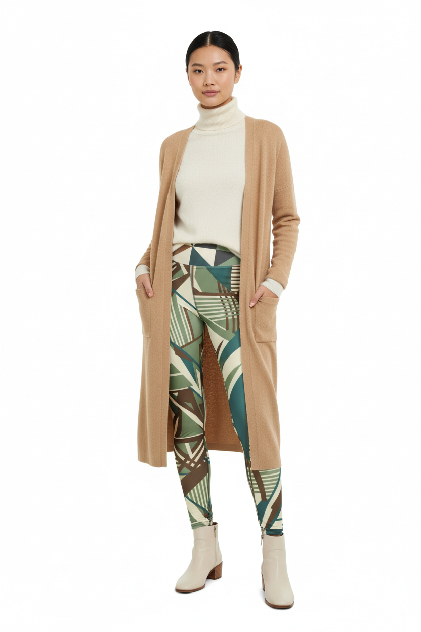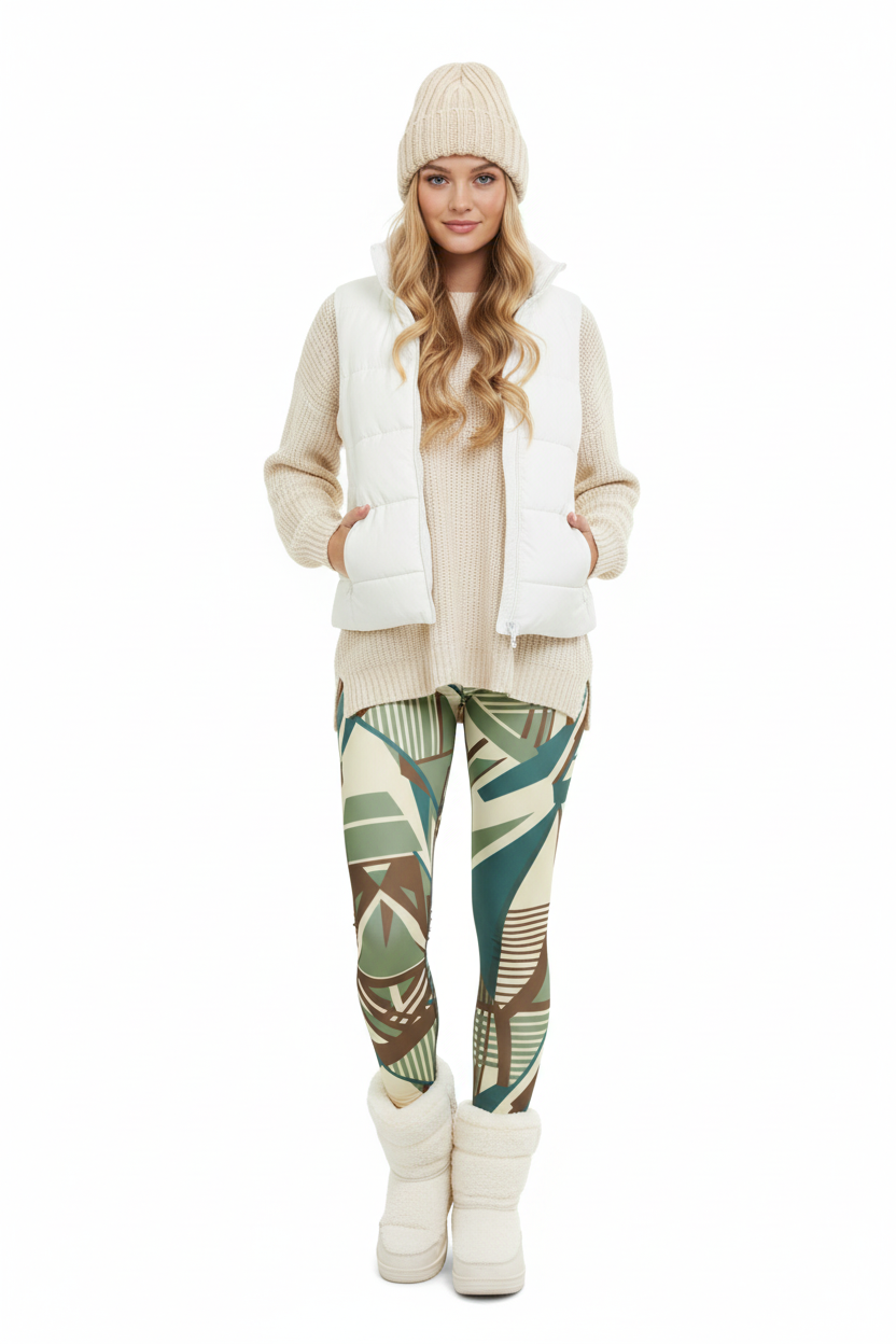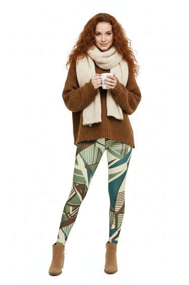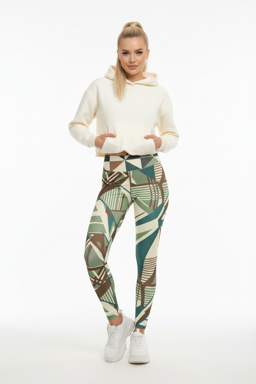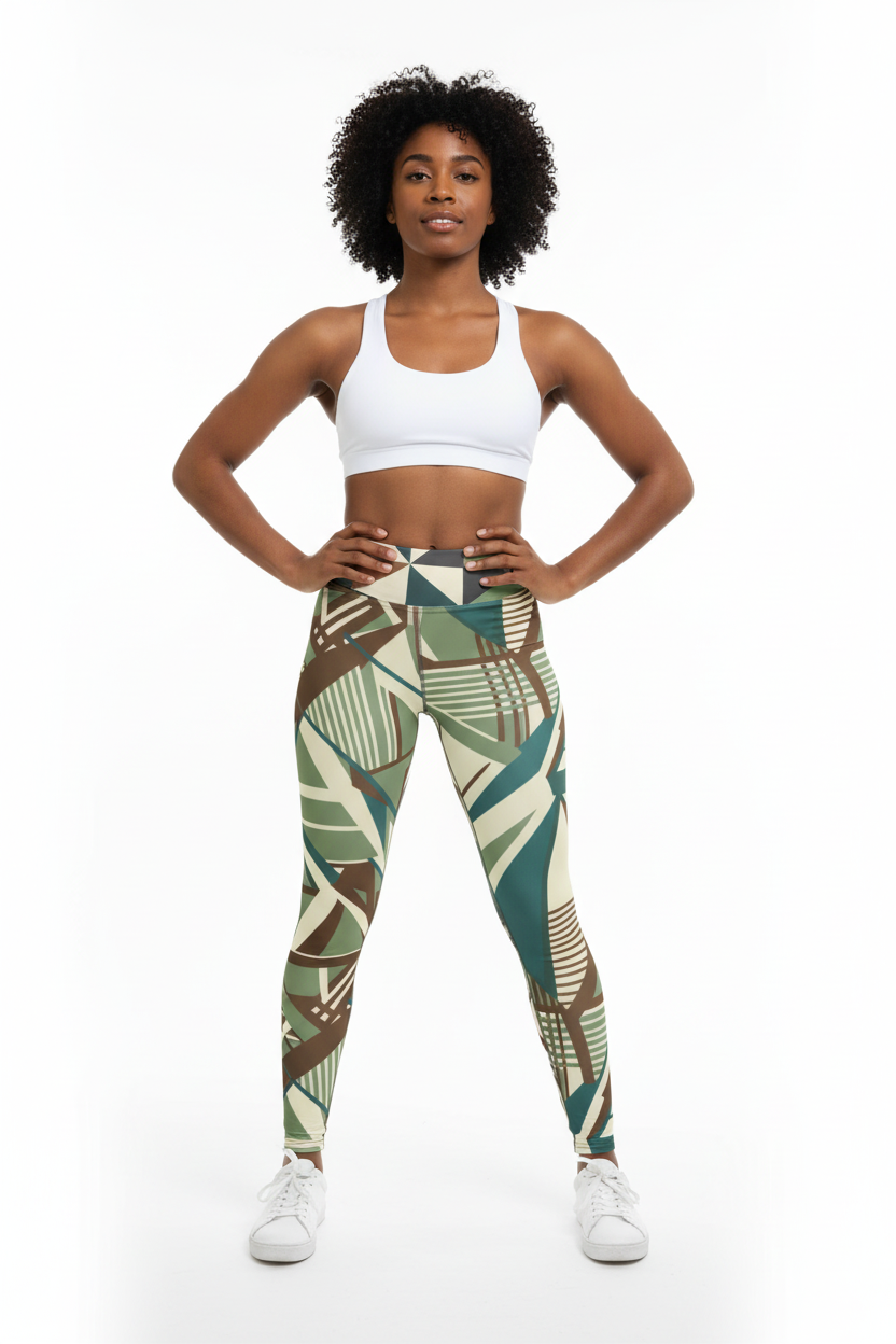 The Geometric Art Deco High-Waisted Yoga Leggings combine eye-catching style with premium performance fabric. Featuring an all-over print with sage green, cream, brown, and teal geometric patterns inspired by Art Deco design, these leggings are perfect for yoga, workouts, or everyday athleisure wear.