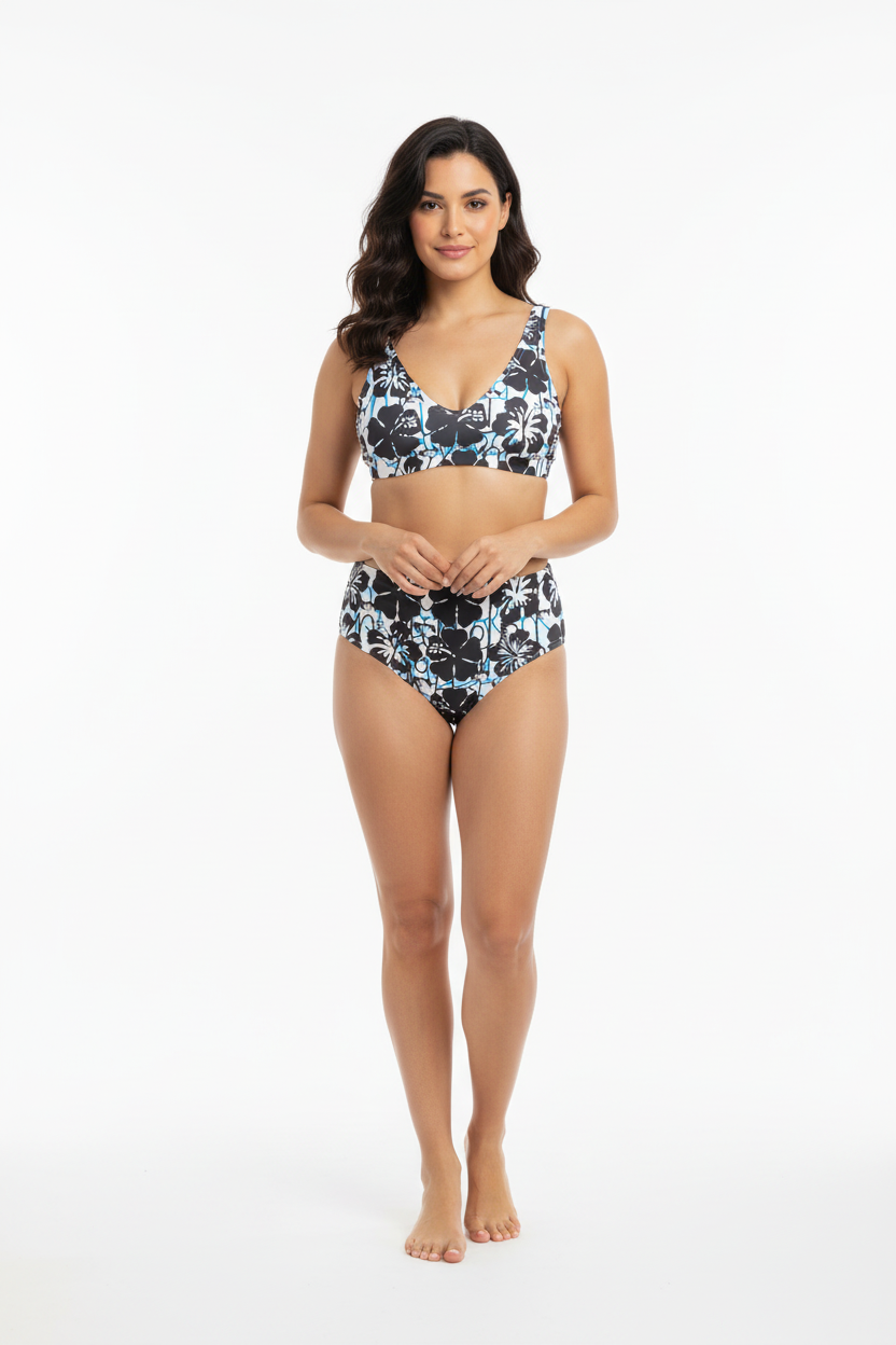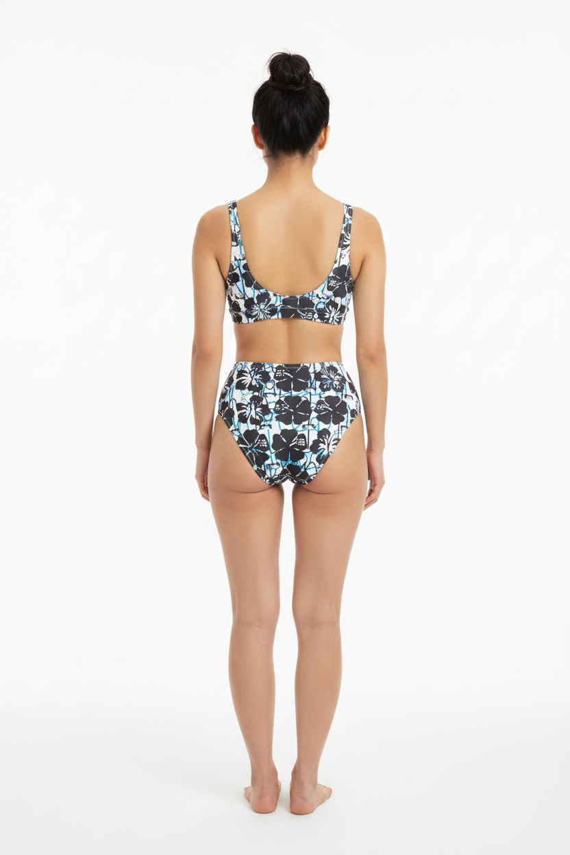 The Island Vibes High-Waisted Bikini brings tropical energy to your swimwear collection with its striking black and white hibiscus print accented by vibrant turquoise details. Made from premium recycled materials, this eco-conscious two-piece combines retro-inspired high-waisted coverage with modern sustainability.