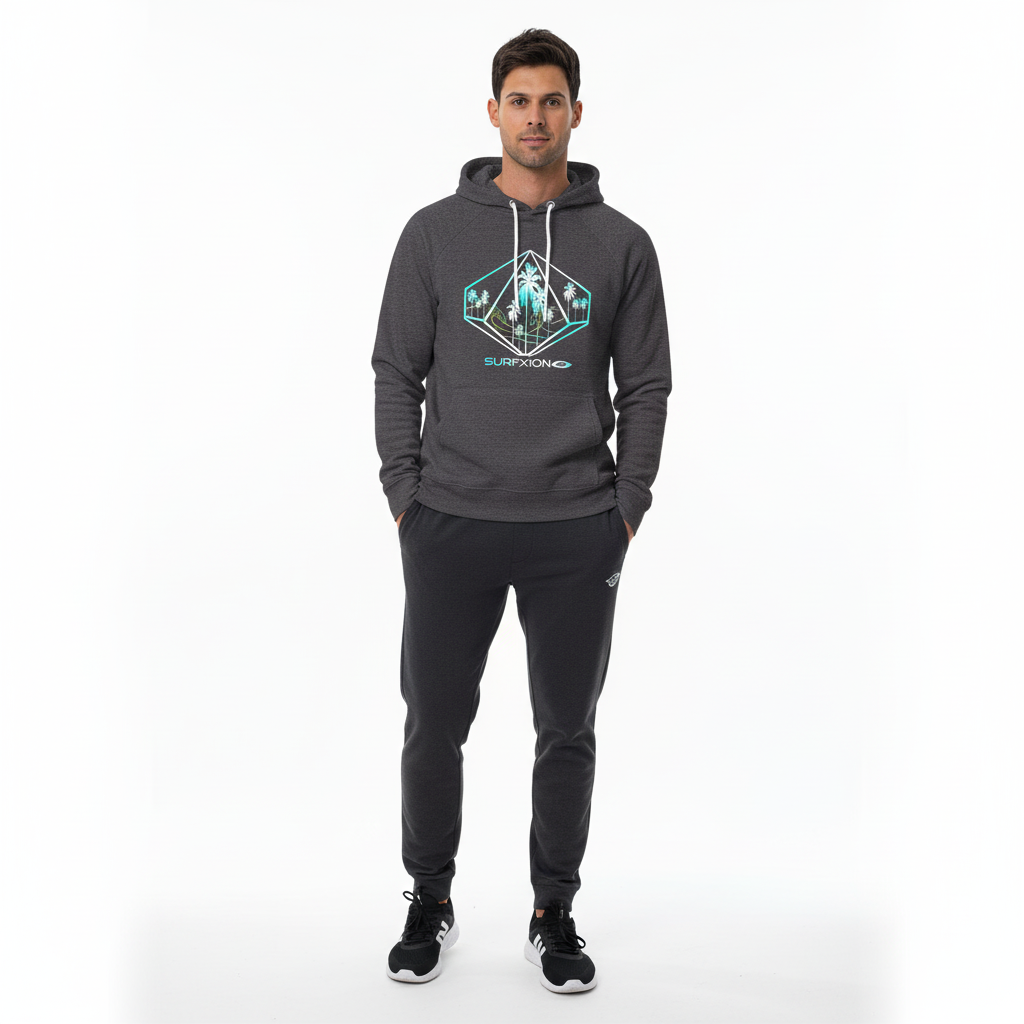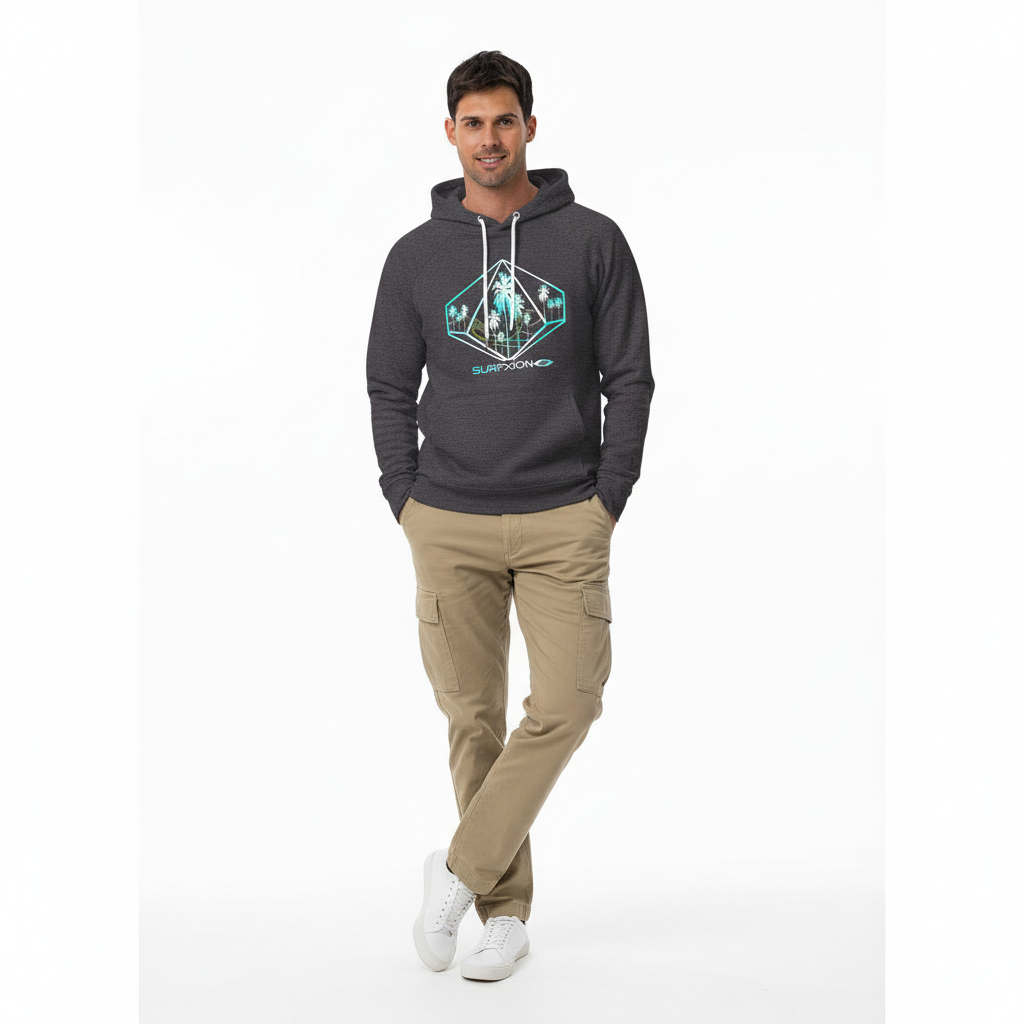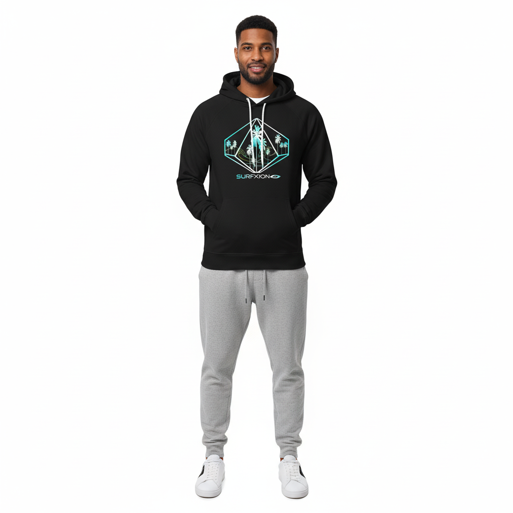 The Surf Riddle raglan hoodie combines athletic performance with surf culture aesthetics. Featuring a striking turquoise and white geometric diamond logo with palm tree silhouettes and the Surfxion brand, this premium eco-friendly hoodie is designed for those who embrace active lifestyles, outdoor adventures, and coastal living. Whether you're warming up after a surf session, hitting the gym, or exploring the city, this hoodie delivers comfort and standout style.