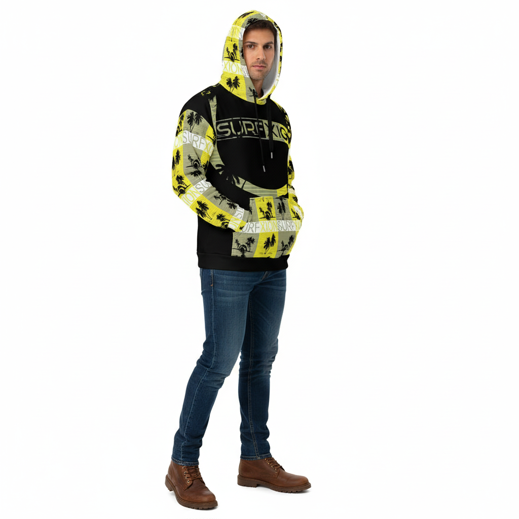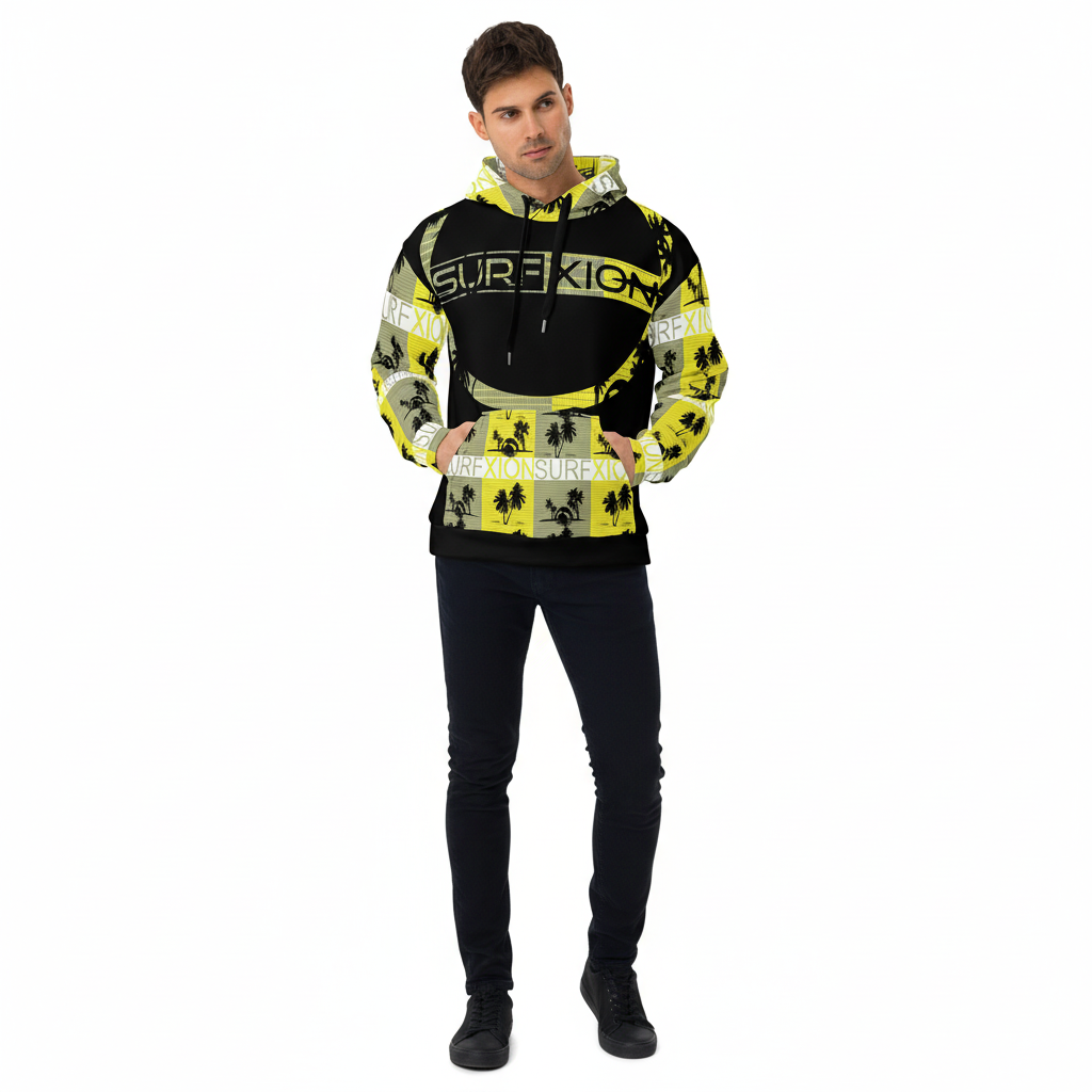 The Impact-zone hoodie brings bold surf culture to your everyday wardrobe. Featuring striking yellow and black Surfxion graphics with palm tree motifs, this premium all-over print hoodie is designed for those who live for the ocean, adventure, and authentic street style. Whether you're warming up after a surf session, exploring the city, or relaxing on the beach, this hoodie delivers comfort and standout style.