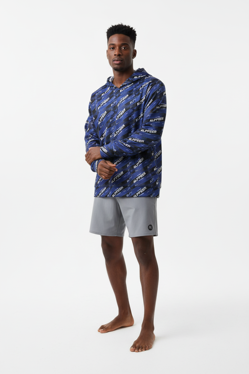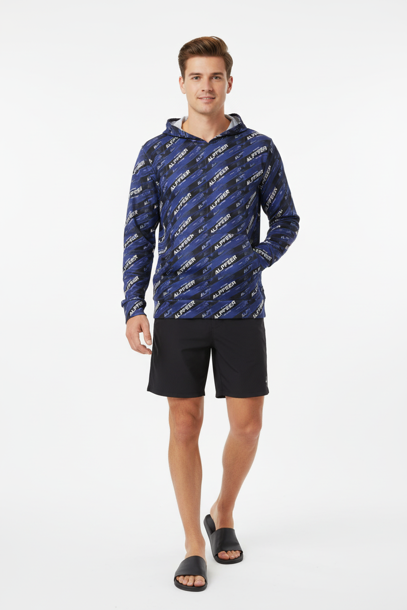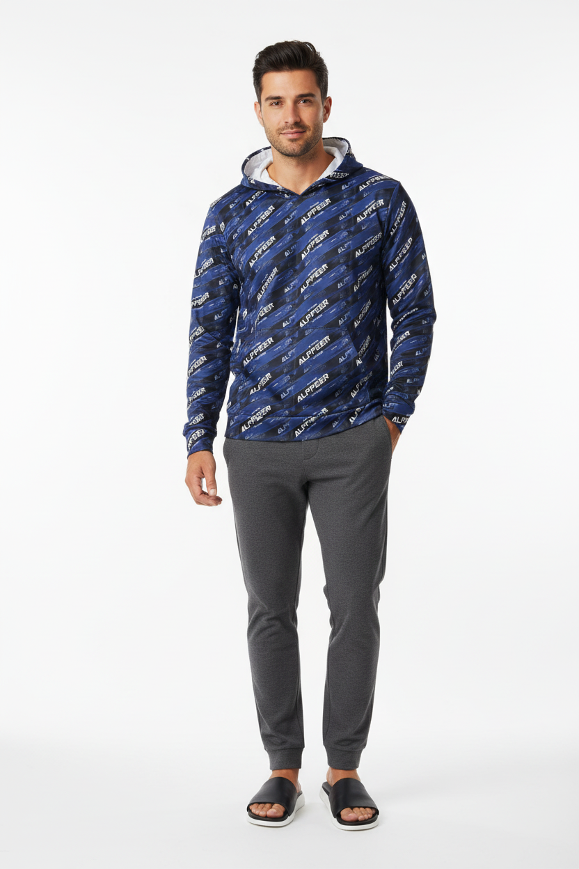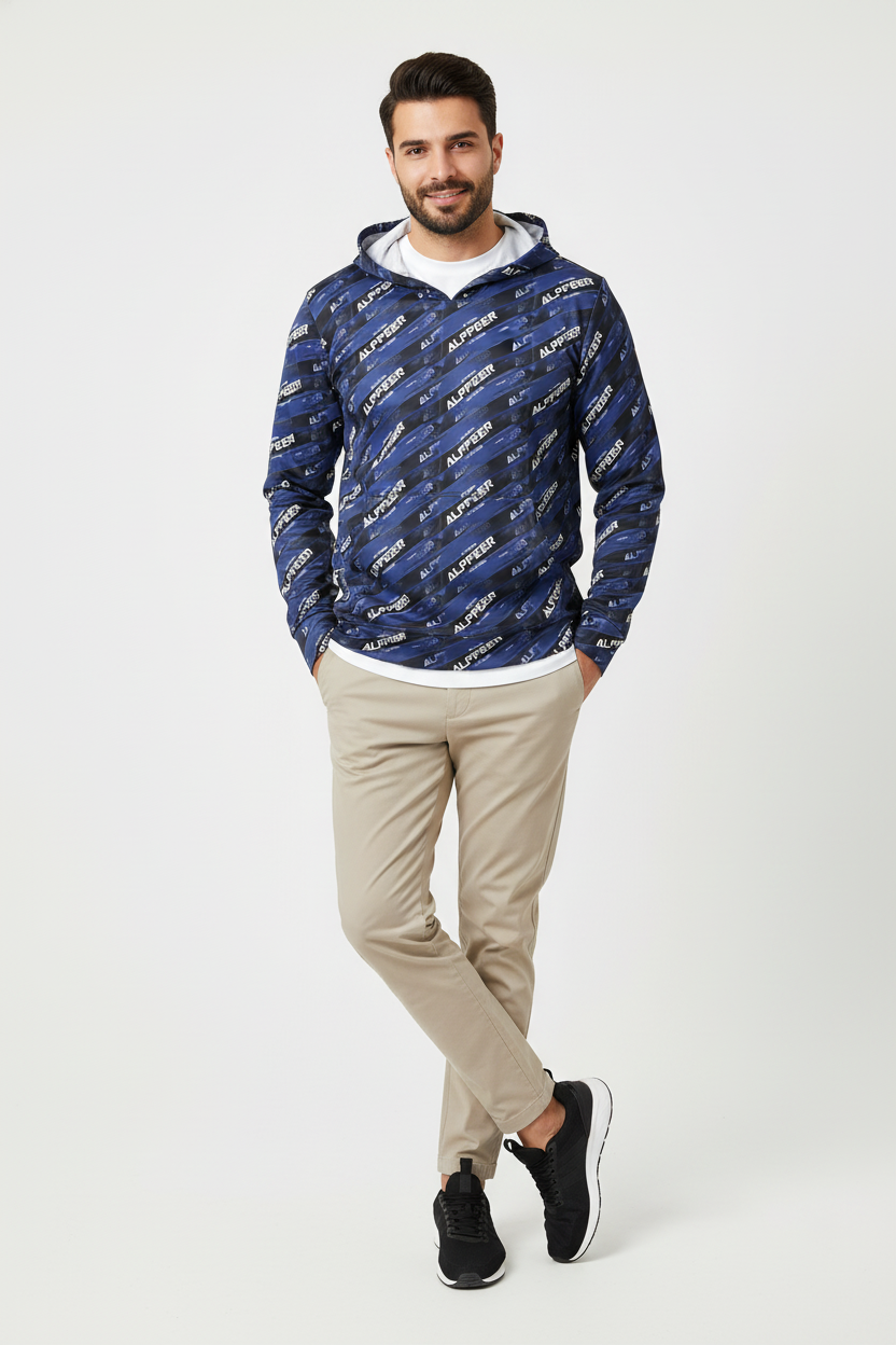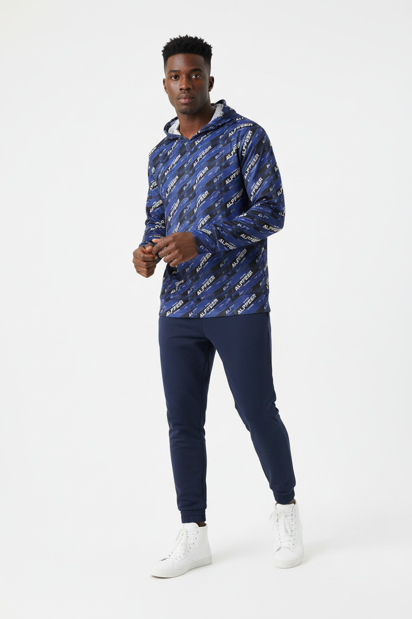 Make your mark in the Alppeer Diagonal Stripe Sports Warmup Hoodie—where bold branding meets athletic performance. This all-over print sports warmup hoodie features a dynamic diagonal stripe pattern with repeating Alppeer branding in white against a deep navy blue and black base, creating a striking, modern aesthetic that commands attention.
