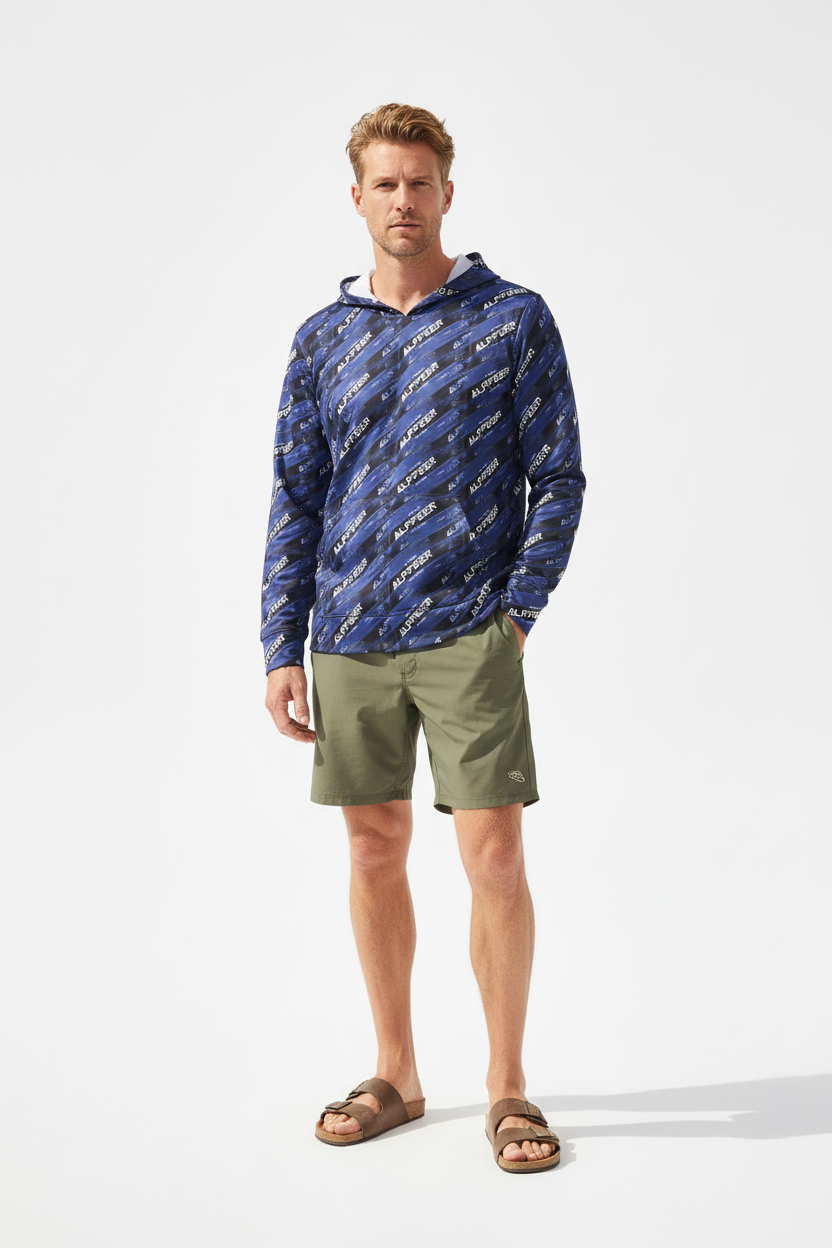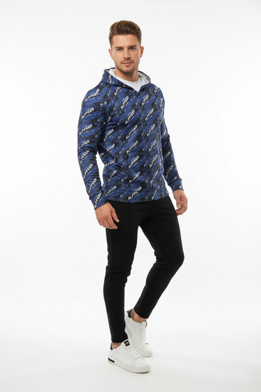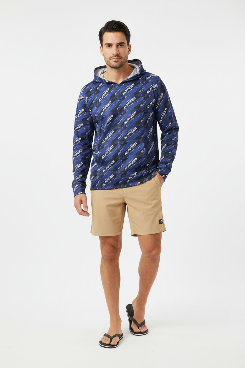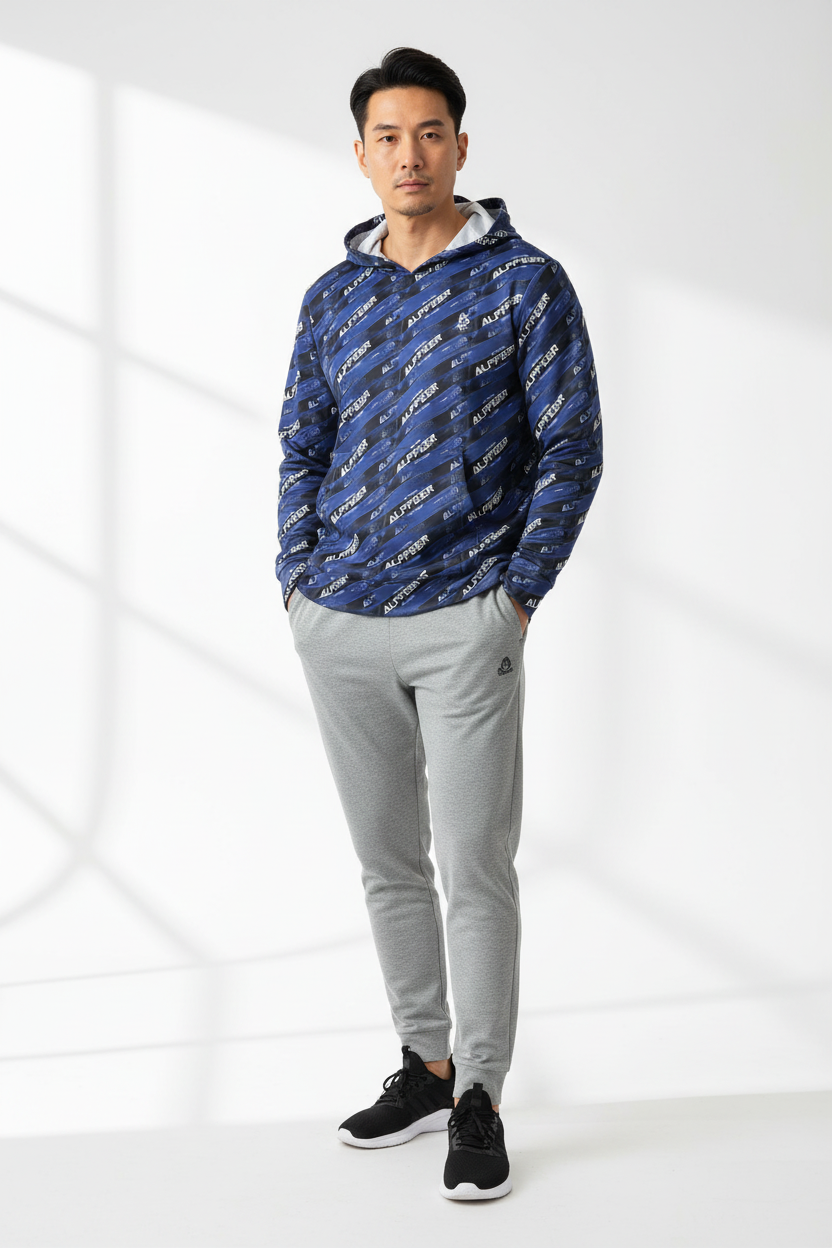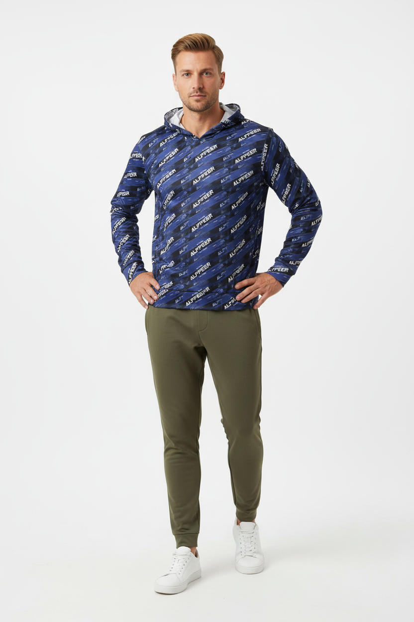 Make your mark in the Alppeer Diagonal Stripe Sports Warmup Hoodie—where bold branding meets athletic performance. This all-over print sports warmup hoodie features a dynamic diagonal stripe pattern with repeating Alppeer branding in white against a deep navy blue and black base, creating a striking, modern aesthetic that commands attention.