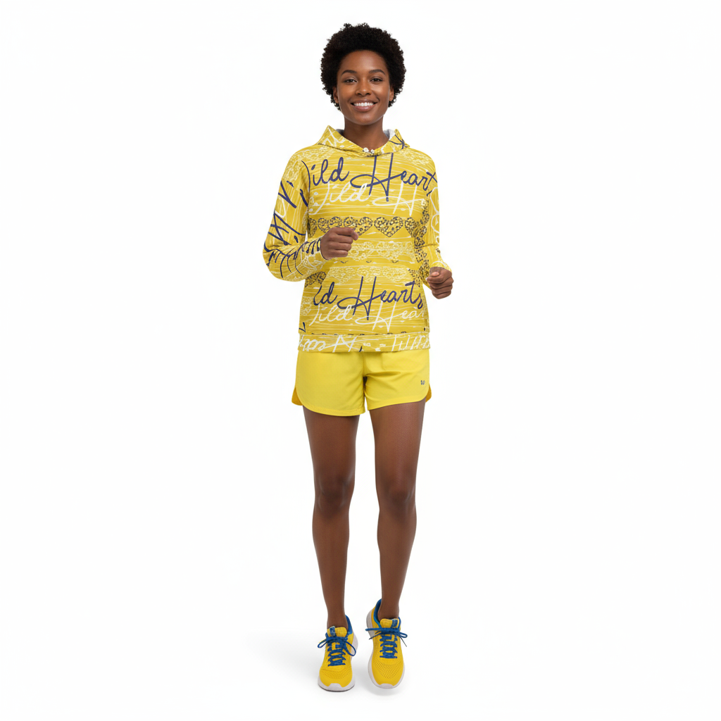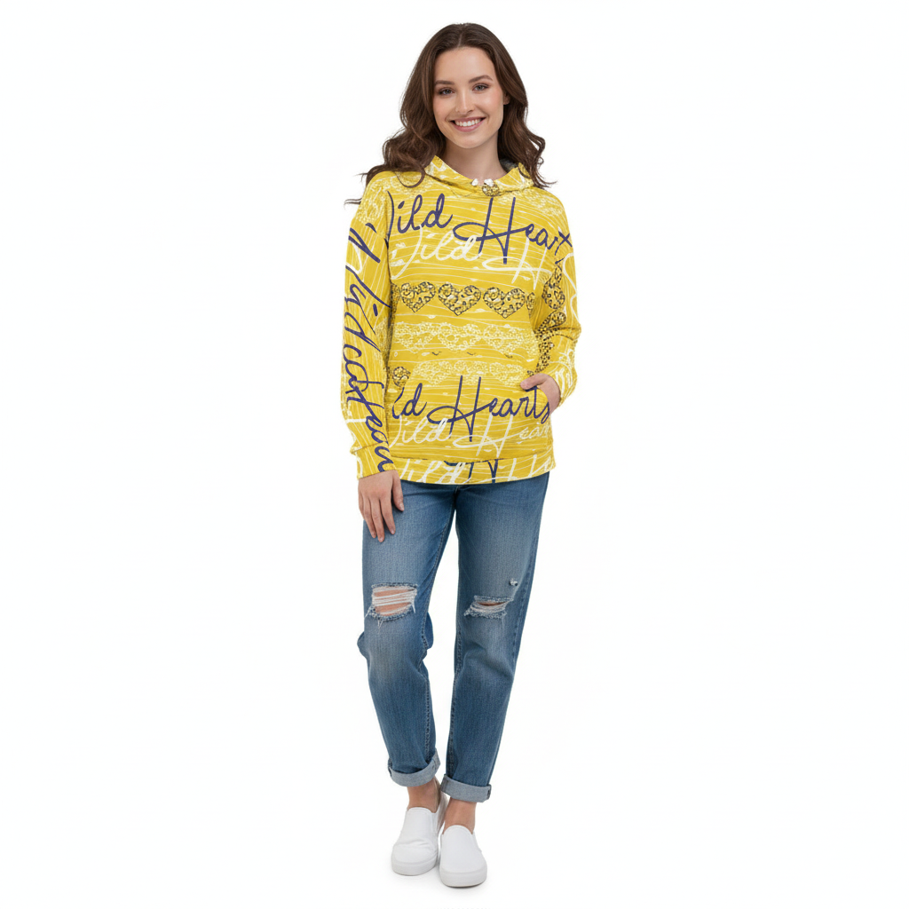 Make a statement in the Wild Hearts Women's Hoodie—where bold graphic expression meets conscious design. This vibrant yellow hoodie features an all-over print of hand-drawn script and geometric bandana motifs, creating a dynamic visual that refuses to blend in.