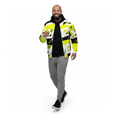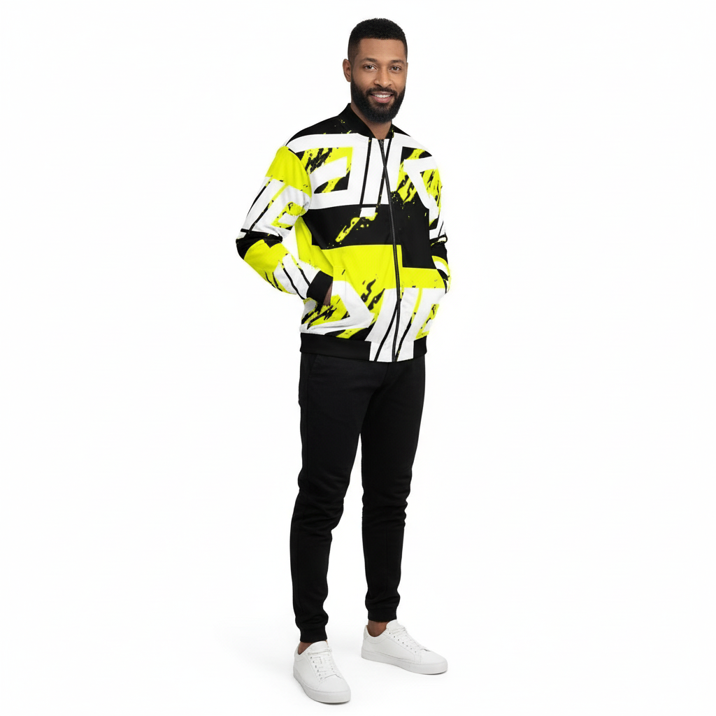 Elevate your outerwear game with the AIR Bomber Jacket. Featuring a striking white grid pattern with bold neon yellow accents, this premium bomber jacket combines futuristic design with classic streetwear silhouette for a look that commands attention.