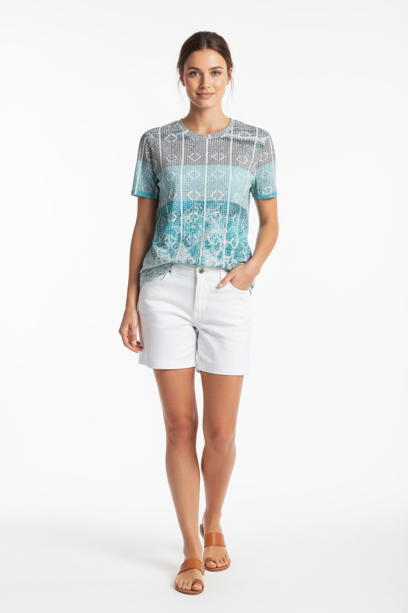 - Eye-catching gradient mosaic pattern in gray and turquoise tones
