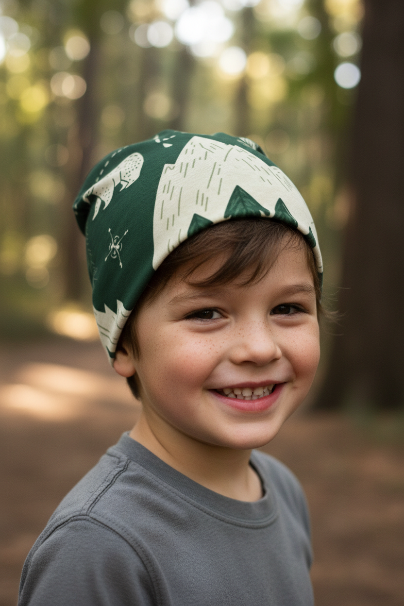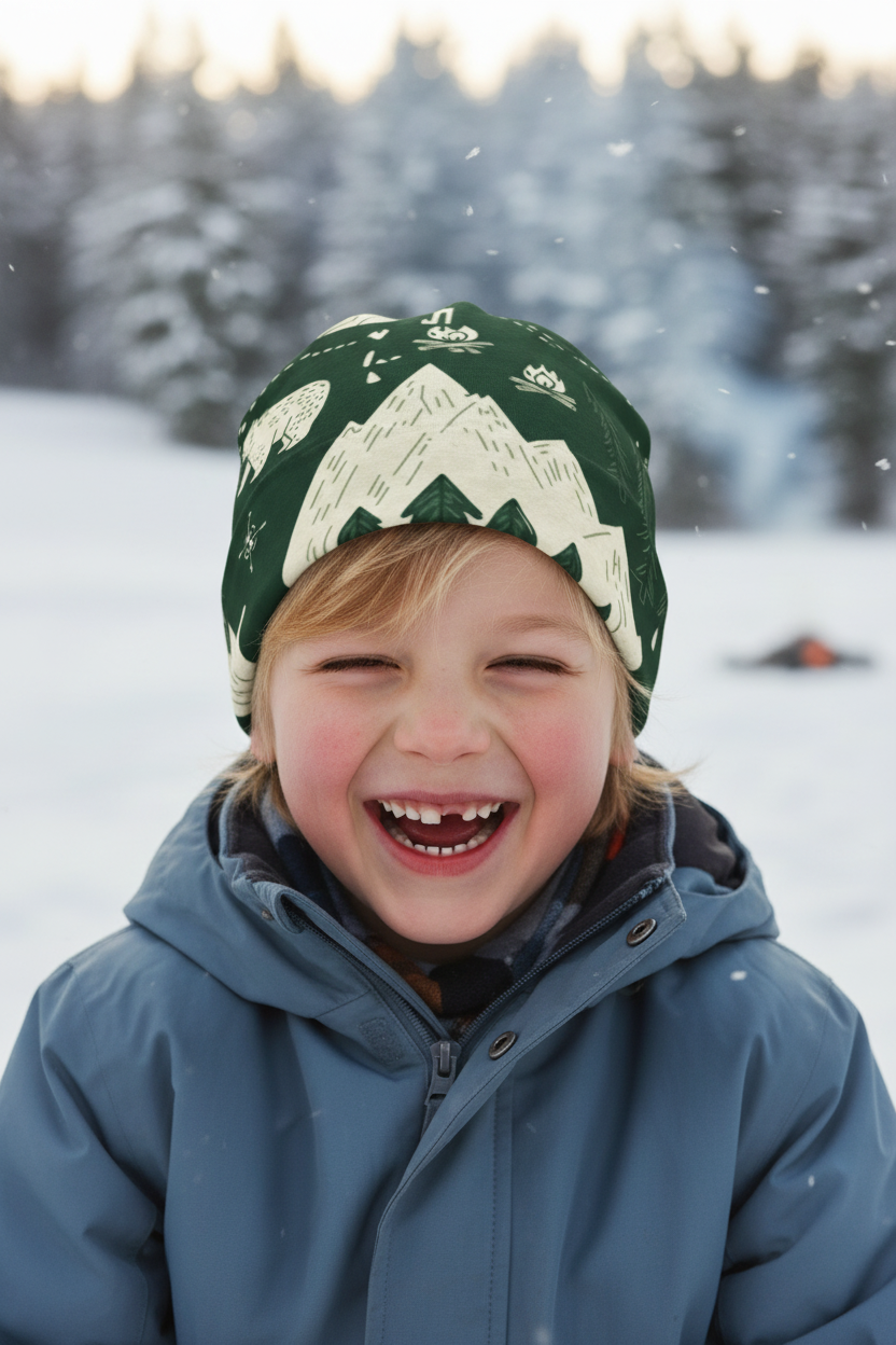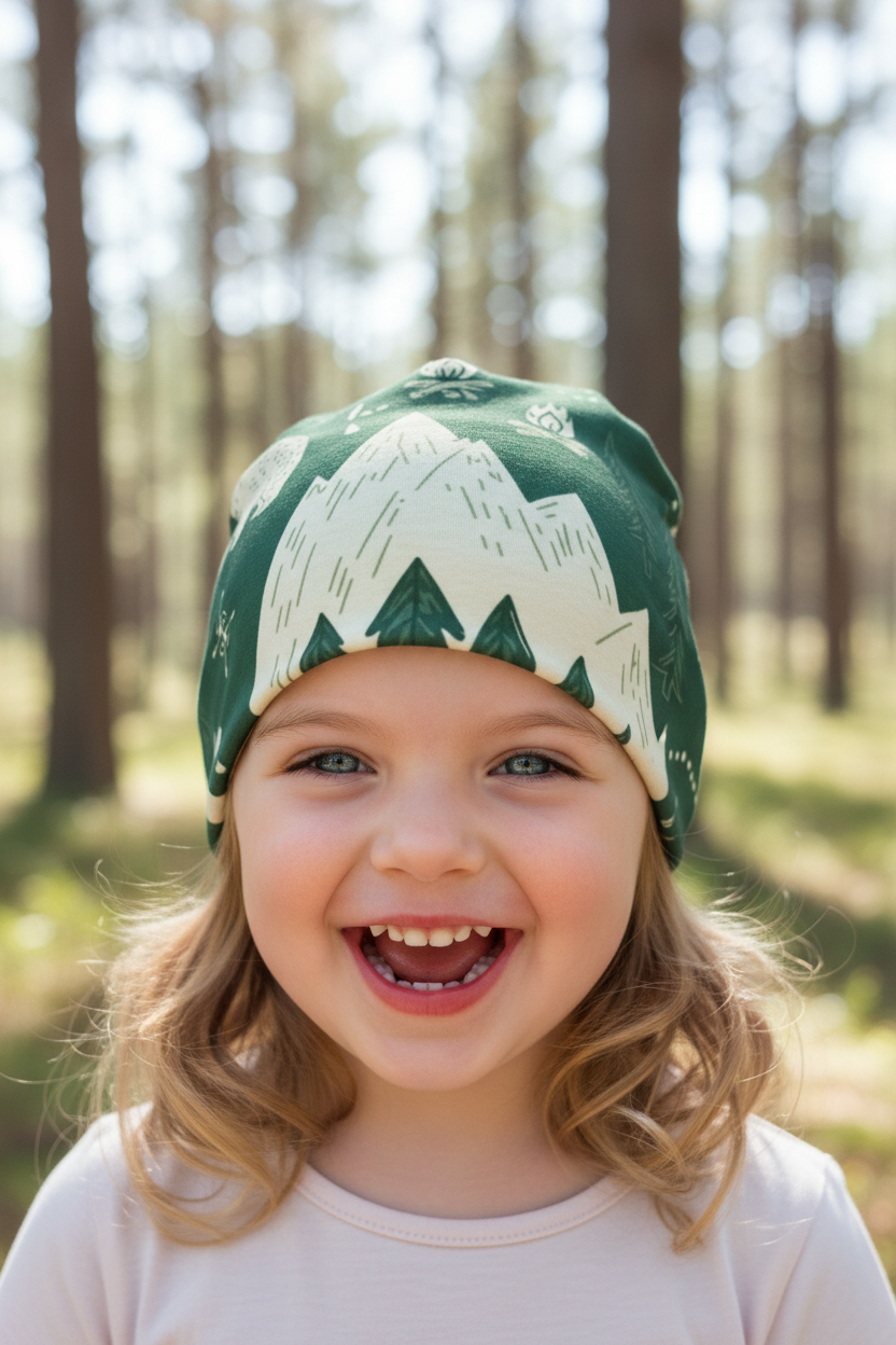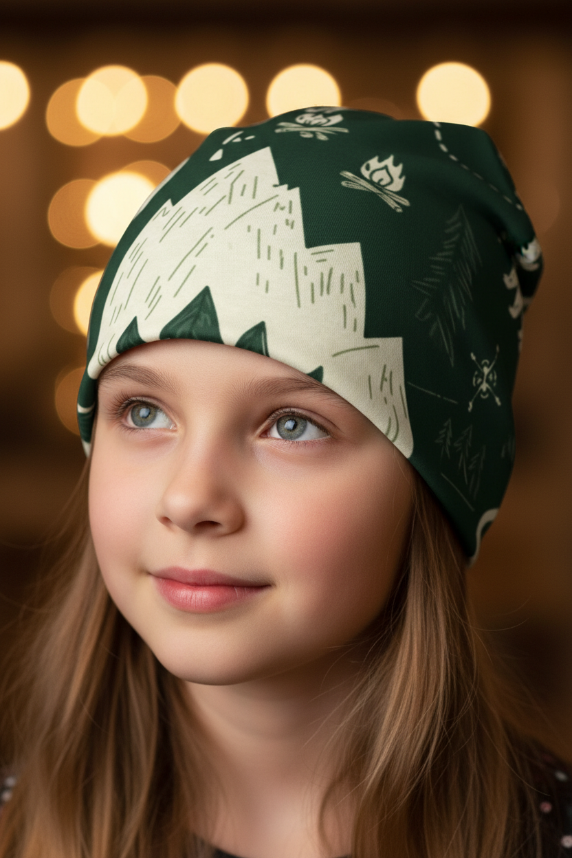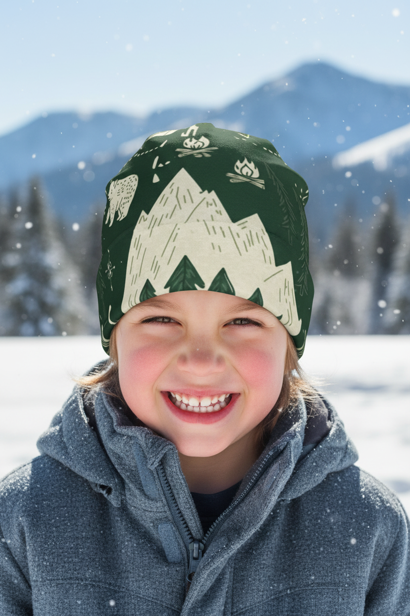 Where the wild things roam. This striking all-over print beanie captures the spirit of mountain adventures with hand-drawn bears, snow-capped peaks, crackling campfires, and towering pines—all set against a rich forest green backdrop. Perfect for young explorers ages 4-11 who dream of wilderness adventures.
