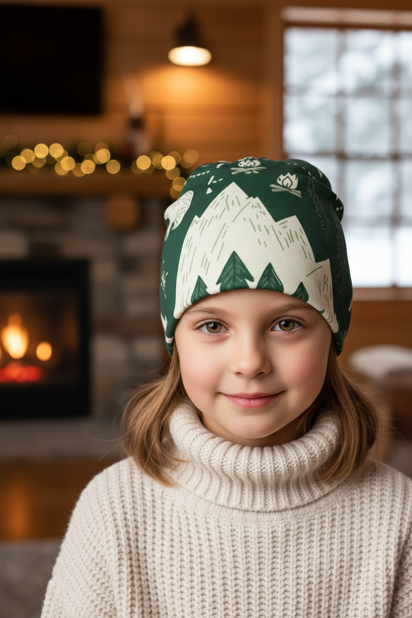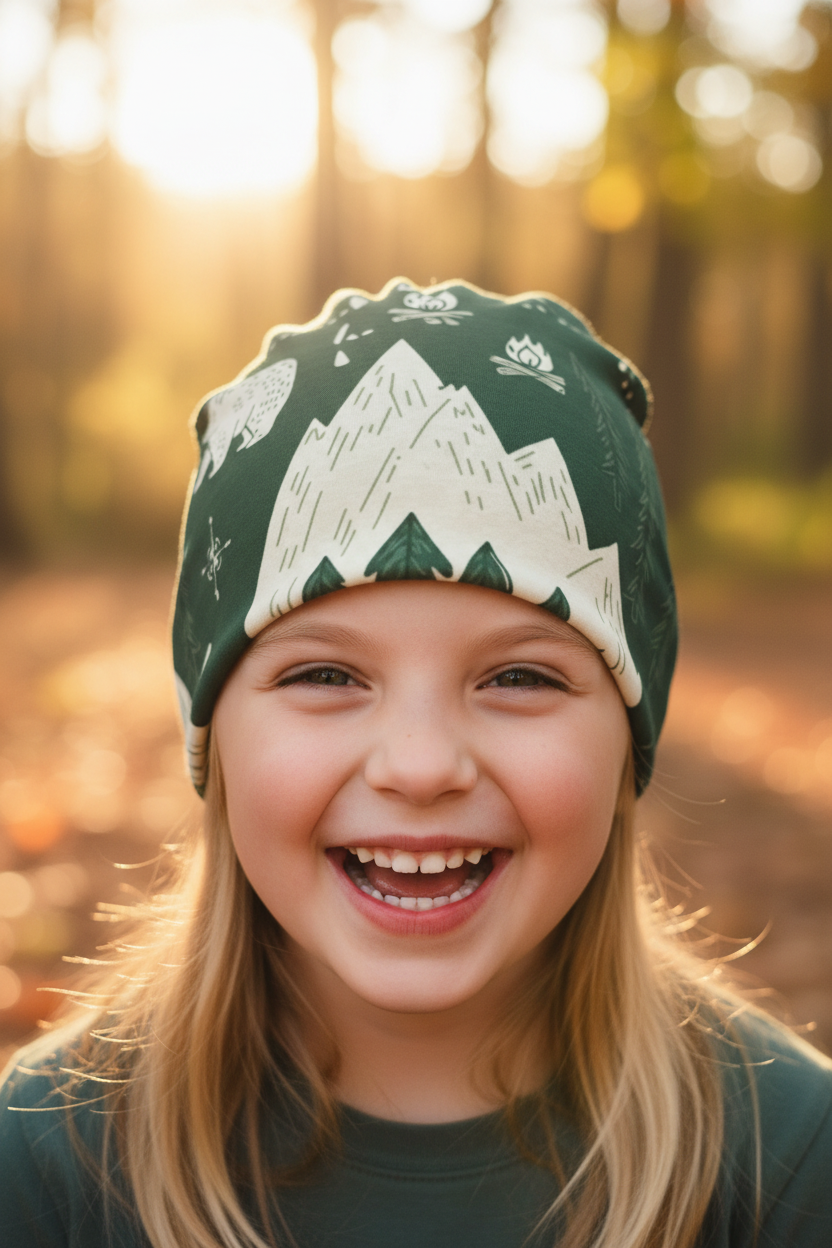 This beanie brings the majesty of the mountains and the magic of wilderness camping to everyday wear. For the kid who's always ready for the next adventure.