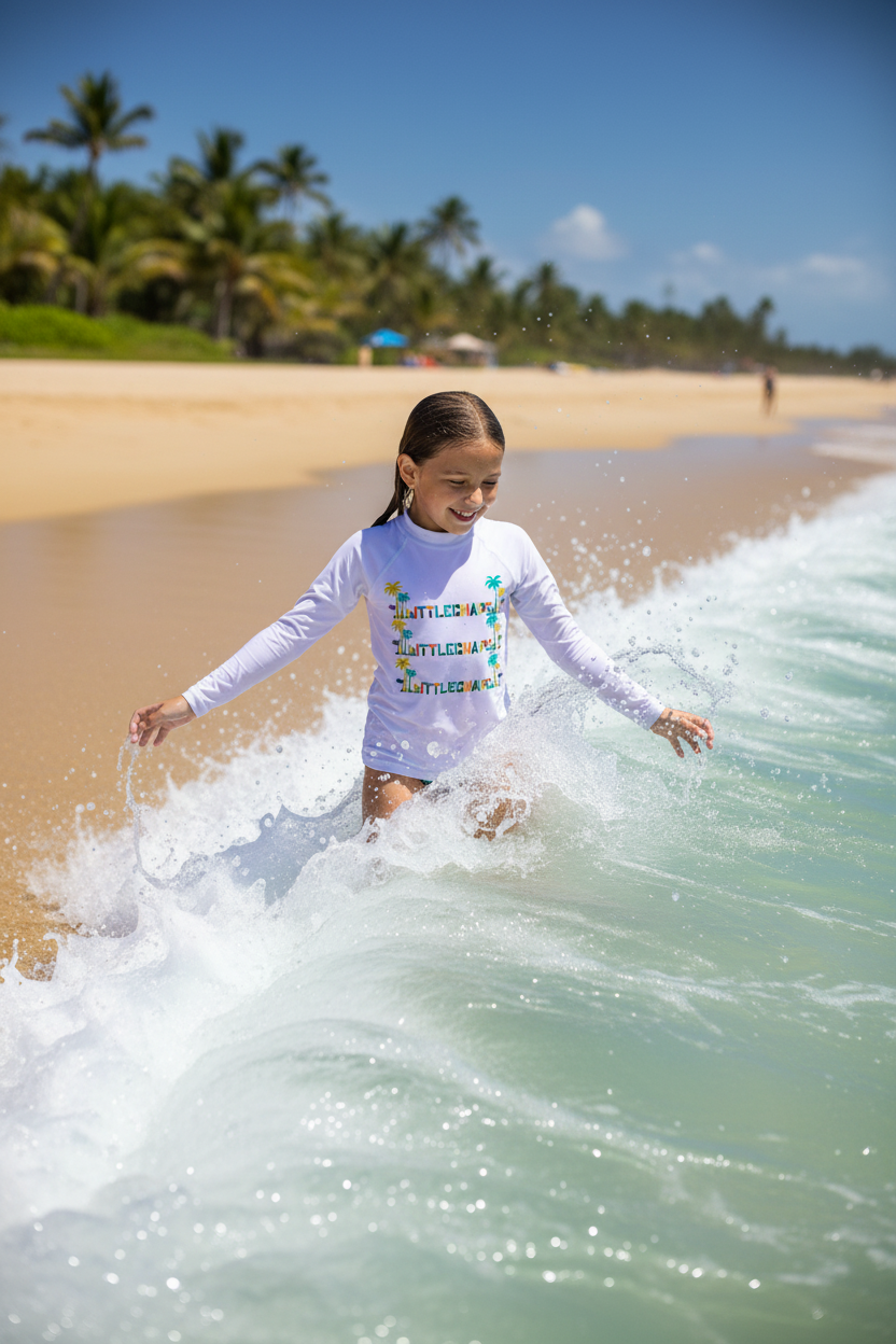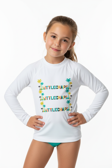Whether they're building sandcastles, snorkeling, surfing, or just playing at the pool, this rash guard keeps them protected and looking cool. The bold LITTLECHAPS branding and tropical palm tree pattern make it a standout piece that transitions seamlessly from water activities to everyday summer adventures.
