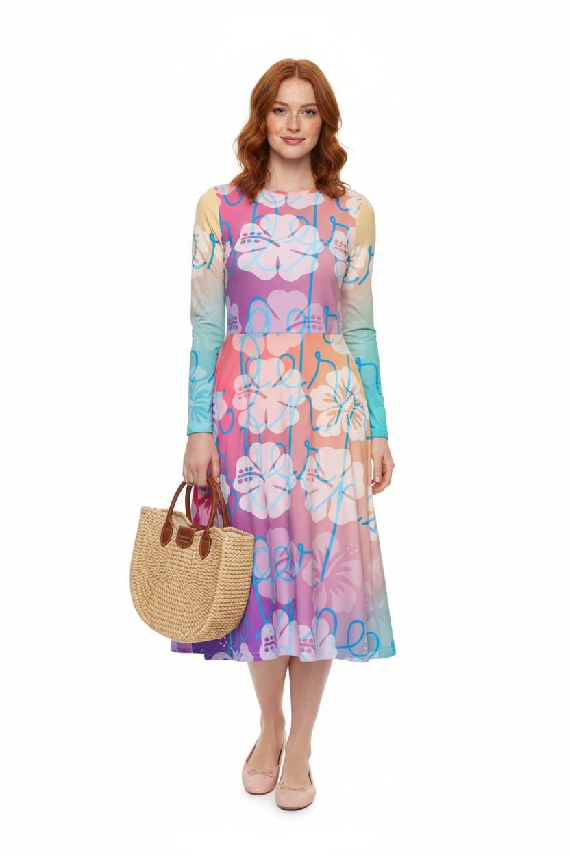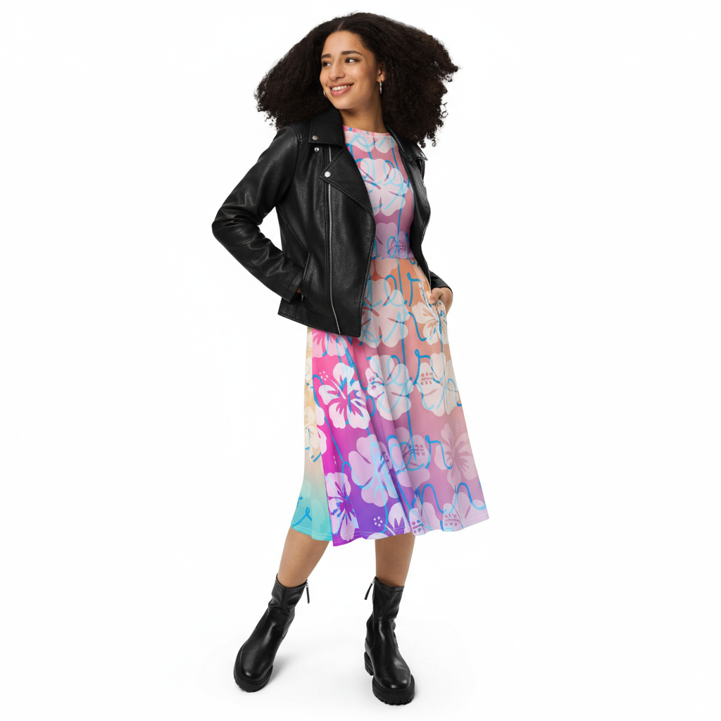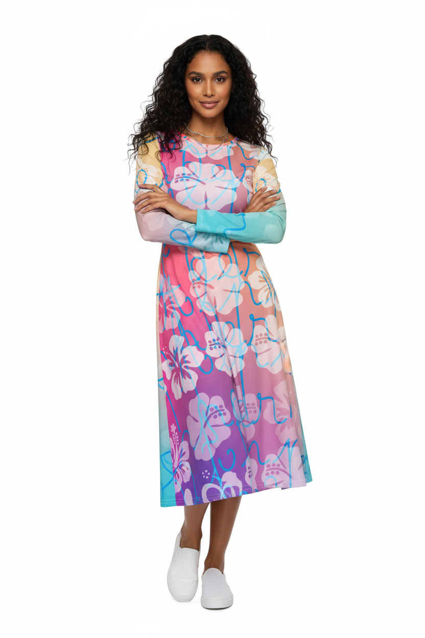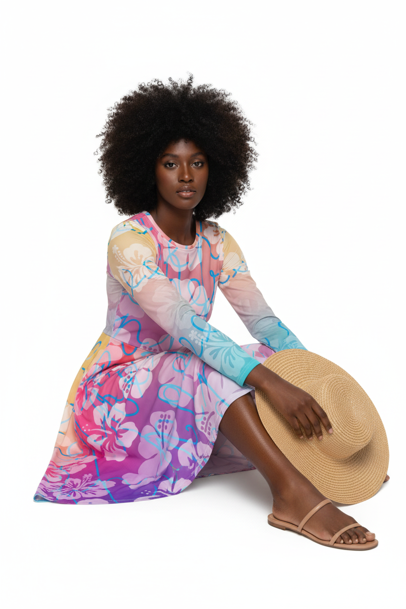 Transport yourself to paradise with the Tropical Sunset Midi Dress—a stunning celebration of island-inspired style and effortless elegance. This eye-catching dress features a vibrant hibiscus print in a dreamy gradient of turquoise, coral, pink, and purple hues that capture the magic of a tropical sunset.