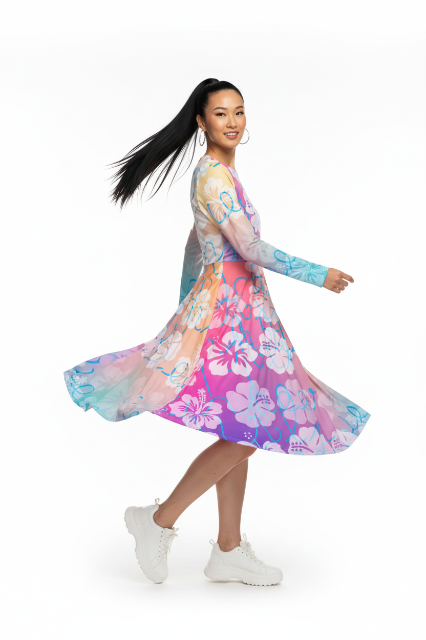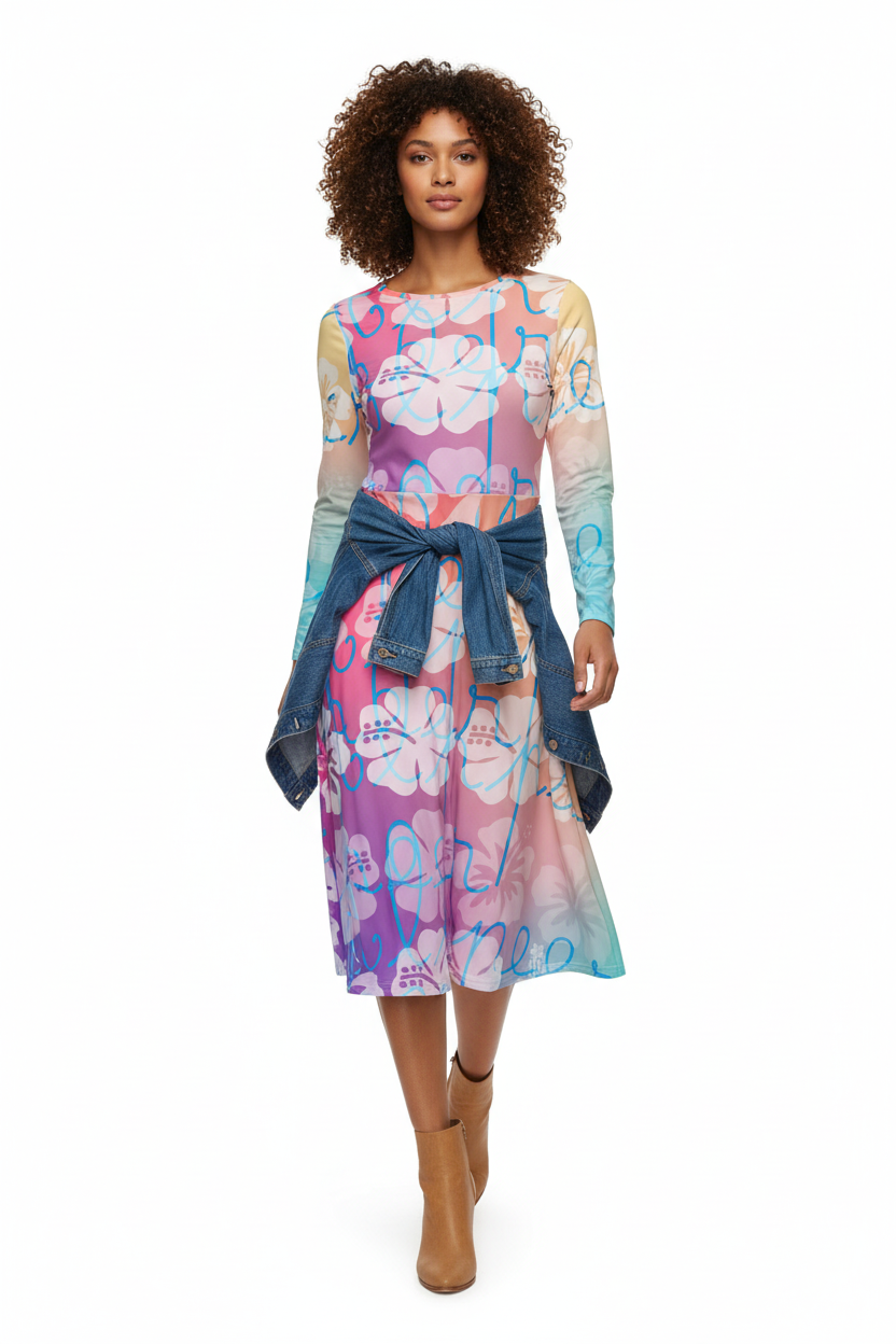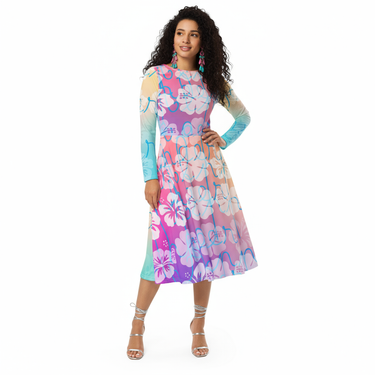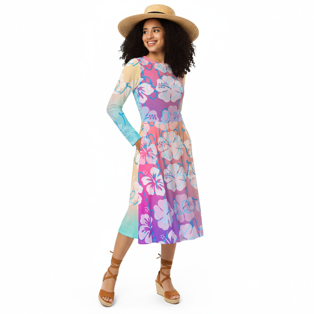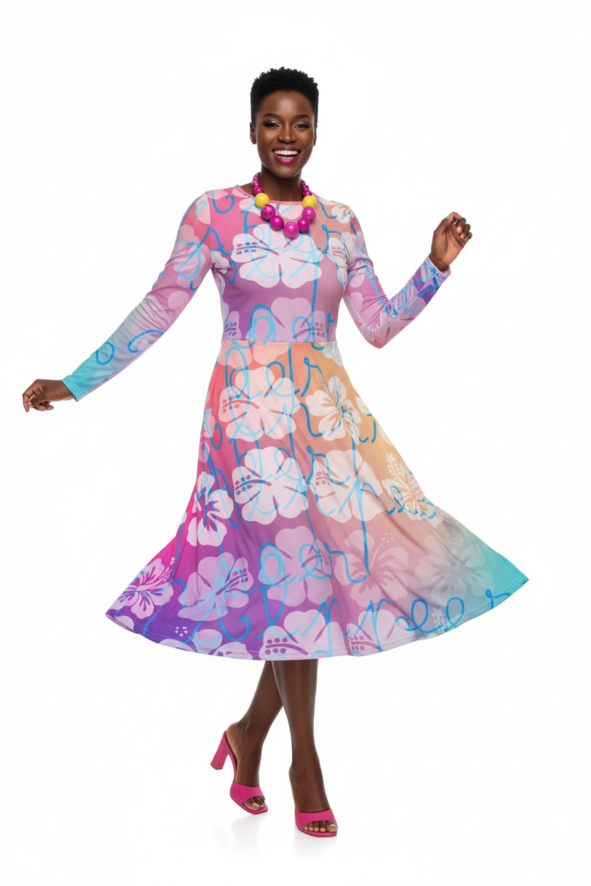 Transport yourself to paradise with the Tropical Sunset Midi Dress—a stunning celebration of island-inspired style and effortless elegance. This eye-catching dress features a vibrant hibiscus print in a dreamy gradient of turquoise, coral, pink, and purple hues that capture the magic of a tropical sunset.