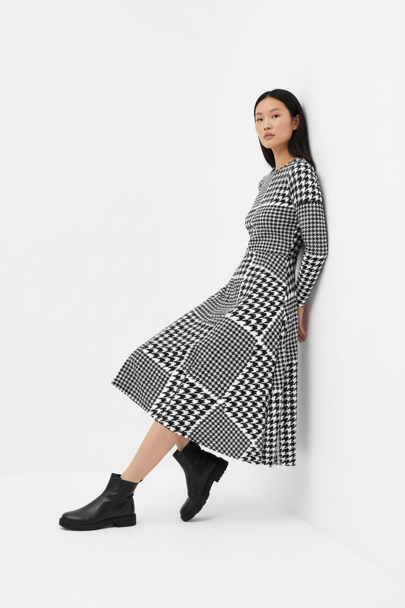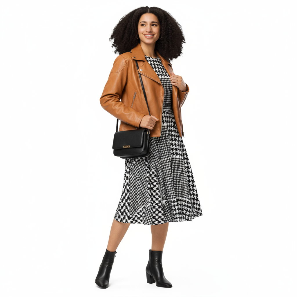 Pair with a tan leather jacket, black ankle boots, and a crossbody bag for sophisticated fall style. The classic houndstooth pattern contrasts beautifully with the leather for a chic, modern look perfect for weekend outings or casual dinners.