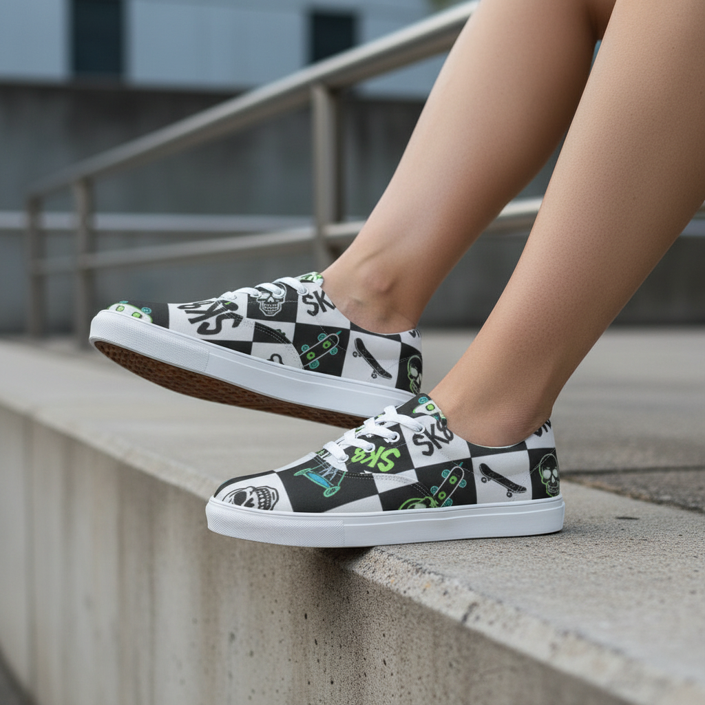 Roll into bold style with the SK8 Checkered Skull Men's Canvas Shoes—where skate culture meets edgy street art. These eye-catching kicks feature a striking black and white checkered pattern adorned with skulls, skateboards, and graffiti-style 'SK8' graphics that scream attitude and individuality.