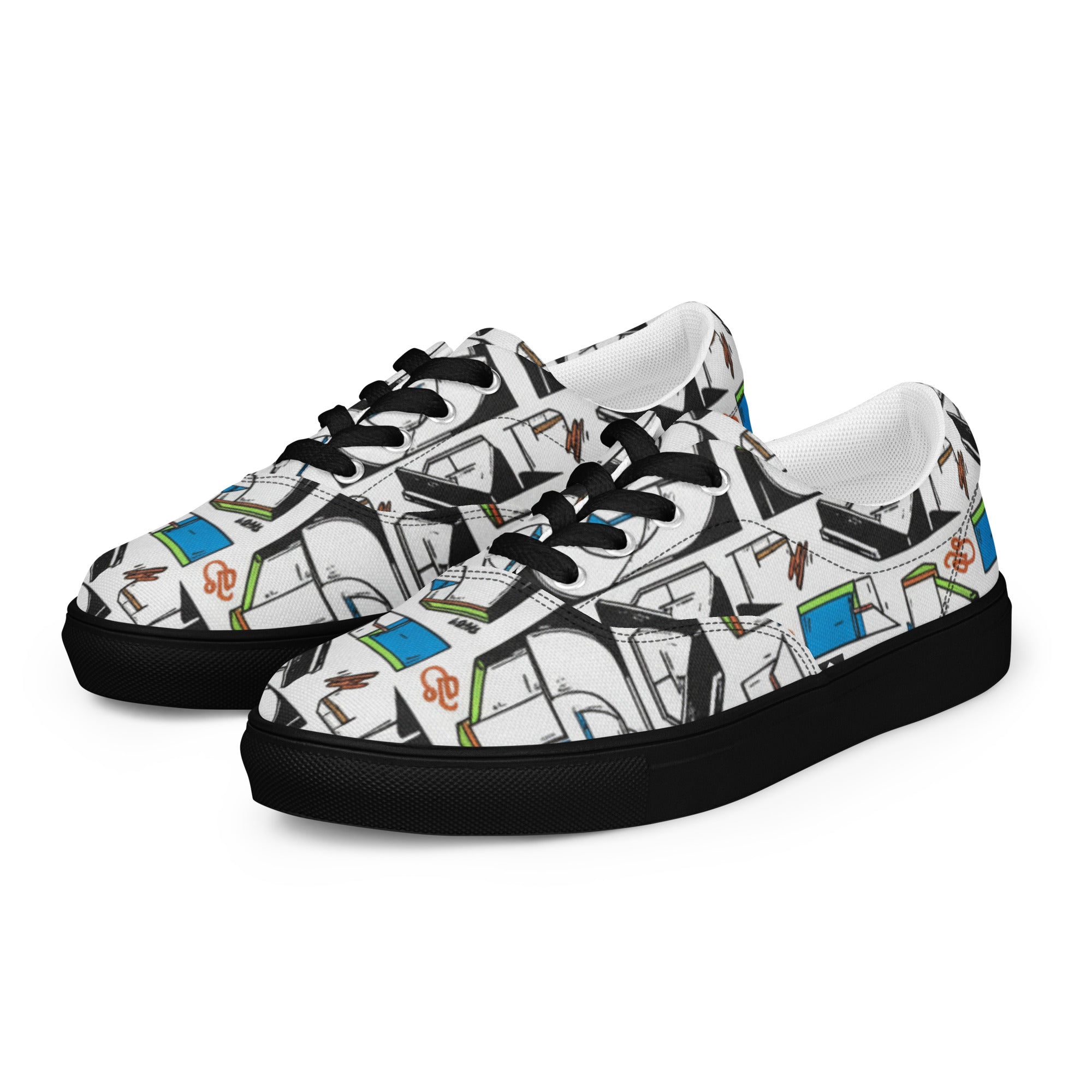 Make a bold statement with these eye-catching canvas sneakers featuring the same retro skateboarding graphics as our iconic bomber jacket. Skate ramps, half-pipes, and vintage skate shop aesthetics cover these classic lace-up sneakers, creating an authentic street culture vibe from head to toe.