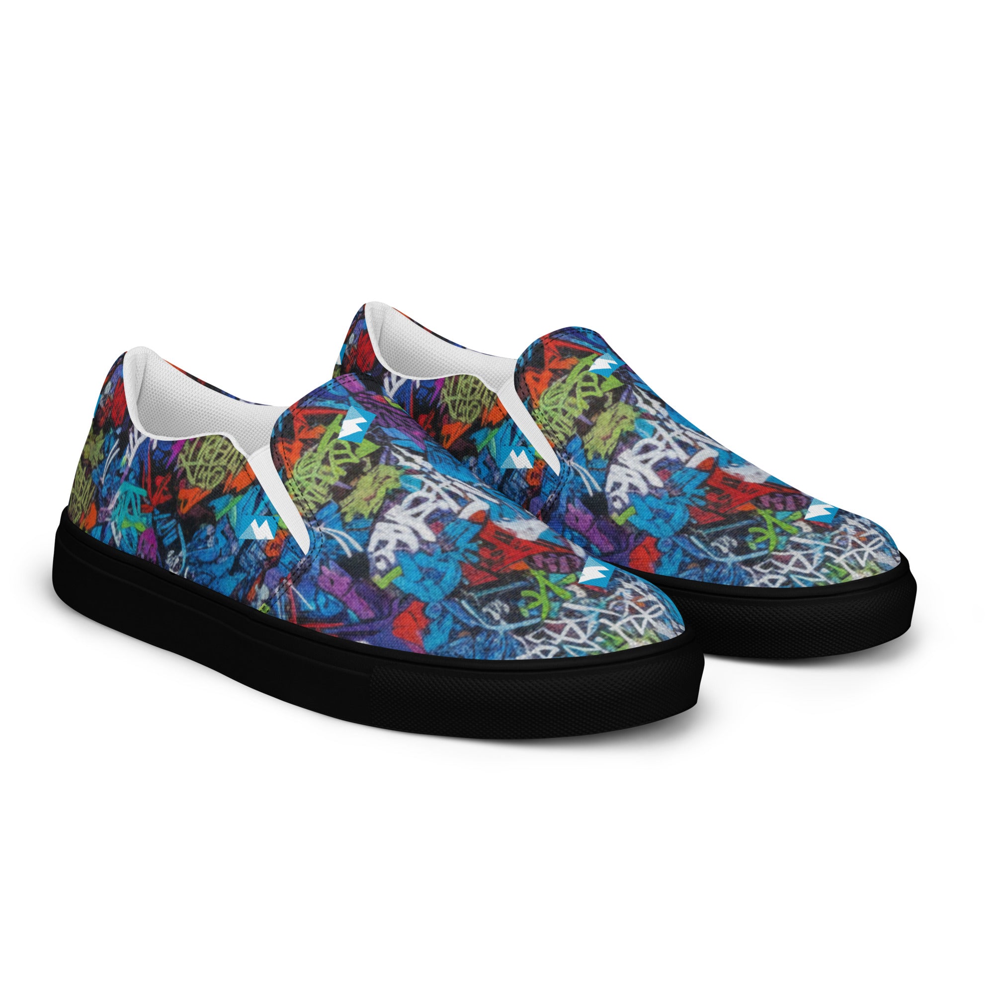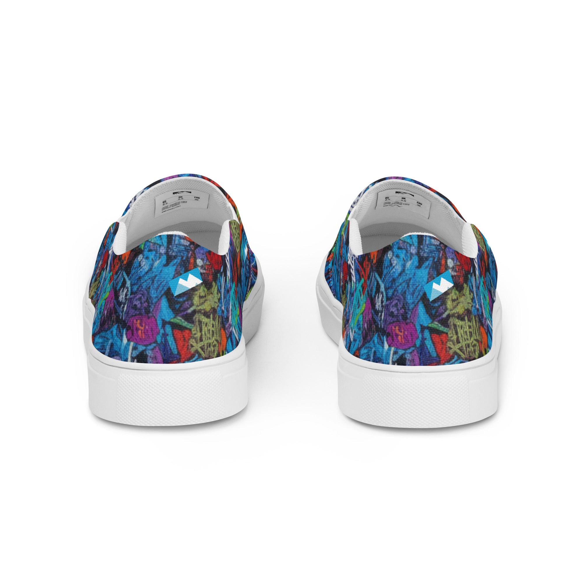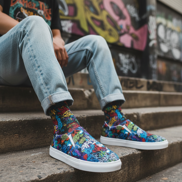 Step into urban style with these vibrant graffiti art slip-on sneakers featuring an explosive collage of street art tags, bold colors, and layered typography. The all-over print showcases electric blues, greens, reds, and purples that capture the raw creativity and energy of city walls.
