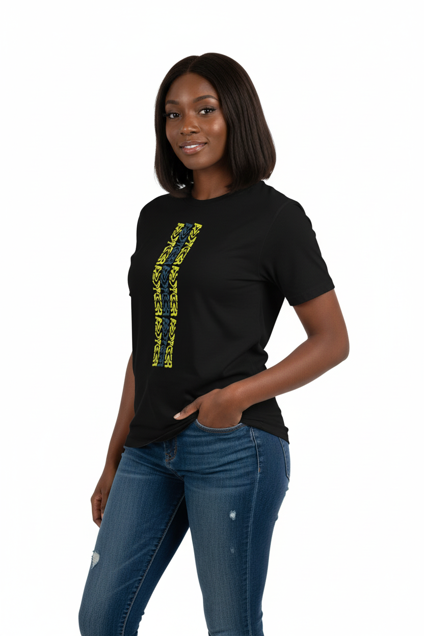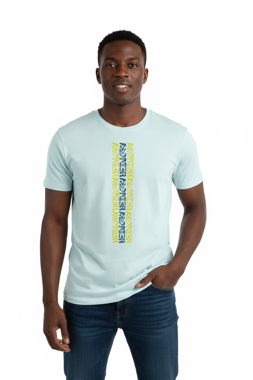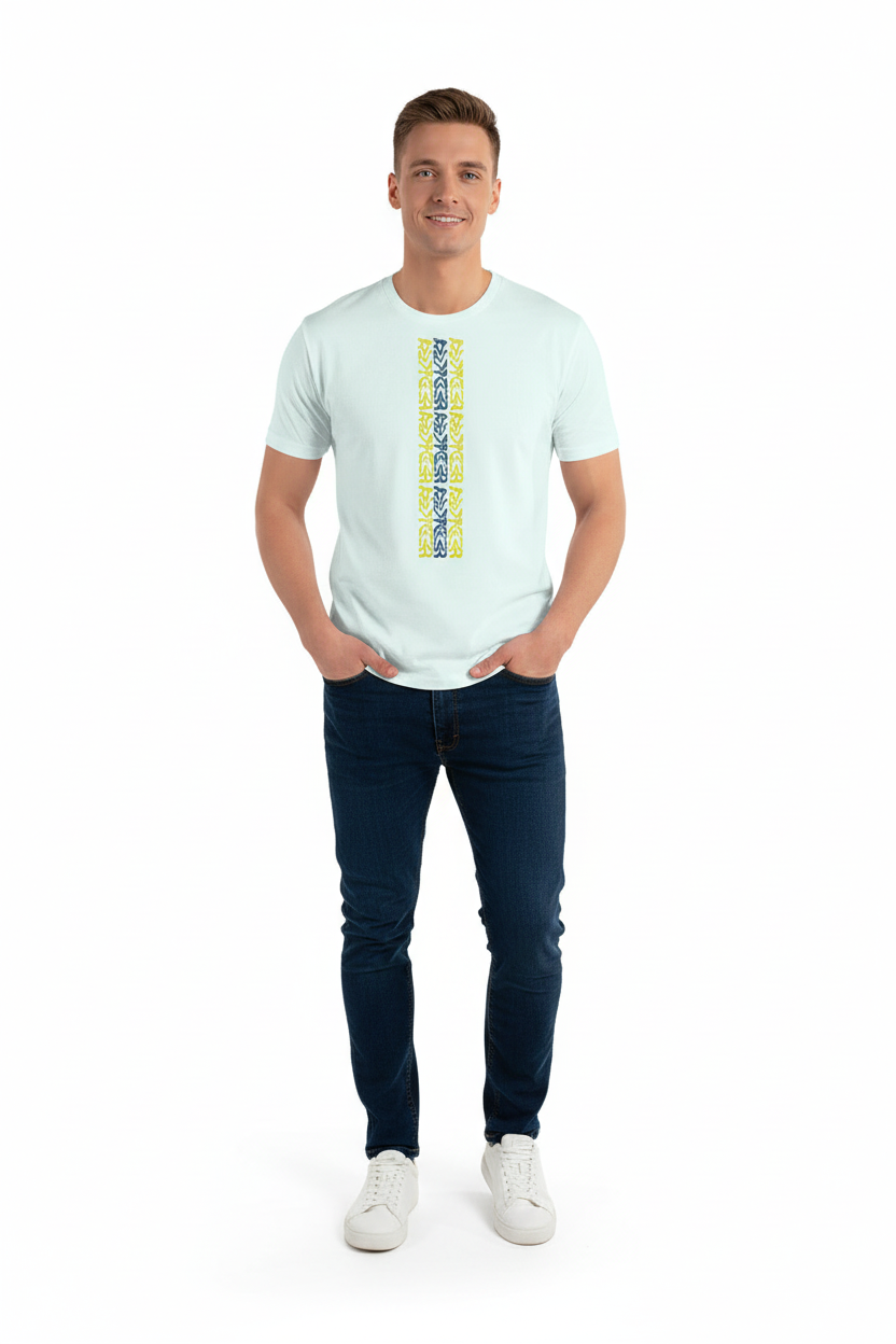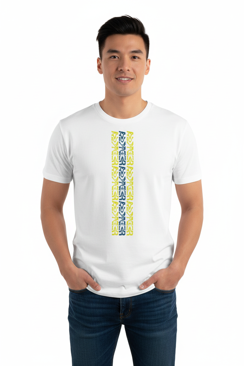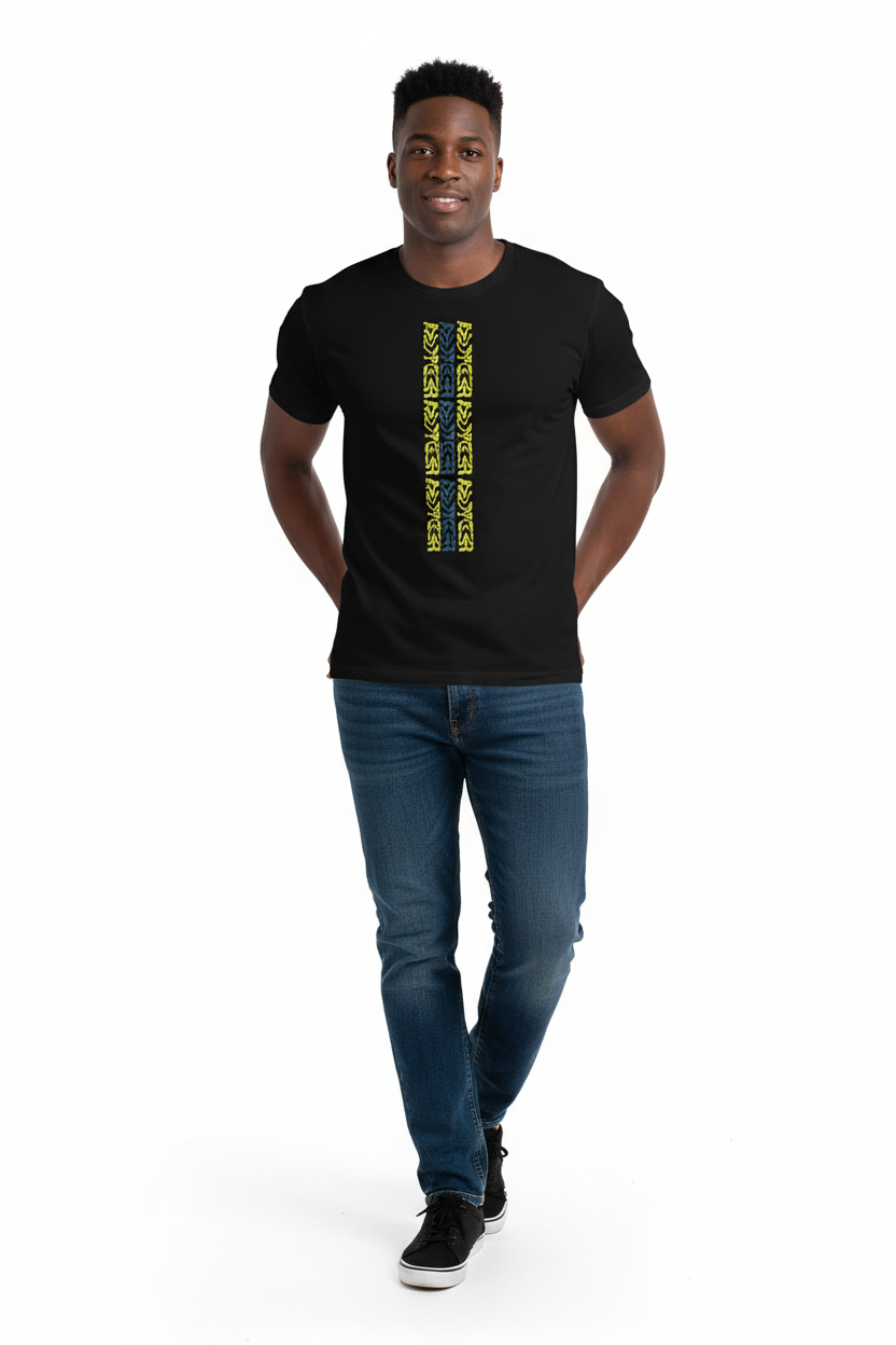 Make a bold statement with the WaterTribe T-shirt, featuring a striking vertical tribal pattern in vibrant yellow and contrasting tones. This eye-catching design brings island vibes and modern style to your everyday wardrobe.