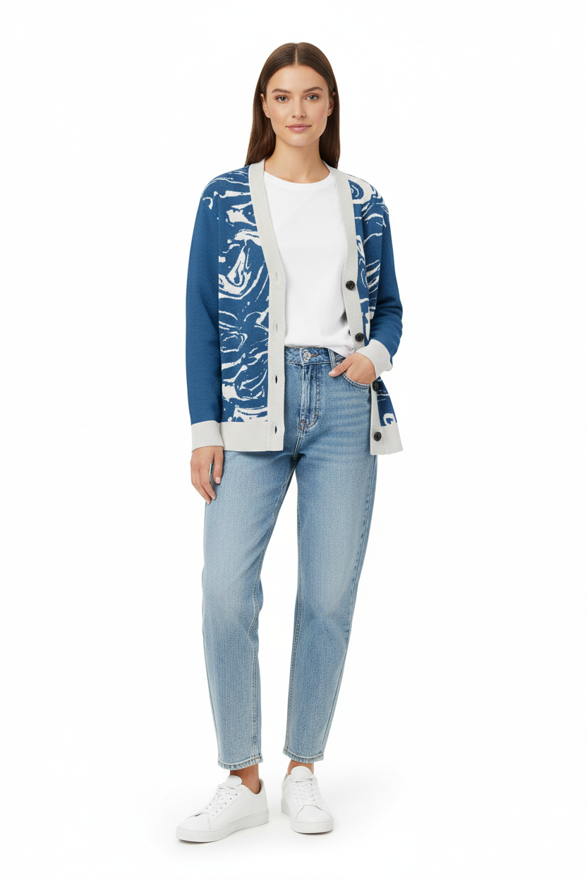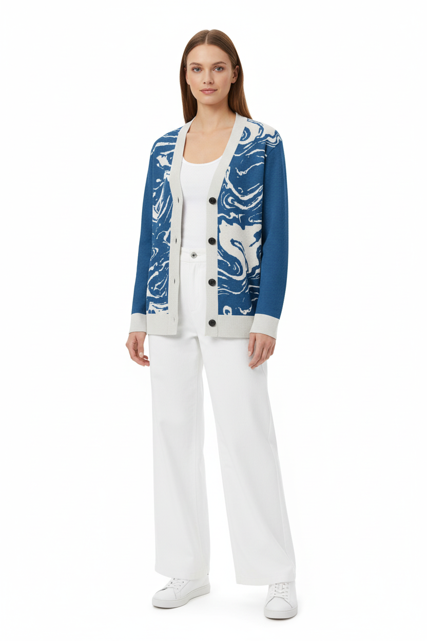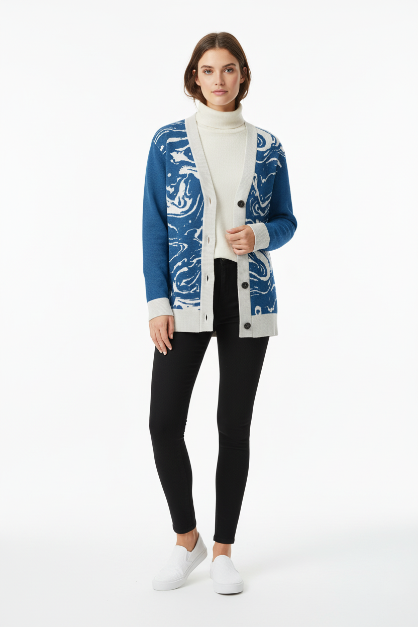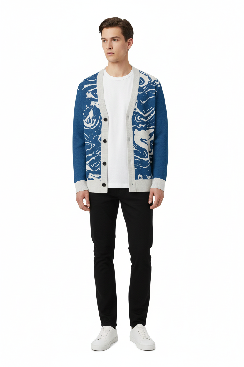 Dive into sophisticated style with the Ocean Marble Knit Cardigan. This premium knitted piece features a mesmerizing blue and white marbled pattern that flows across the garment like ocean waves, creating a unique artistic statement with every wear.