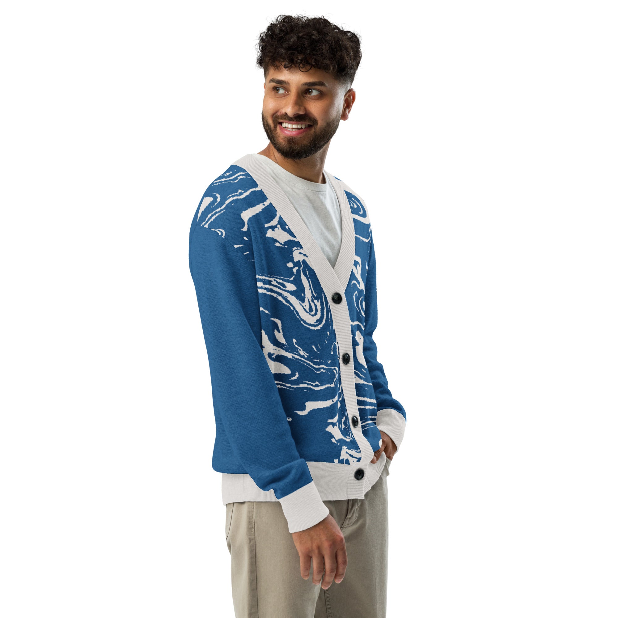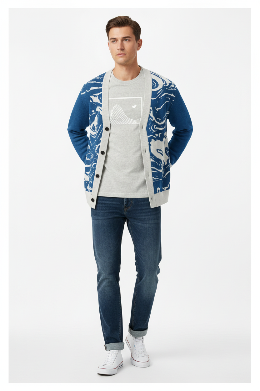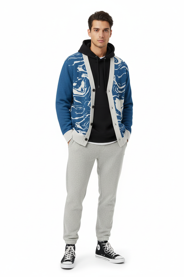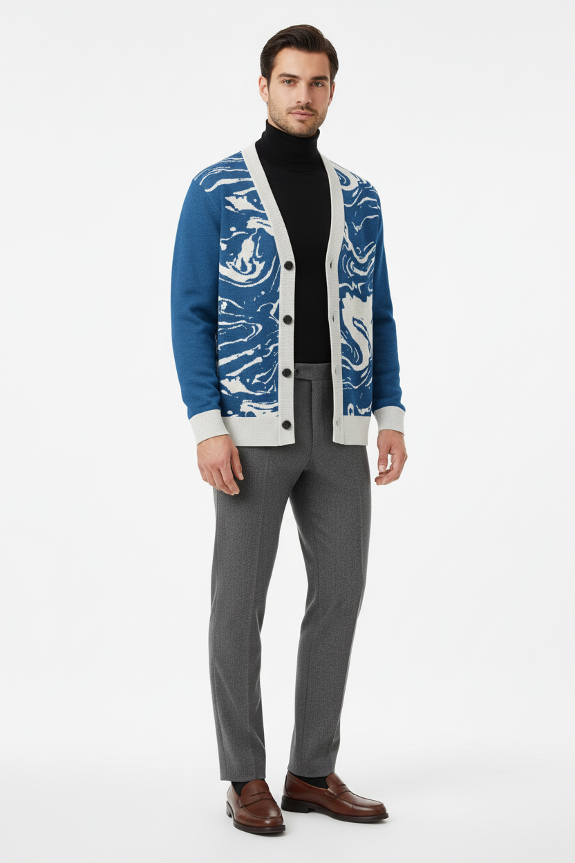 Dive into sophisticated style with the Ocean Marble Knit Cardigan. This premium knitted piece features a mesmerizing blue and white marbled pattern that flows across the garment like ocean waves, creating a unique artistic statement with every wear.